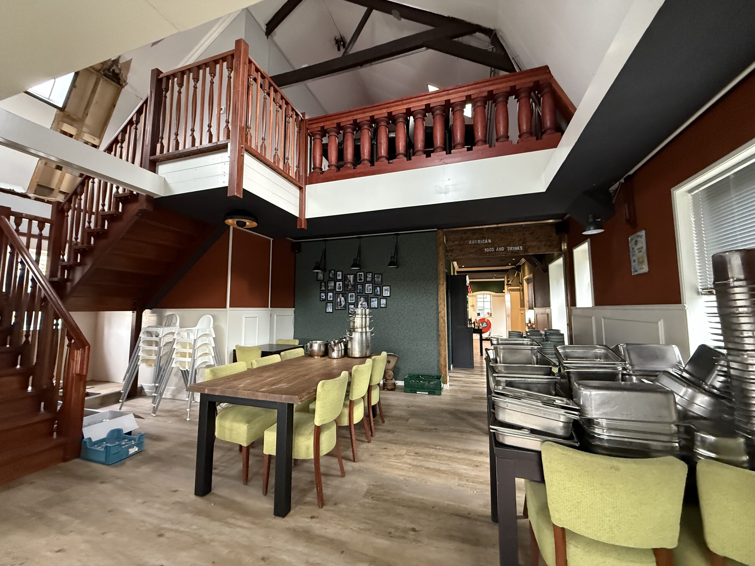 Via een open trap is de verdieping bereikbaar, ingericht als zaal met eigen bar en toiletgroepen; ideaal voor besloten feesten en gezelschappen.