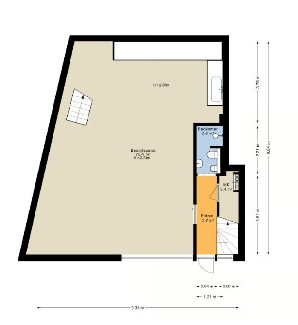 Totale perceel twee are en elf centiare, bedrijfshal 70,4 m, toilet 2,56 m. trap 3,38 m Hal 3.77m, kantoor 44,3 mtr magazijn 41,5 TOTAAL bedrijfspand 170 mtr en buitenterrein 125 mtr.