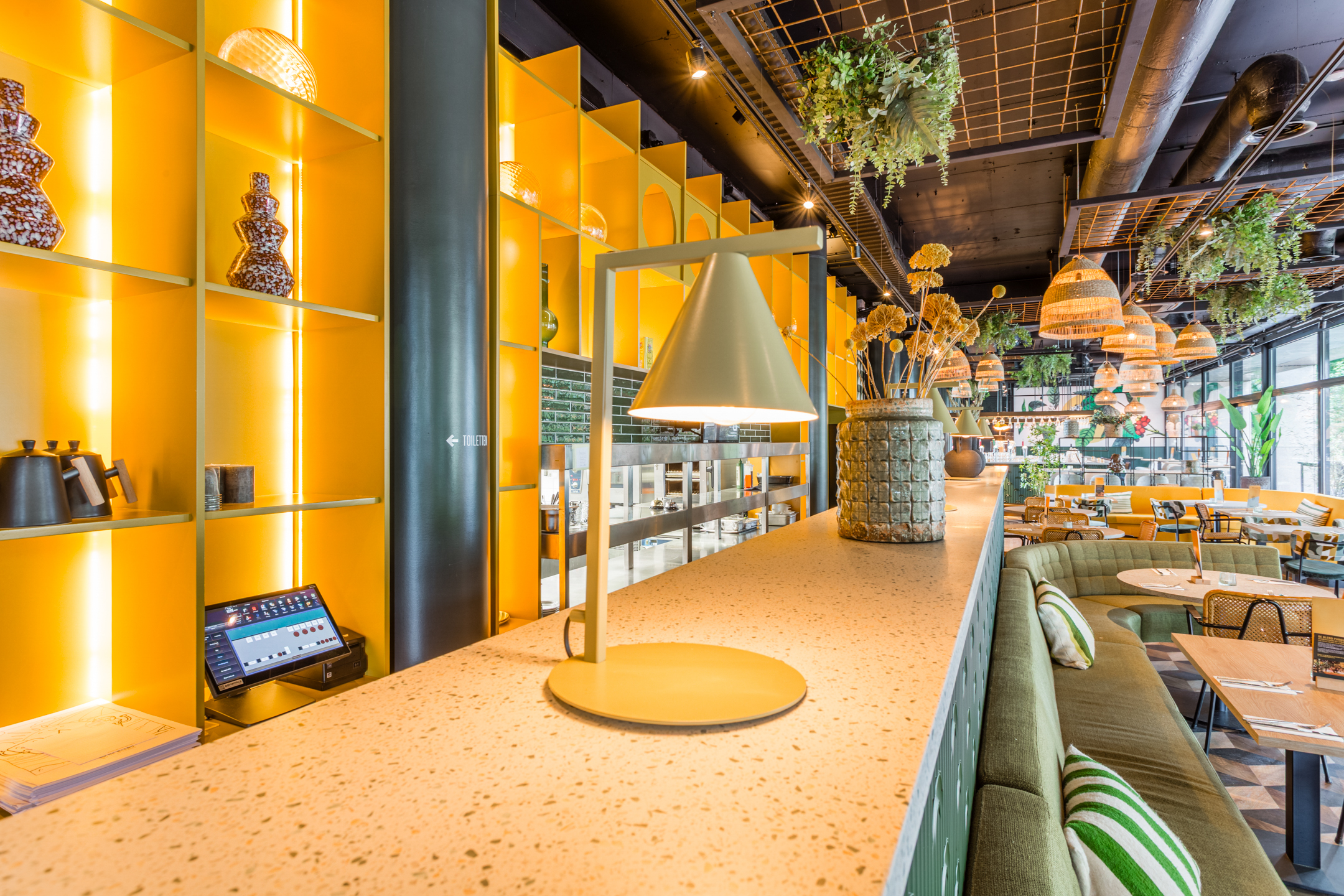 zaak binnen met links en rechts diverse zitplaatsen en een bar, achterin het pand bevinden zich de keuken, opslag en toiletgroep.