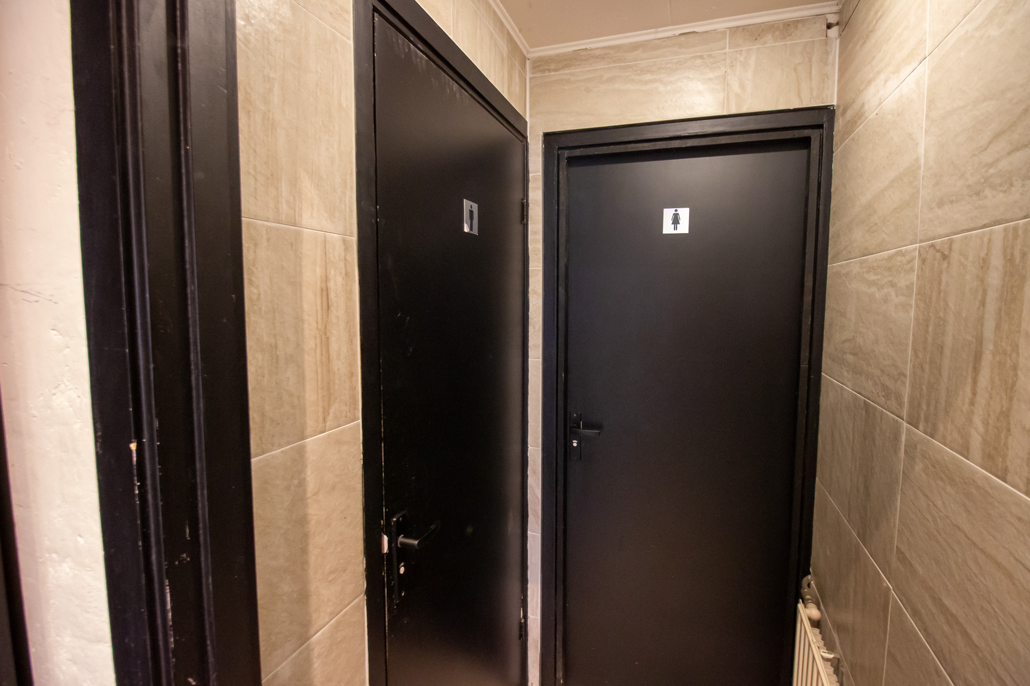 Aan de voorzijde, langs de ramen, zijn zitplaatsen gesitueerd. Aan de linkerzijde bevindt zich de bar, uitgerust met onder andere een tapkraan, koffiezetapparaat, spoelbak en werkruimte. Zowel vóór als achter de bar zijn tafels geplaatst, wat zorgt voor een efficiënte indeling.