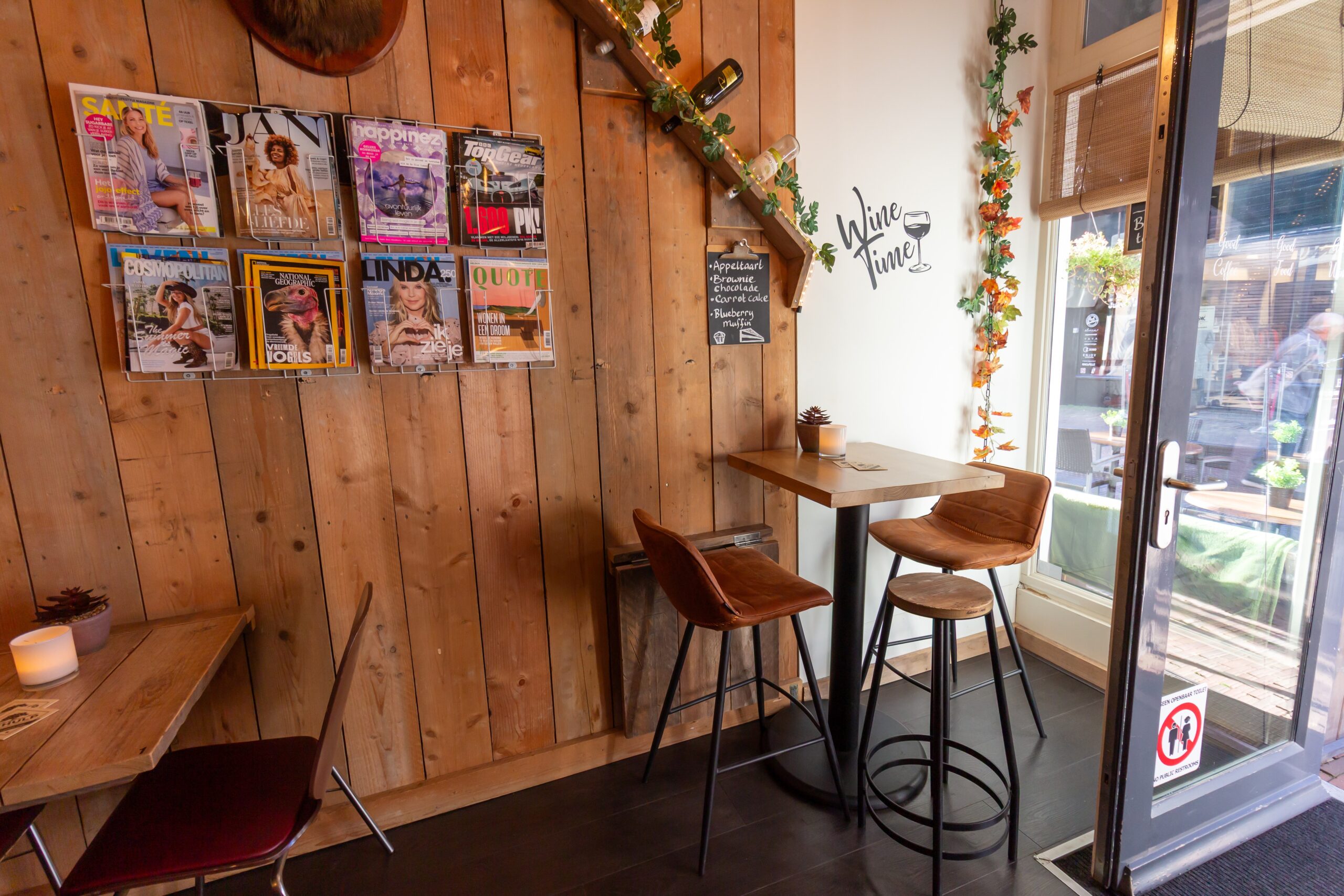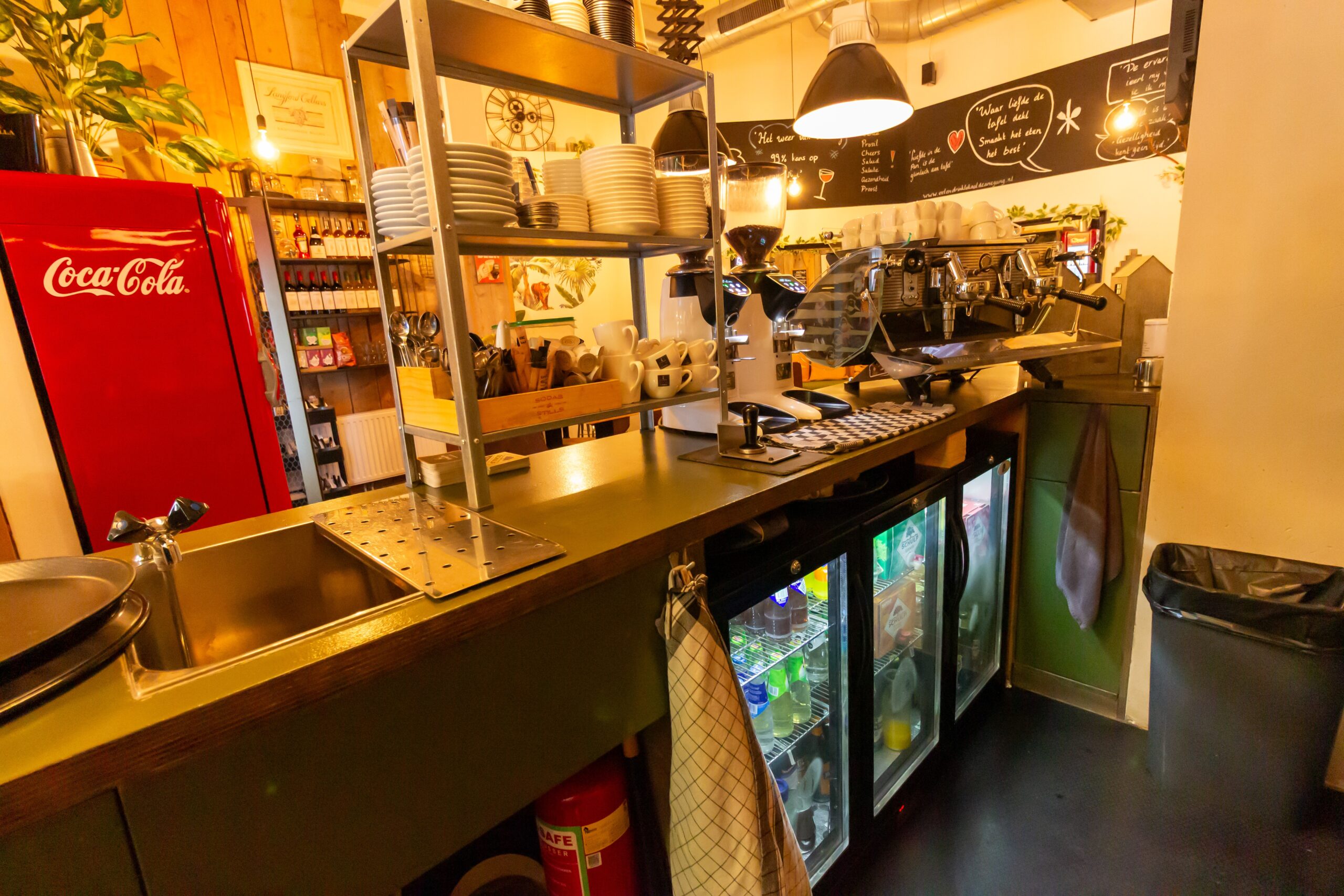 De bar en open keuken bevinden zich op een centraal punt midden in de ruimte aan de rechterzijde. Letterlijk het hart van het bedrijf. Hier wordt niet alleen koffie gezet en wijn geschonken, maar ook gezellig gepraat met vaste gasten en voorbijgangers. De zaak vormt een natuurlijke ontmoetingsplek waar gasten even kunnen aanschuiven voor een drankje of een praatje.