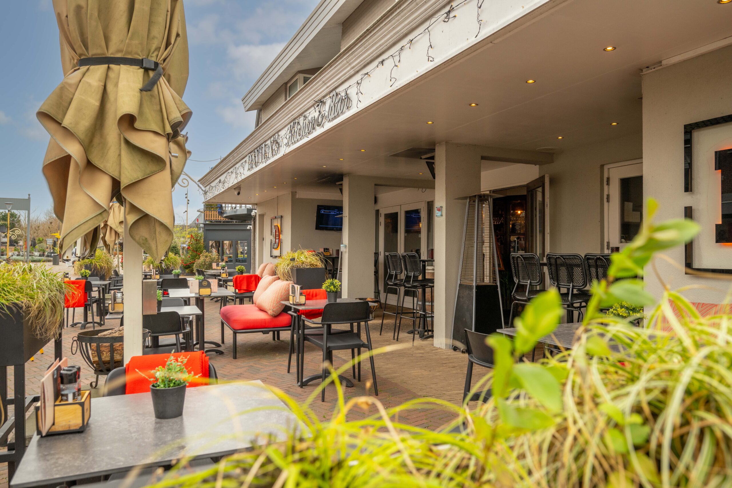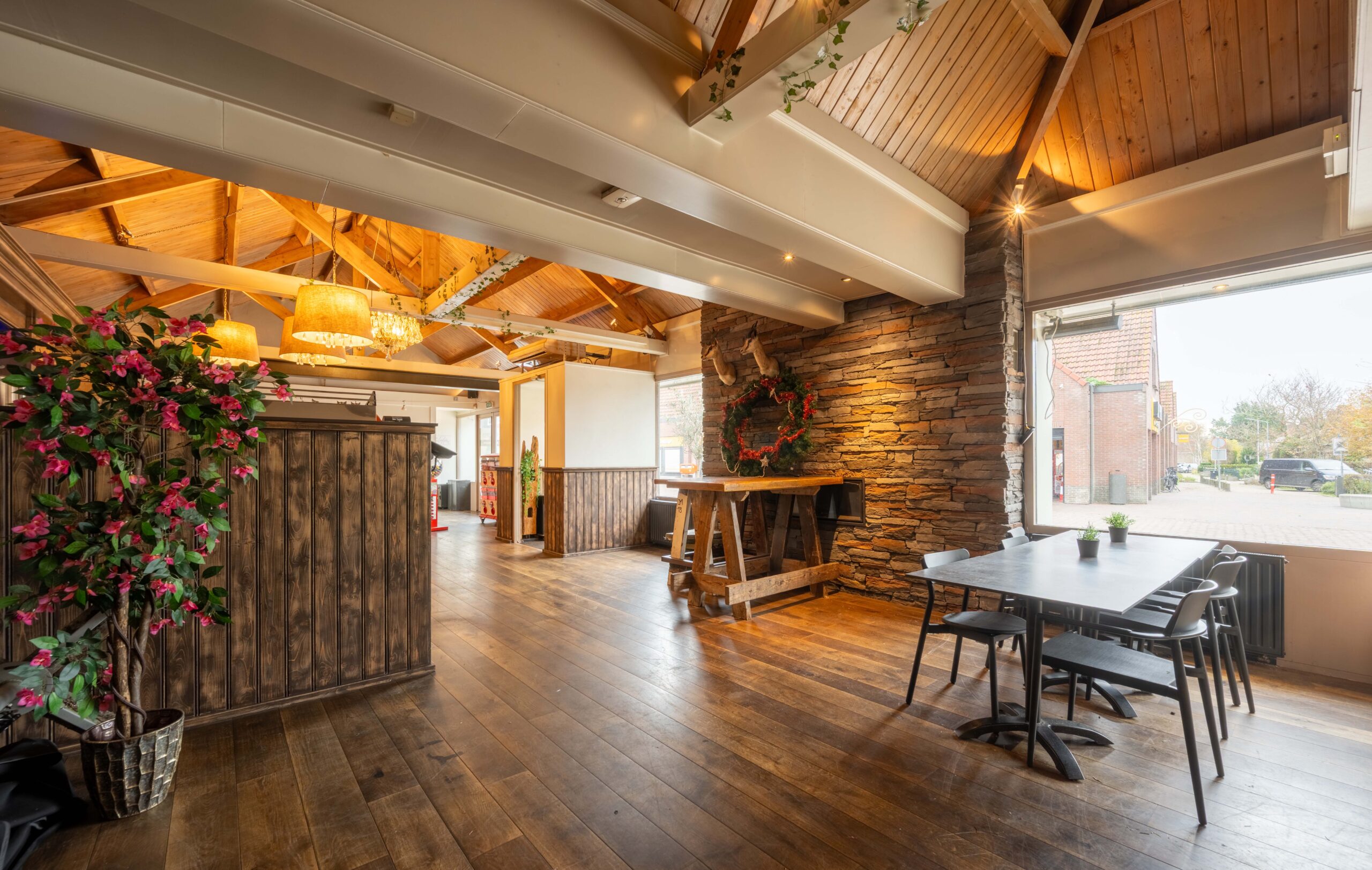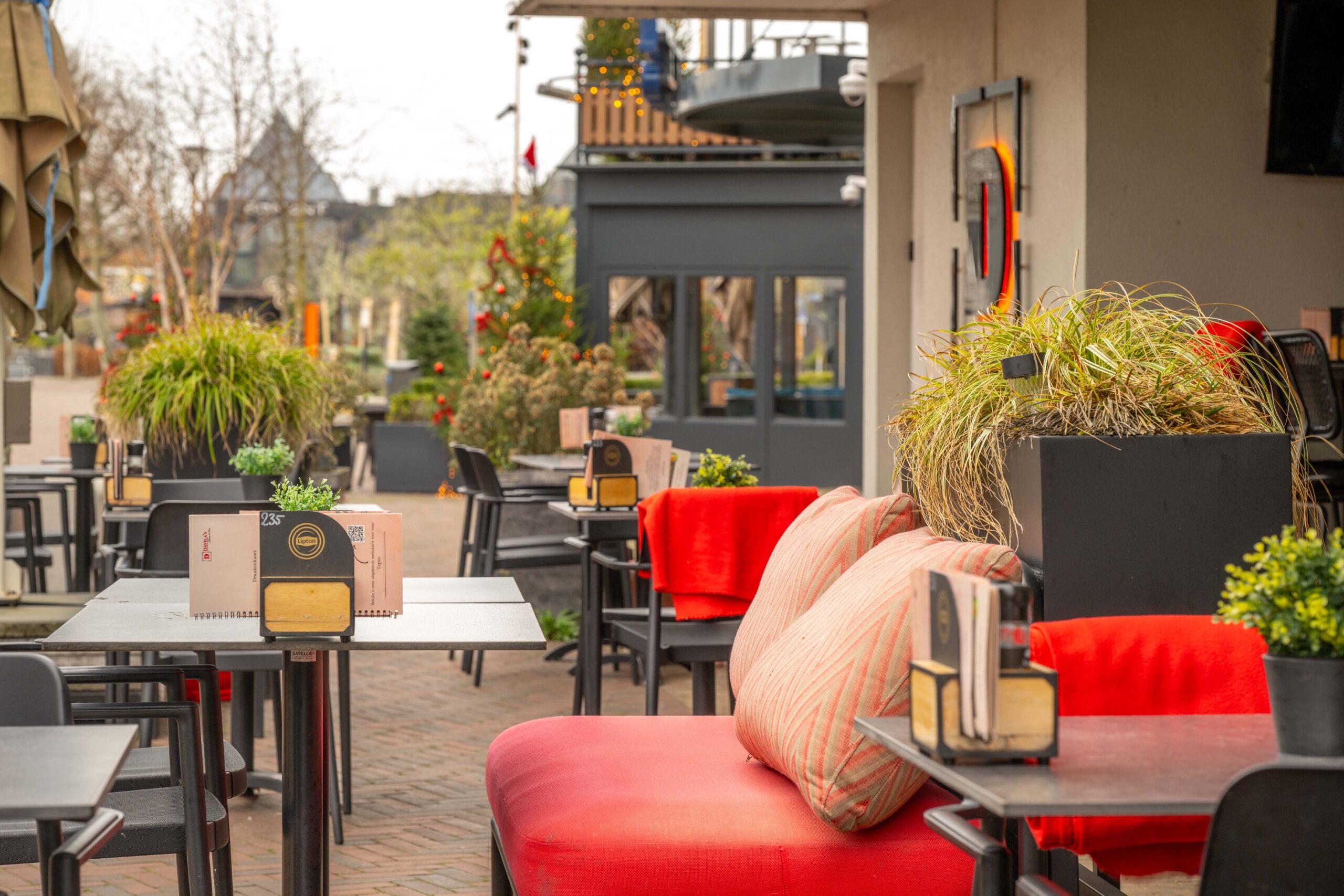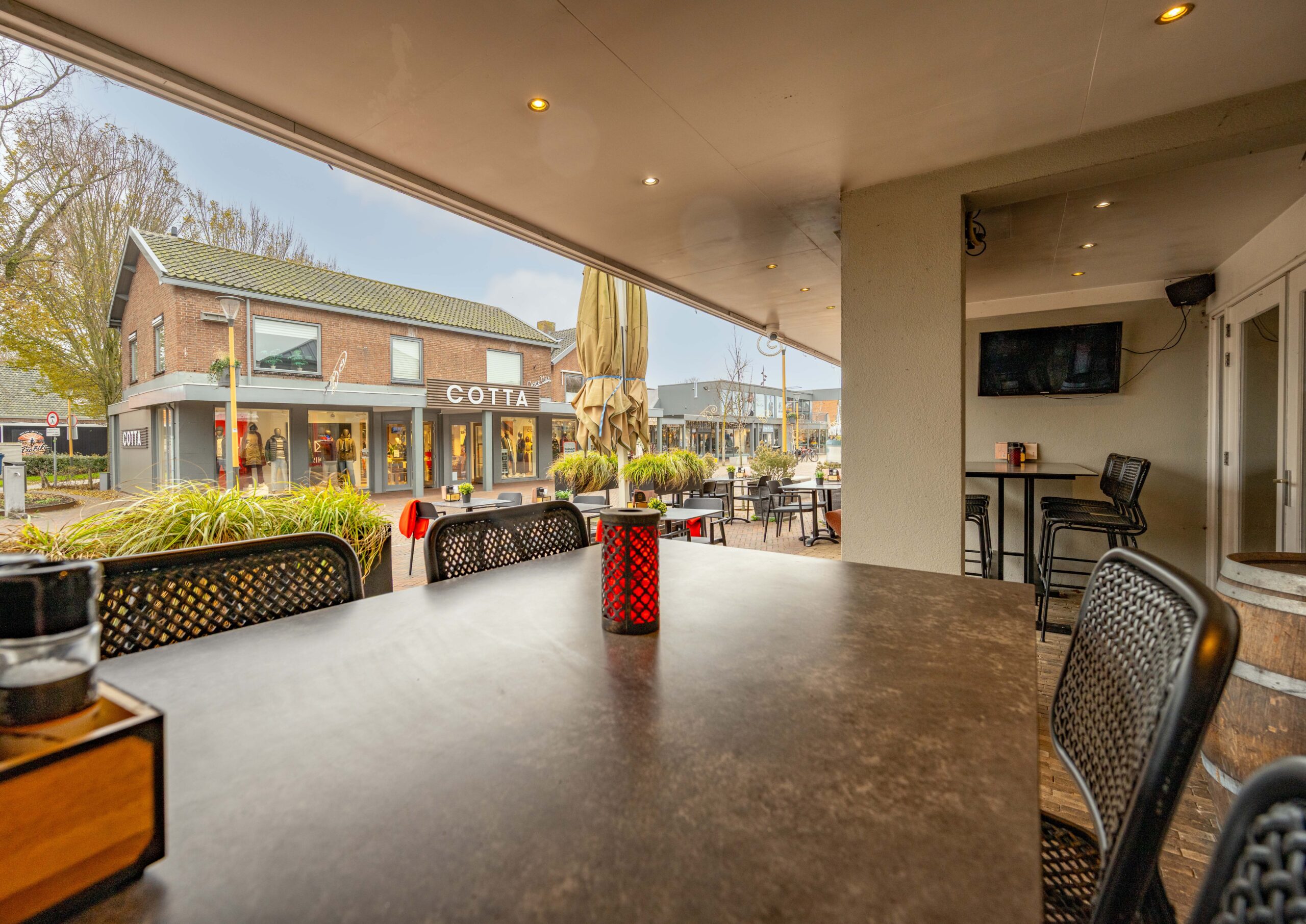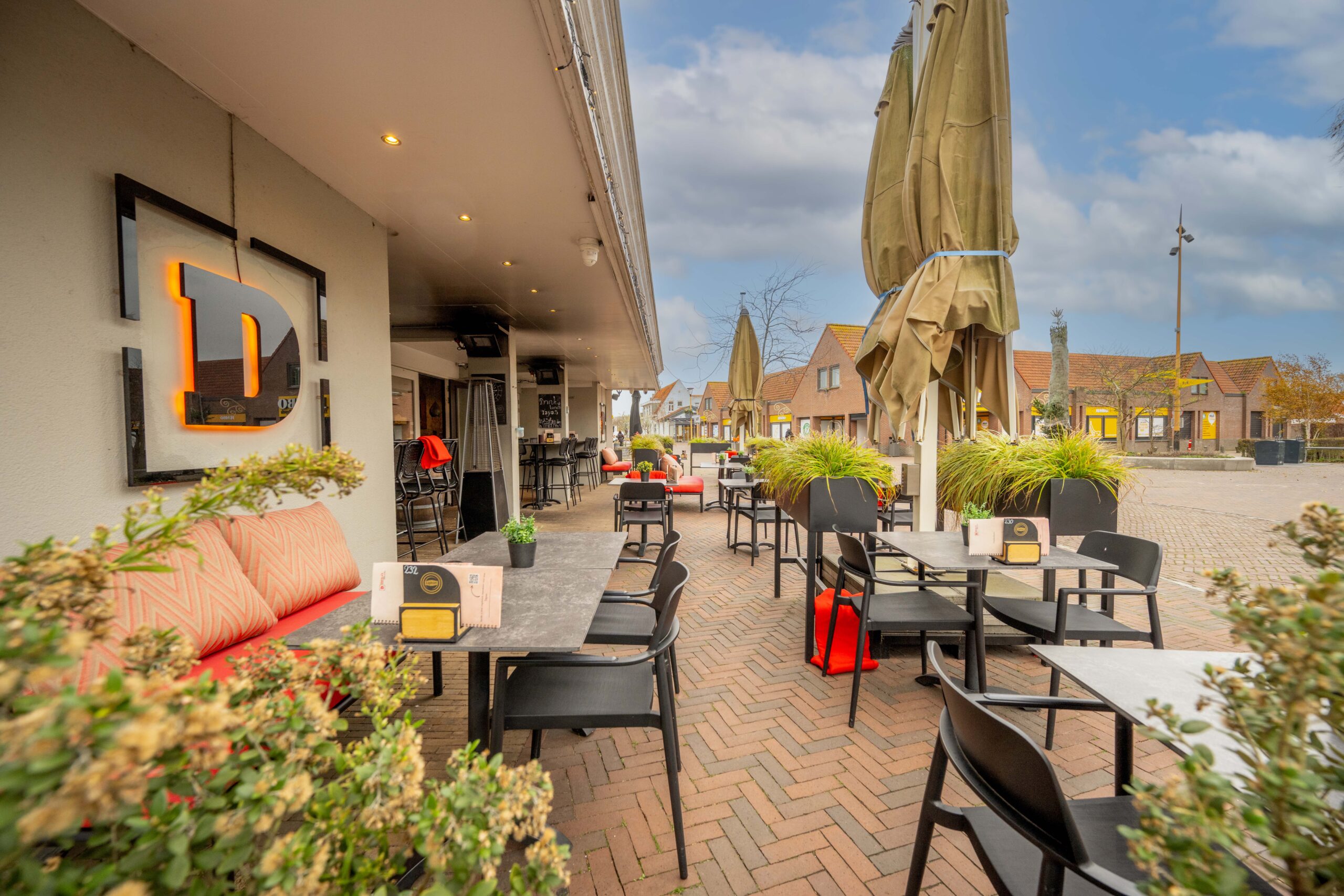 Het grote, zonnige terras springt meteen in het oog en biedt plek aan ruim 100 gasten. Vanaf de ochtend tot eind van de middag genieten bezoekers hier van de zon, wat het terras extra aantrekkelijk maakt. En zoals vaak in de horeca: volle terrassen trekken vanzelf nieuwe gasten aan. Het meubilair is recent vernieuwd en bestaat uit loungebanken, ronde en vierkante tafels en stijlvolle zwarte stoelen. Voor comfort zijn er twee dubbele zweefparasols met heaters, en aan de gevel hangen zowel gas- als elektrische heaters, zodat gasten ook op koelere dagen comfortabel kunnen zitten.