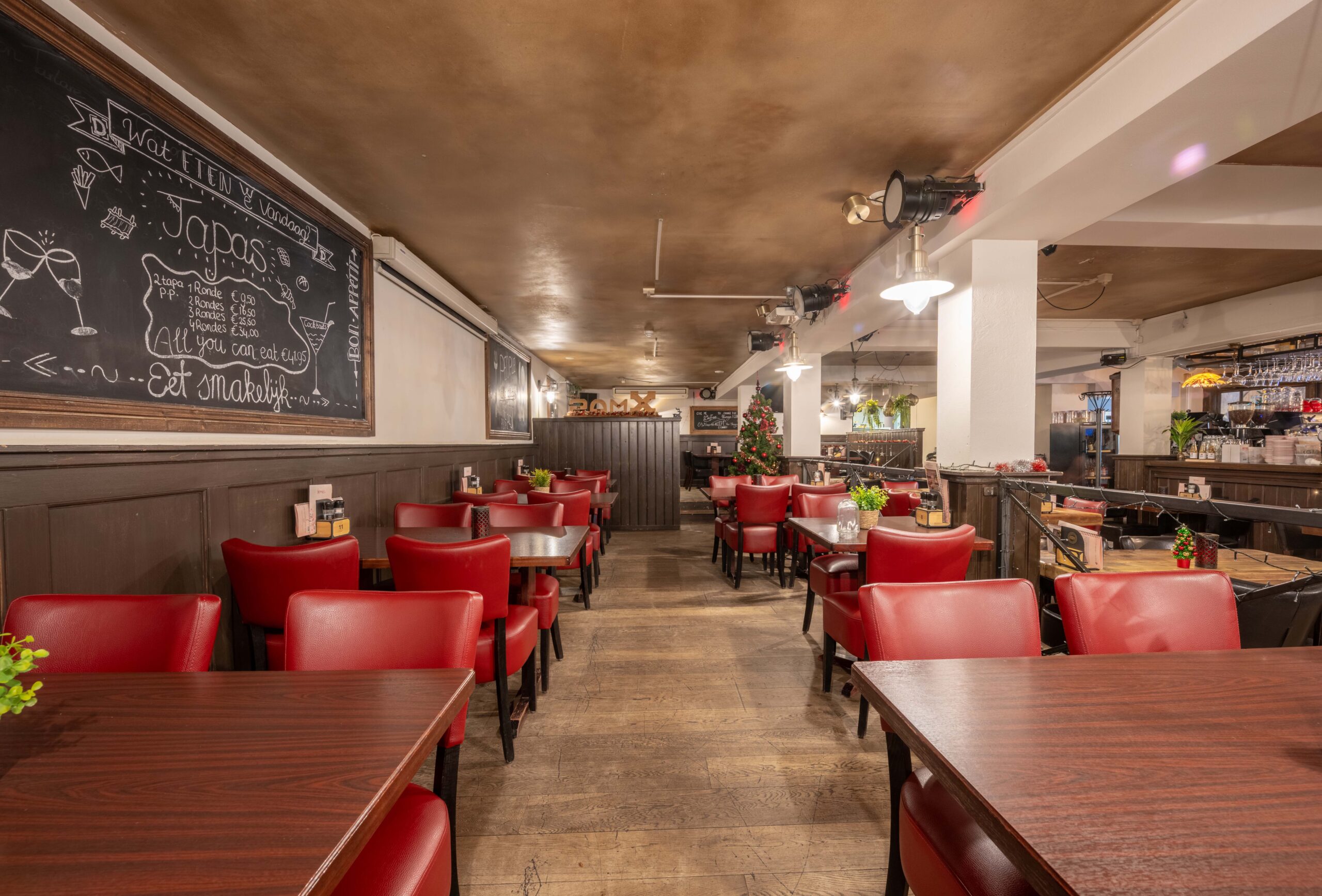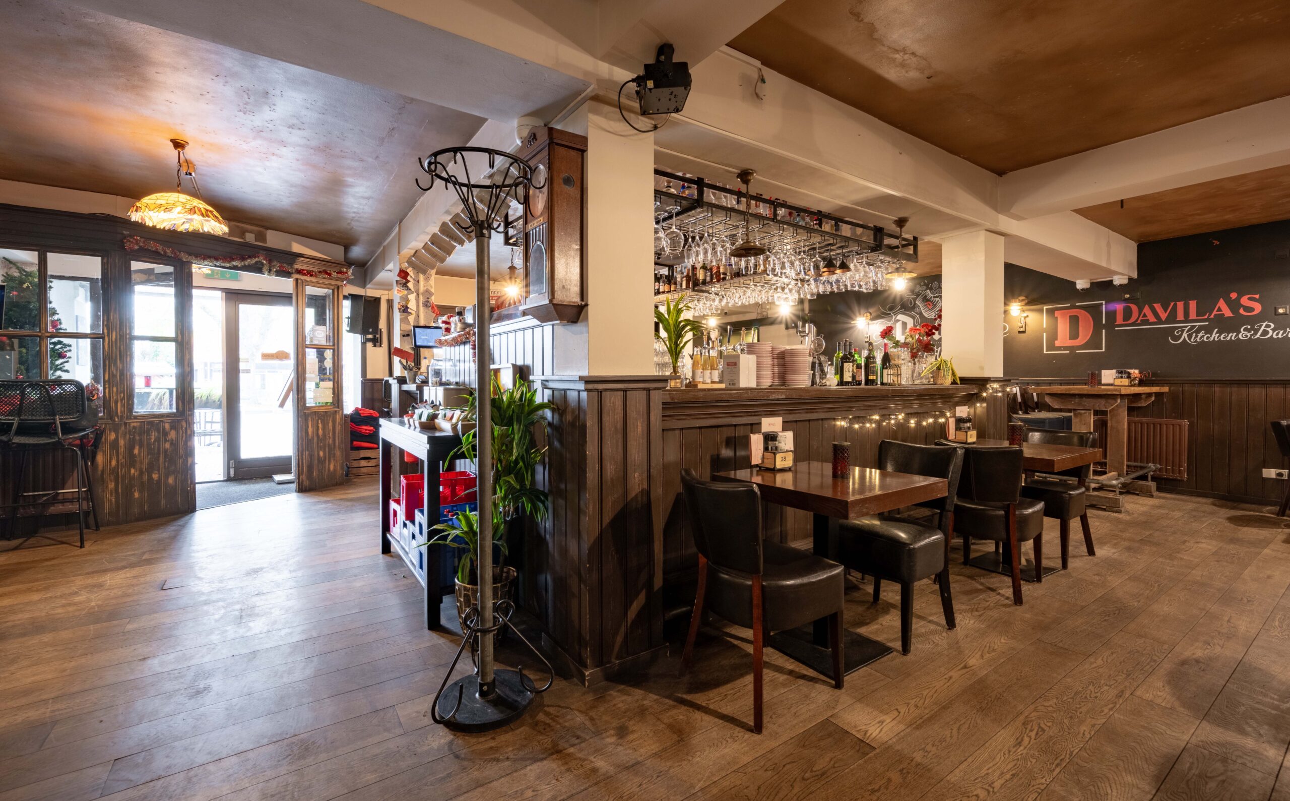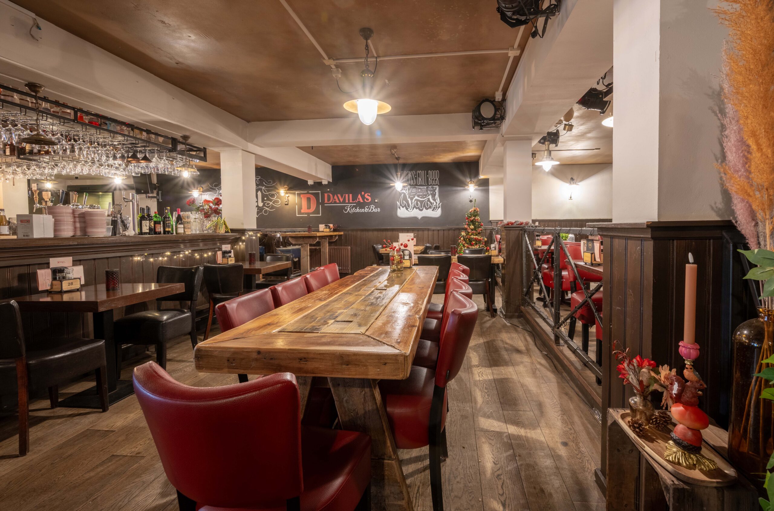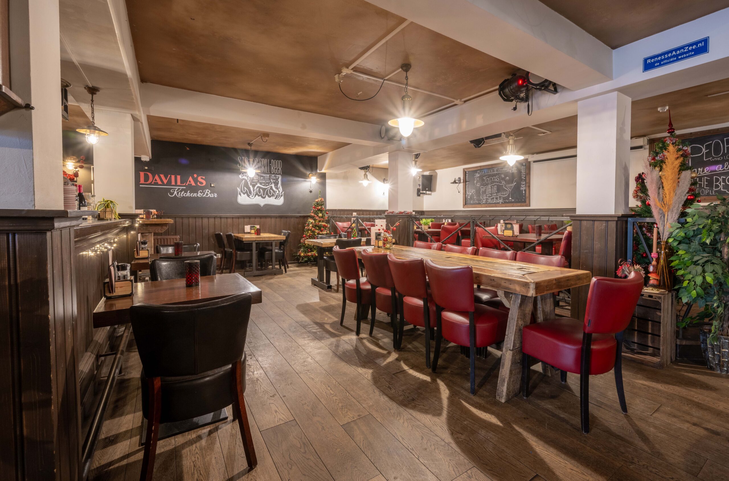 Het pand bestaat eigenlijk uit twee afzonderlijke panden, die momenteel met een smalle gang met elkaar verbonden zijn. Afhankelijk van de wensen van de toekomstige eigenaar(s) kan deze doorgang eenvoudig worden afgesloten. In het linkerpand bevindt zich Davila’s Bar & Kitchen. Bij binnenkomst stap je via een kleine entreehal een gezellige, sfeervolle ruimte binnen die doet denken aan een bruin café of een knusse kroeg. Een stoere zwarte bar, houten lambrisering, hoge tafels en rode en zwarte stoelen zorgen voor een ongedwongen en huiselijke sfeer, waar gasten zich direct welkom voelen. De ruimte biedt plek aan ongeveer 90 gasten. Links bij binnenkomst valt de grote bar op. Hoewel er regelmatig gasten aan plaatsnemen, functioneert deze vooral als uitgiftebar voor dranken. De bar is volledig uitgerust met diverse tapinstallaties, waaronder een Duvel-tap en een 5-tapskraan voor speciaalbieren. Daarnaast zijn er meerdere bier- en friskoelingen, een osmose-glaswasmachine, een nieuwe Lattiz-melkmachine, een koffiemachine en een bonenmaler aanwezig, waardoor de zaak direct volledig operationeel is. In het restaurant is verder een gescheiden toiletgroep voor mannen en vrouwen.
