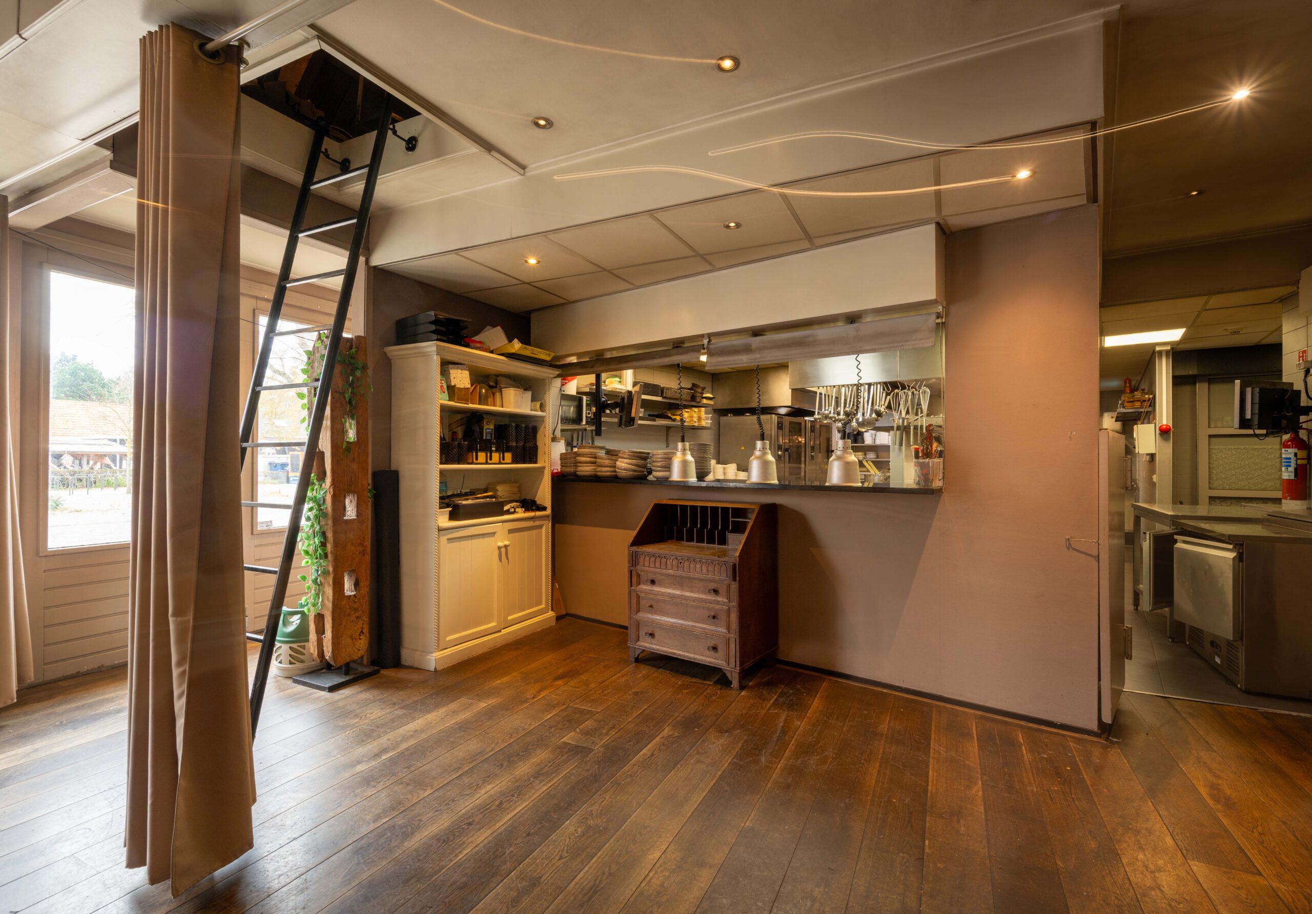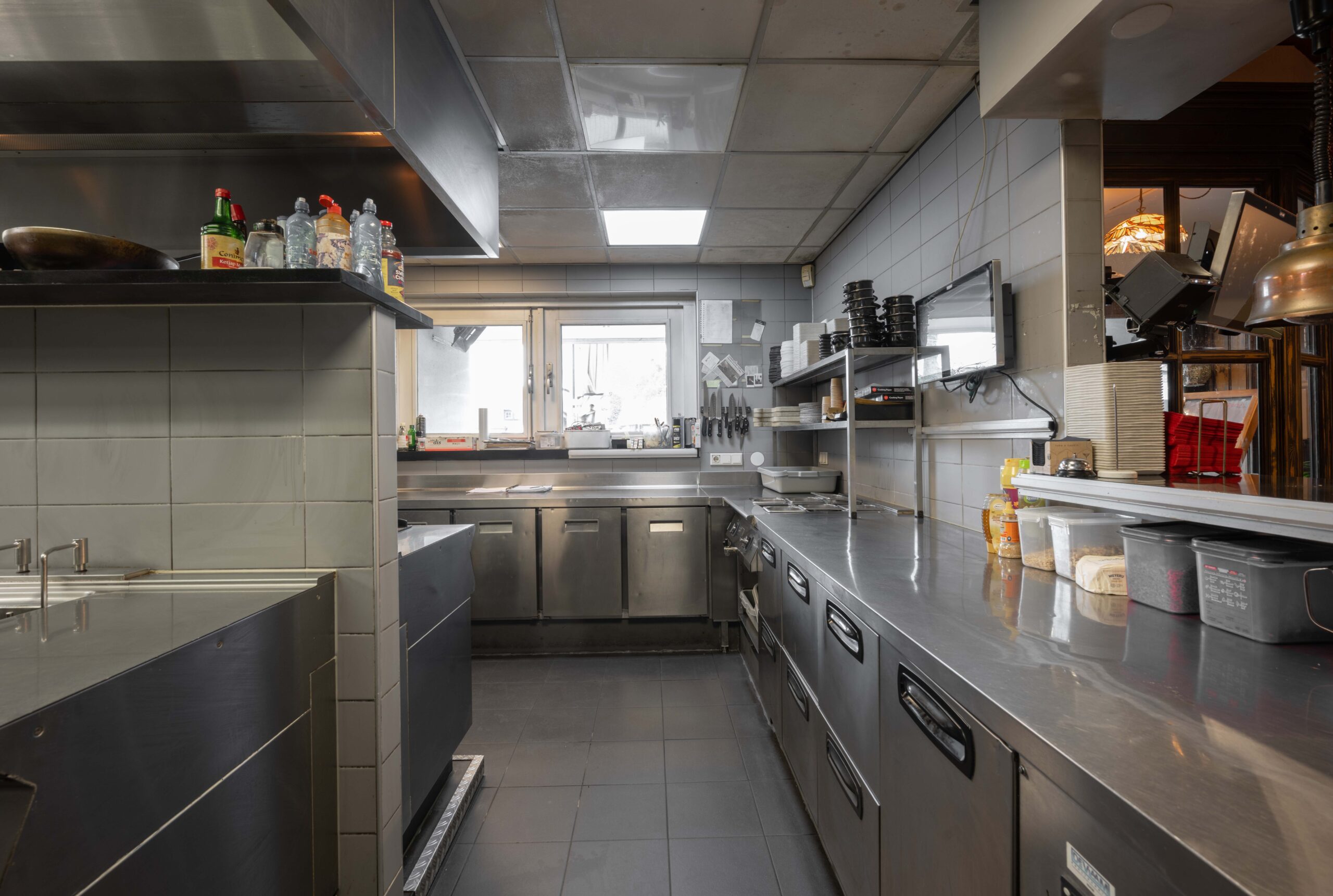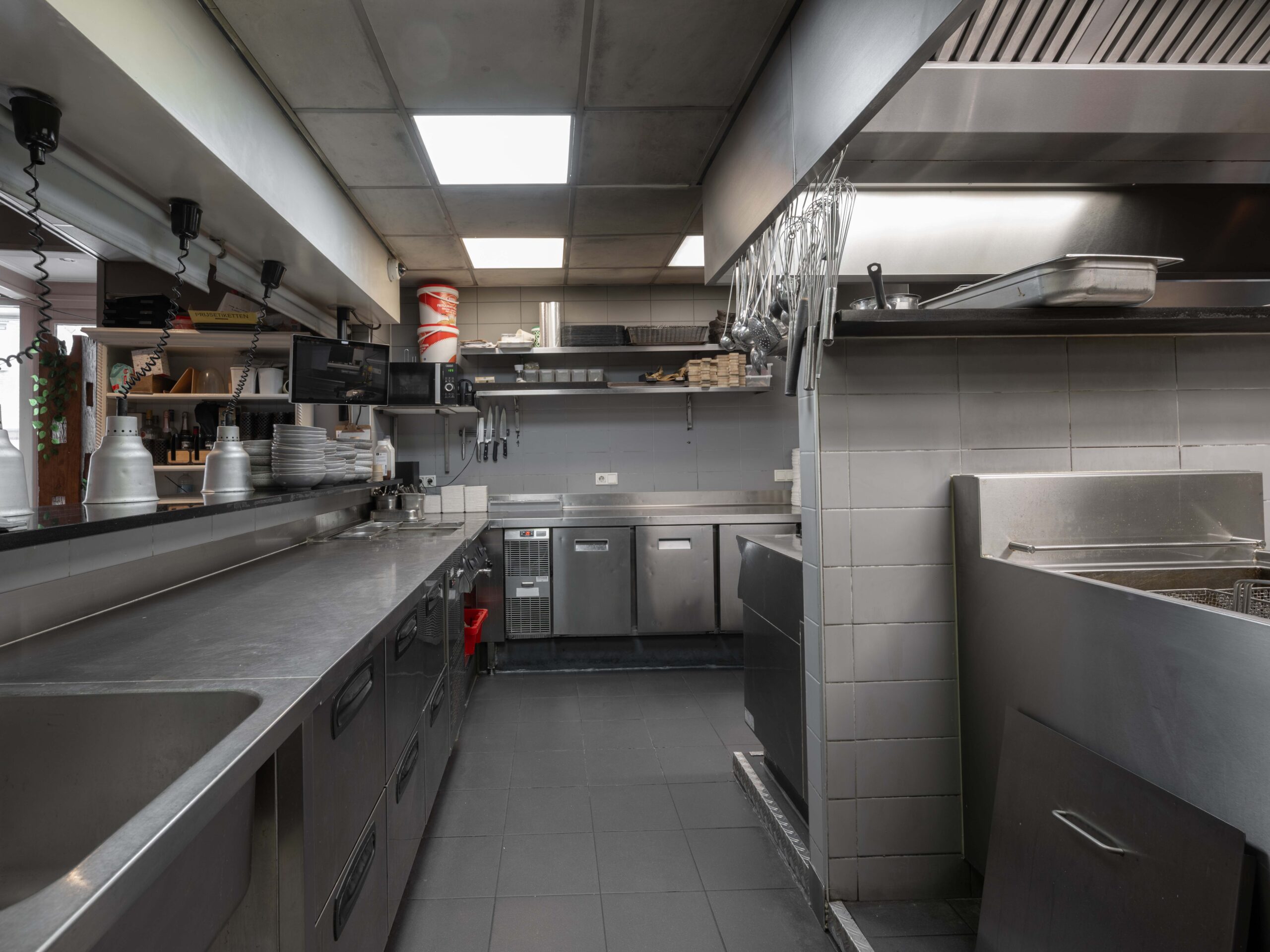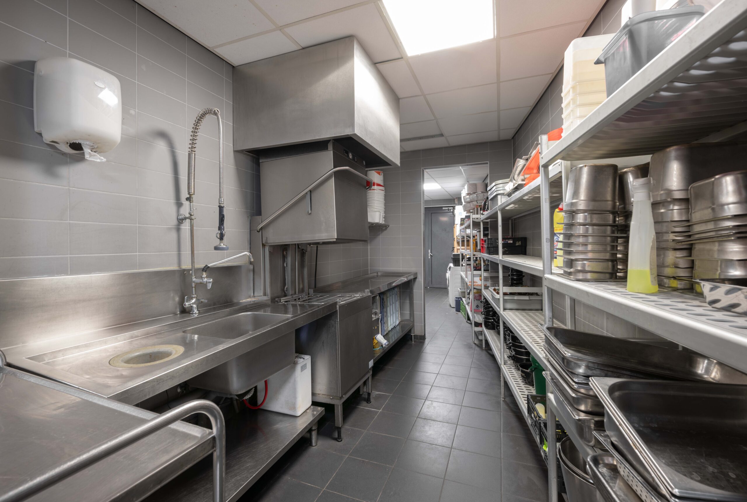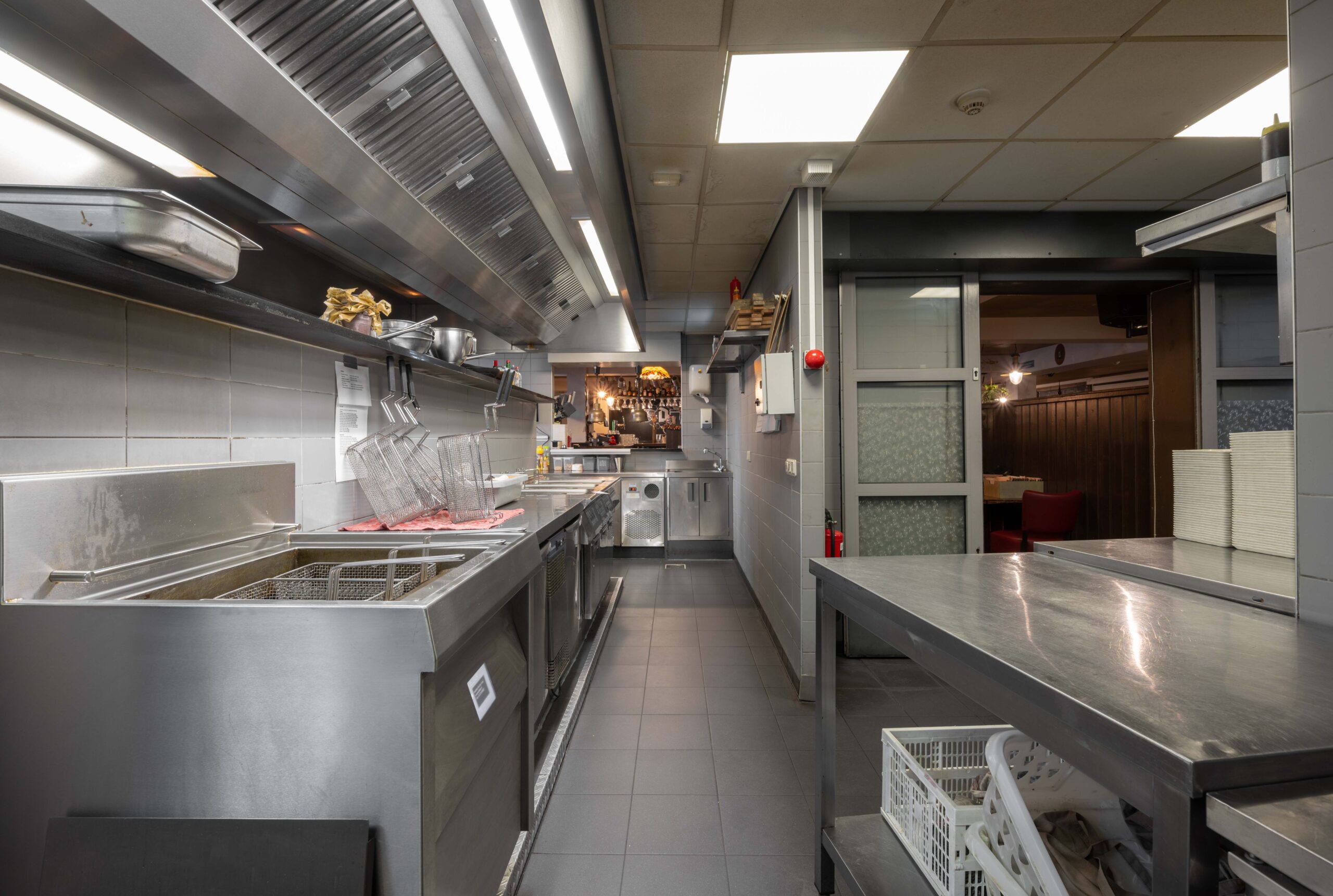De keuken bevindt zich tegenover de bar en is voorzien van een uitgifteluik om bestellingen efficiënt door te geven. Ruim opgezet, biedt de keuken voldoende werkruimte voor een team van zes koks. De apparatuur is compleet en van professionele kwaliteit, met onder andere een bakplaat, drie elektrische friteuses, één grote friteuse, twee Rational-stoomovens, twee kookeilanden met vier gaspitten, koelwerkbanken en lades. In het gangetje naar achteren staan diverse koelkasten, en de verdere opslagruimte bevindt zich in de lange achtergang. Hier vind je de voorbereidende keuken, meerdere koelcellen, de koeling voor 2x 1.000 liter bier en een vriescel, evenals de spoelkeuken met een professionele doorschuif-afwasmachine. Zo is het pand volledig ingericht om direct een drukbezochte horecazaak te kunnen draaien.