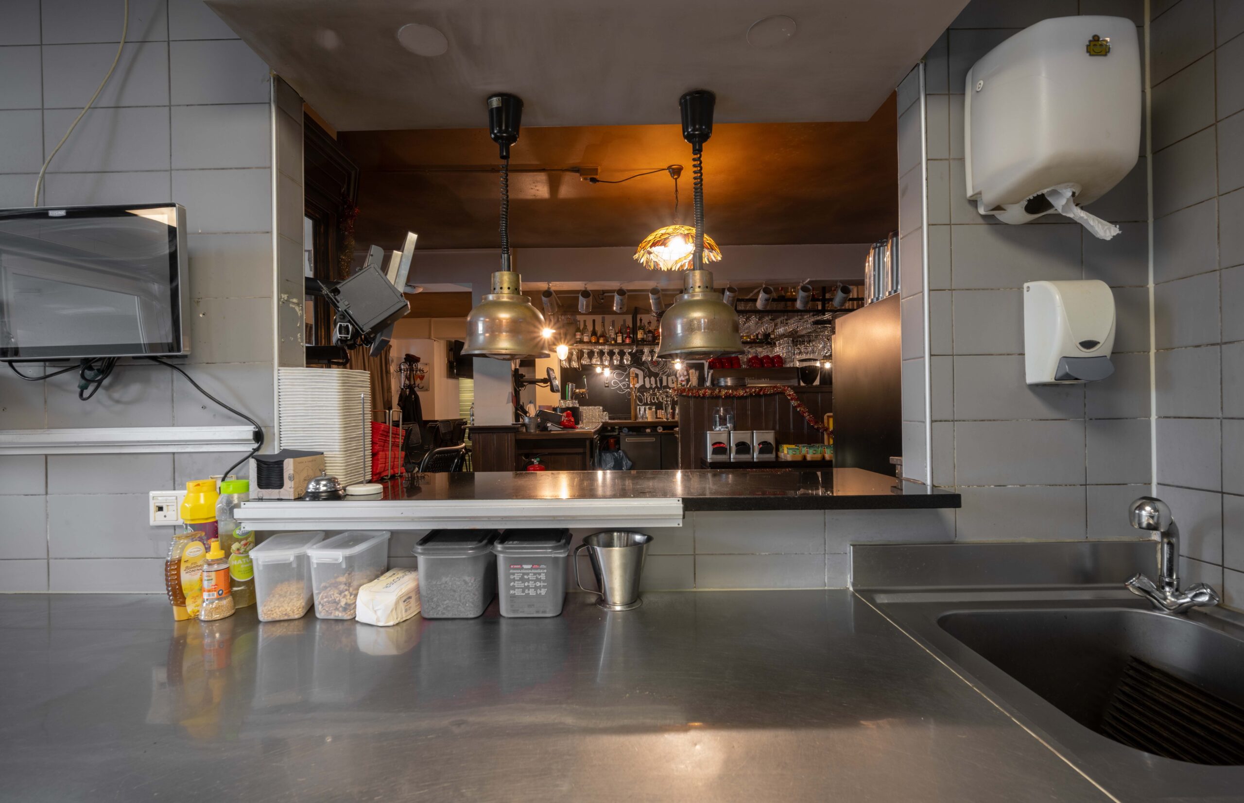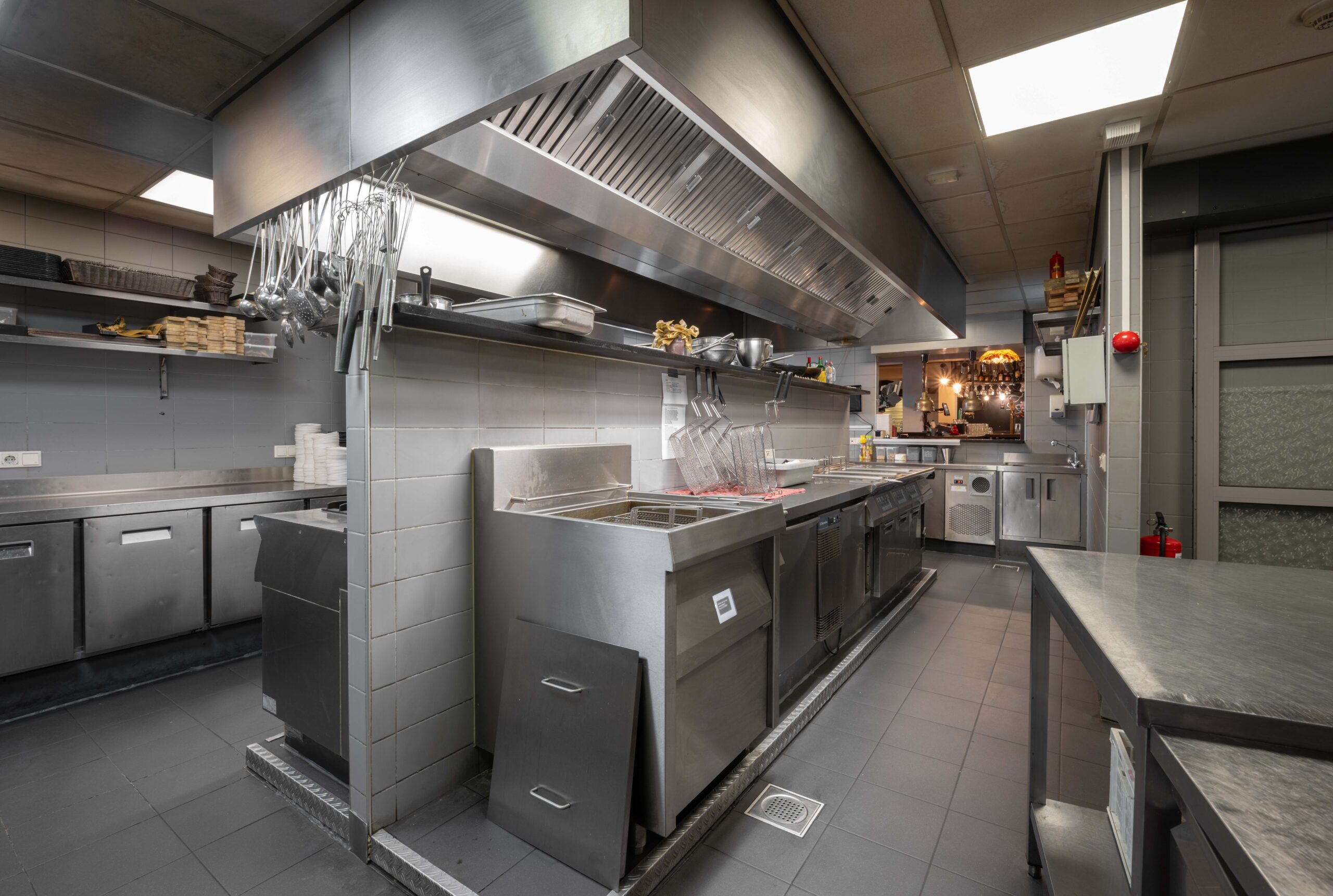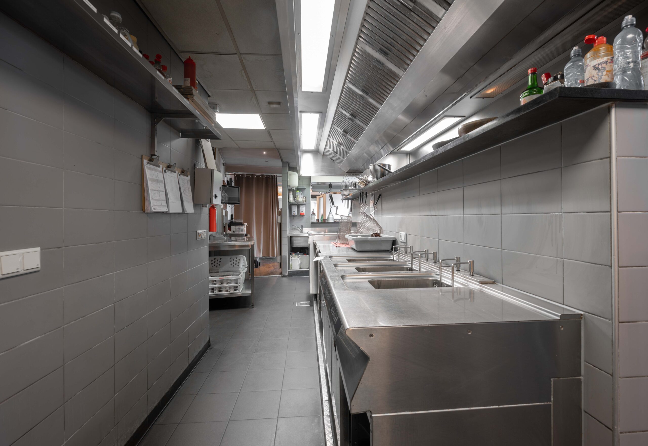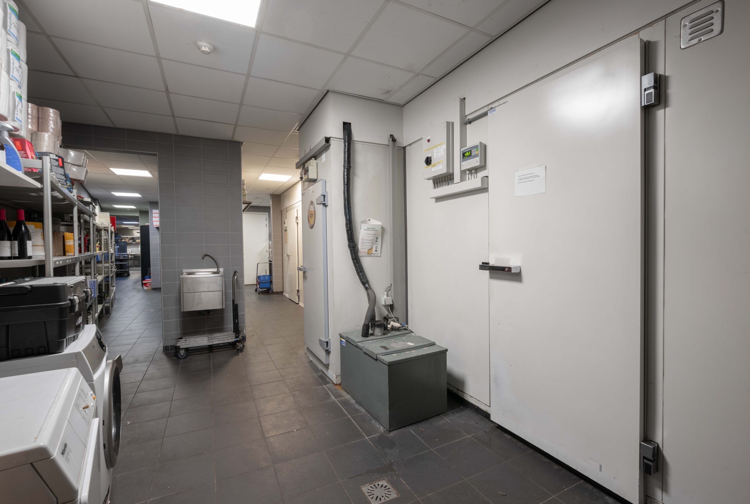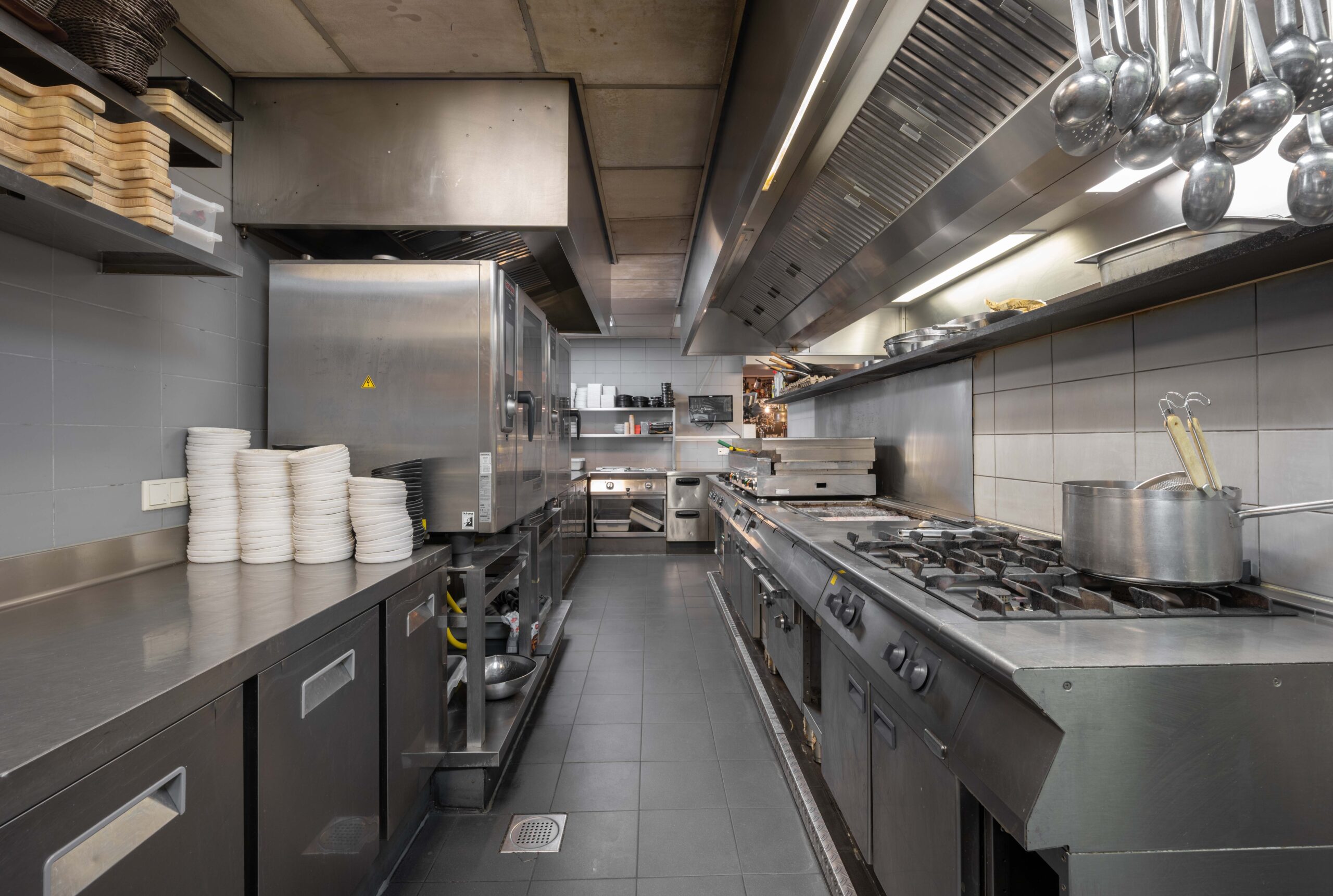 De keuken bevindt zich tegenover de bar en is voorzien van een uitgifteluik om bestellingen efficiënt door te geven. Ruim opgezet, biedt de keuken voldoende werkruimte voor een team van zes koks. De apparatuur is compleet en van professionele kwaliteit, met onder andere een bakplaat, drie elektrische friteuses, één grote friteuse, twee Rational-stoomovens, twee kookeilanden met vier gaspitten, koelwerkbanken en lades. In het gangetje naar achteren staan diverse koelkasten, en de verdere opslagruimte bevindt zich in de lange achtergang. Hier vind je de voorbereidende keuken, meerdere koelcellen, de koeling voor 2x 1.000 liter bier en een vriescel, evenals de spoelkeuken met een professionele doorschuif-afwasmachine. Zo is het pand volledig ingericht om direct een drukbezochte horecazaak te kunnen draaien.