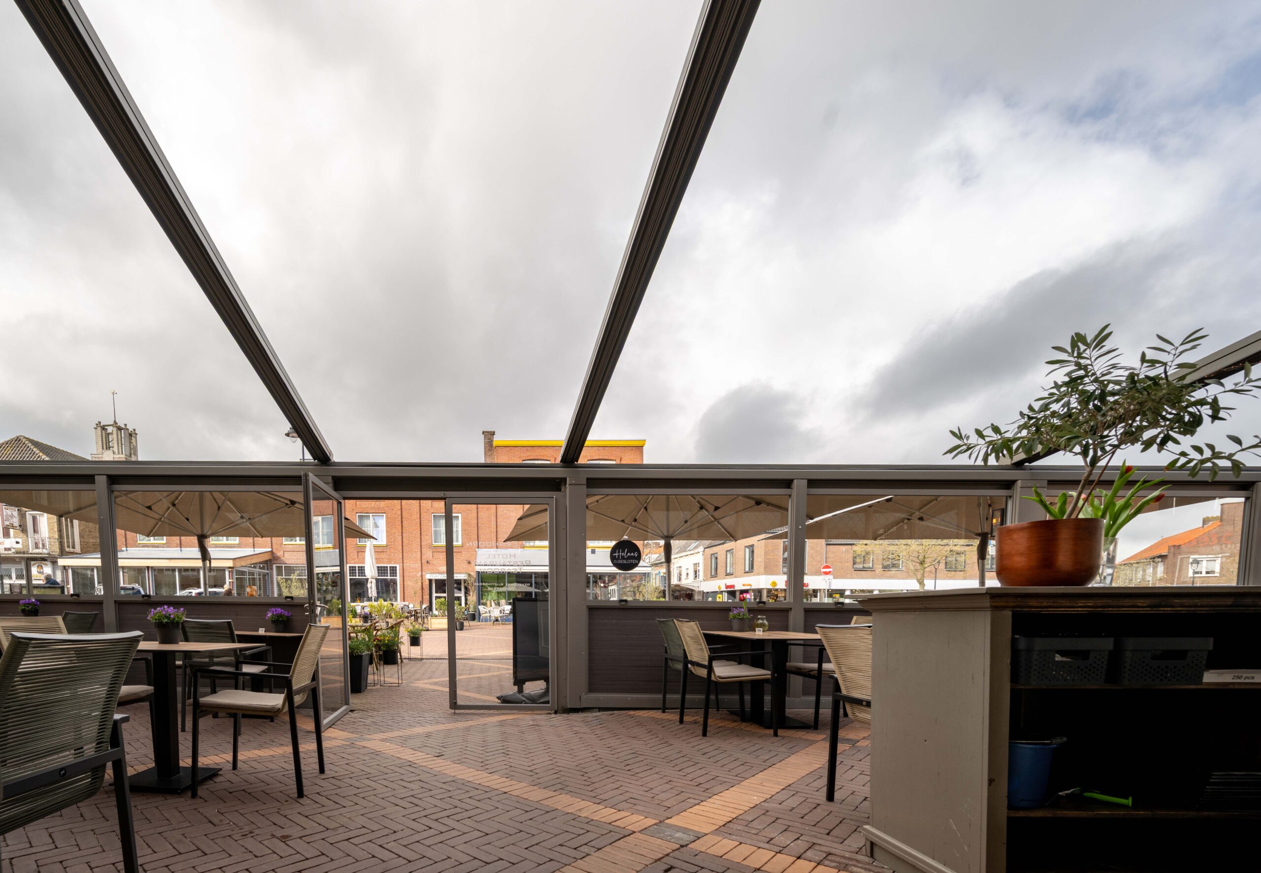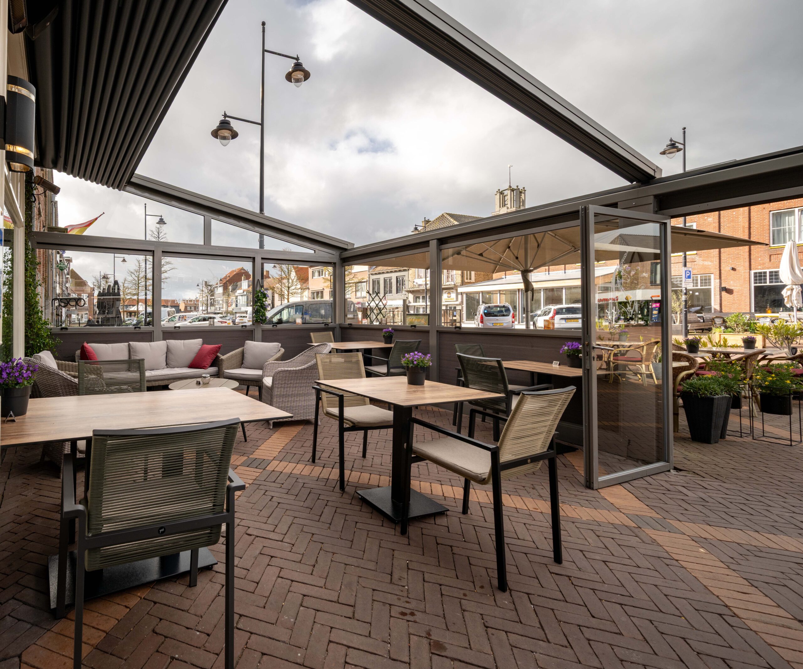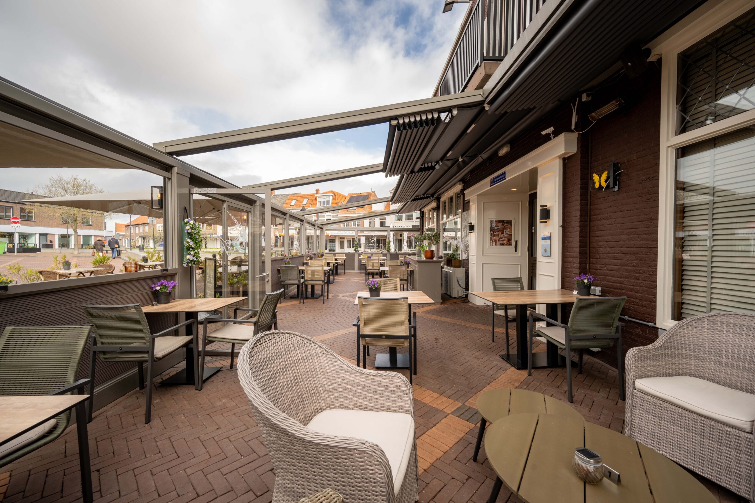 Het ruime, aantrekkelijke en zonnige terras is het eerste wat opvalt als je de Markt in Oostburg bezoekt. Het buitenterras biedt plaats aan 40 gasten en wordt ’s zomers beschut door drie grote parasols. Aan de zaak grenst het ‘binnenterras’, eveneens goed voor 40 gasten, waar je lekker overkapt en beschut zit. Dit terras is in 2023 volledig gerenoveerd en voorzien van warmte lampen en een verlichte overkapping die open of dicht kan. Zo kun je van het vroege voorjaar tot het najaar heerlijk genieten van een hapje of drankje, terwijl je kijkt naar de bedrijvigheid op de Markt.