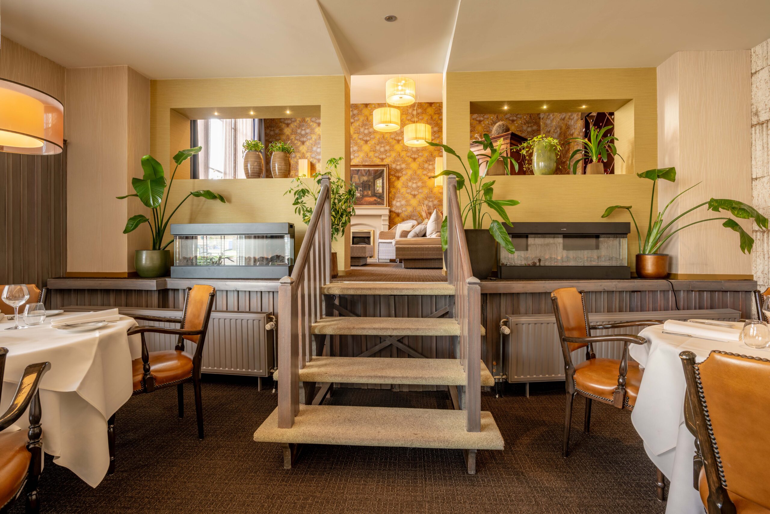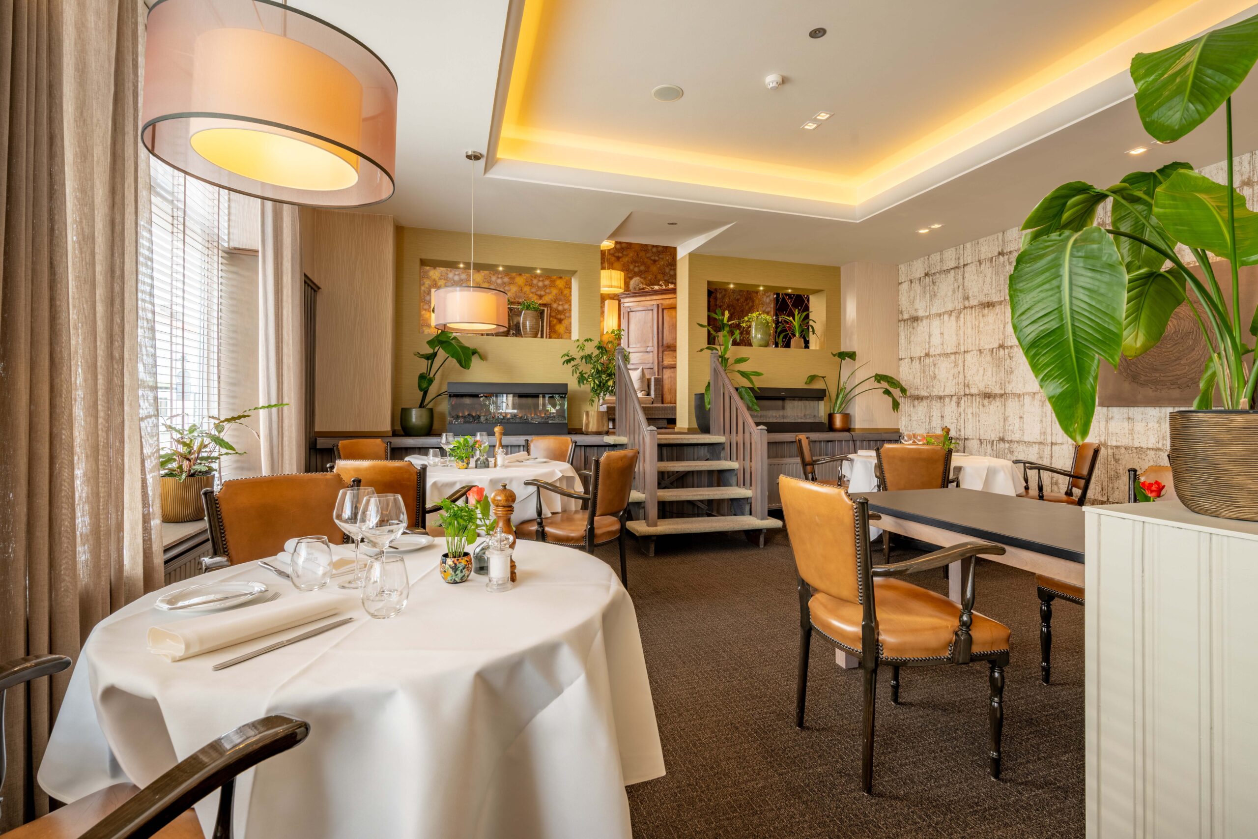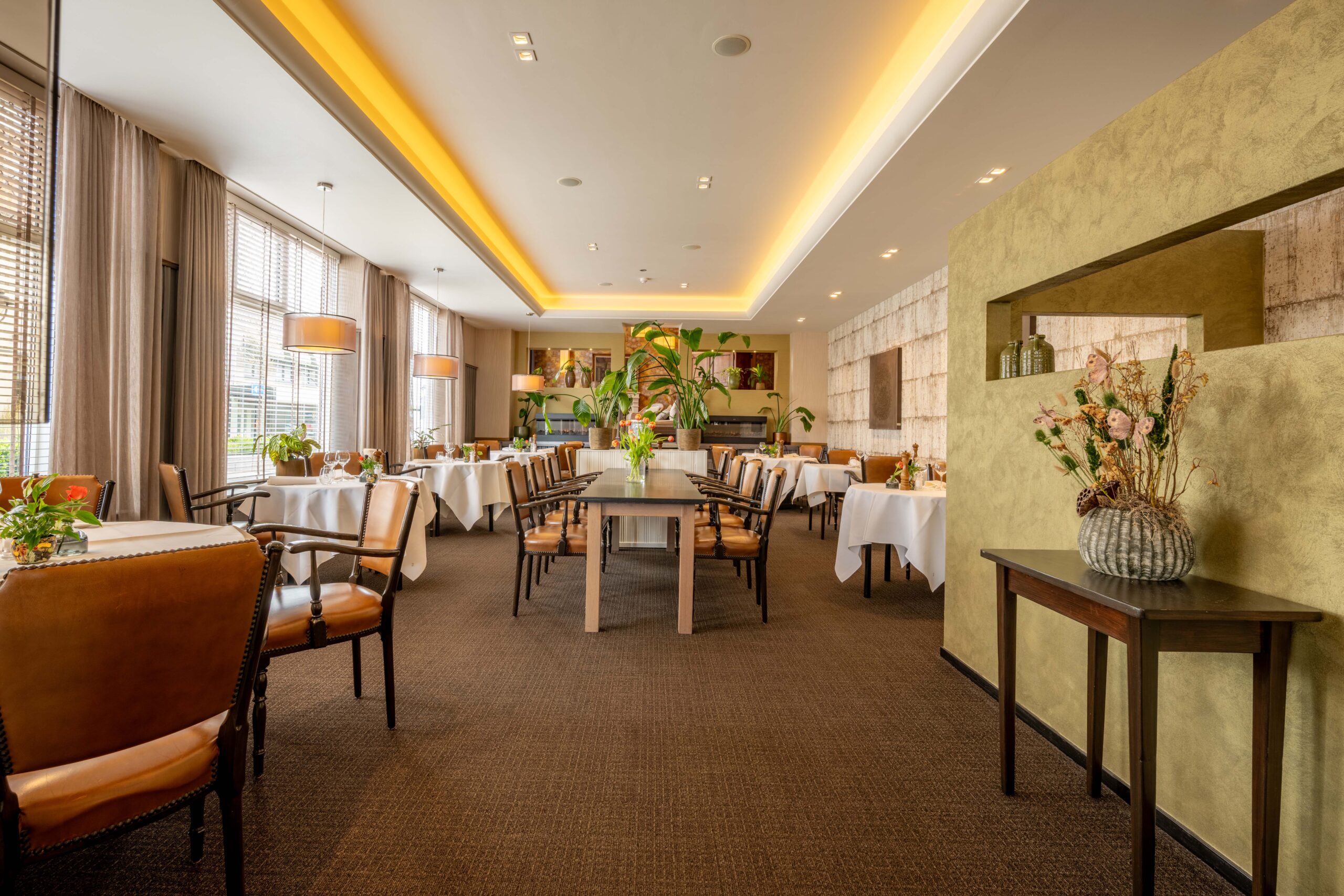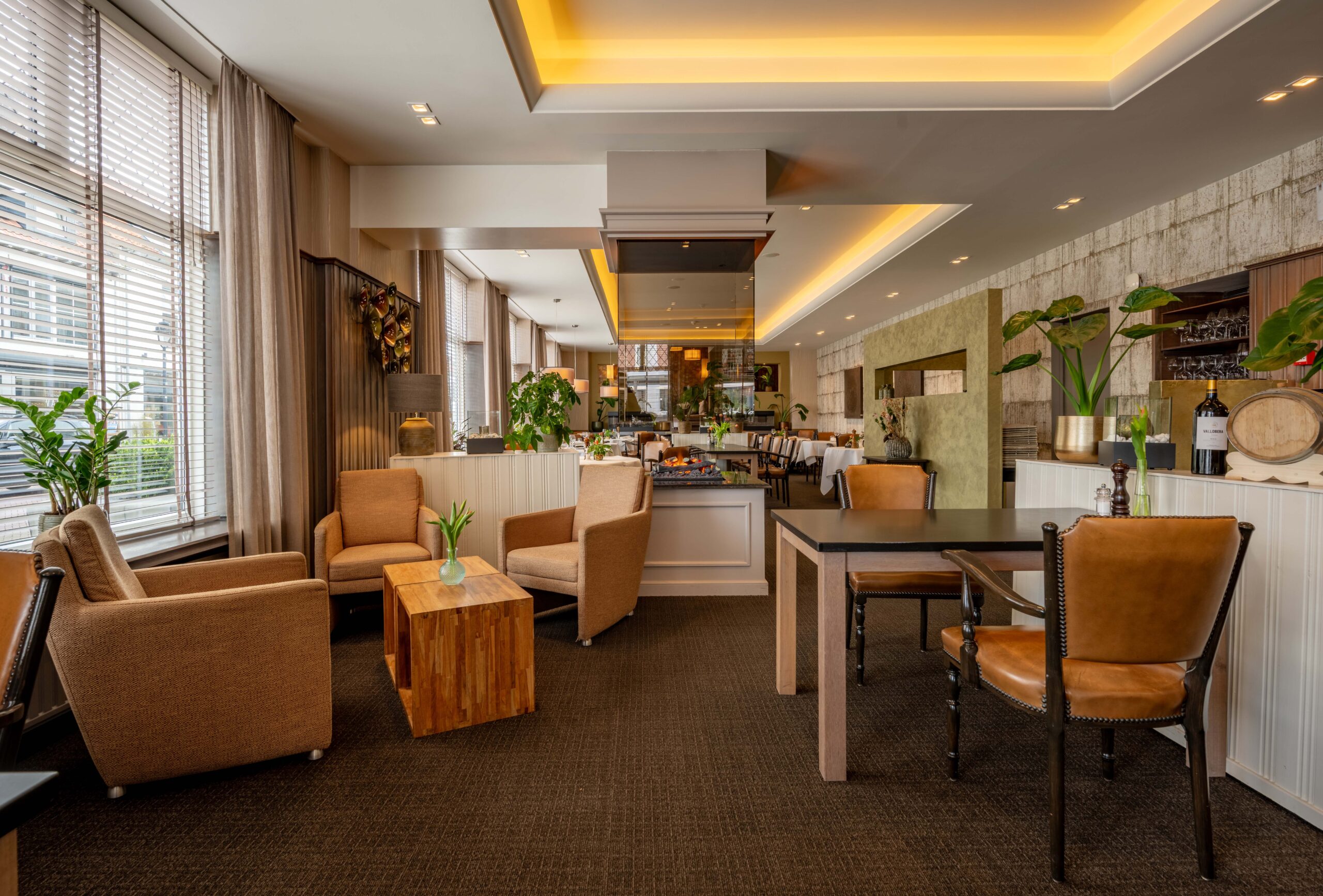 Momenteel is er plaats voor 50 gasten, maar door extra tafels toe te voegen is meer capaciteit mogelijk. Een elektrische haard in het midden en vier kleinere haardjes verspreid door de ruimte zorgen voor extra sfeer. Een bijzonder detail is het ‘toneel’ – een verhoogd gedeelte van het restaurant, ingericht als knusse huiskamer met haard en loungebank. Dit is een heerlijke plek voor hotelgasten om voor of na het diner even te ontspannen. Het restaurant is voorzien van airconditioning, waardoor het ’s zomers koel en ’s winters behaaglijk warm is.