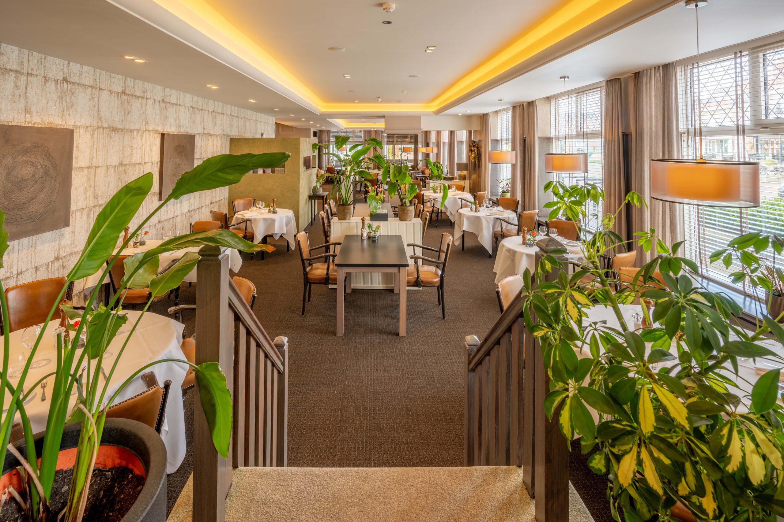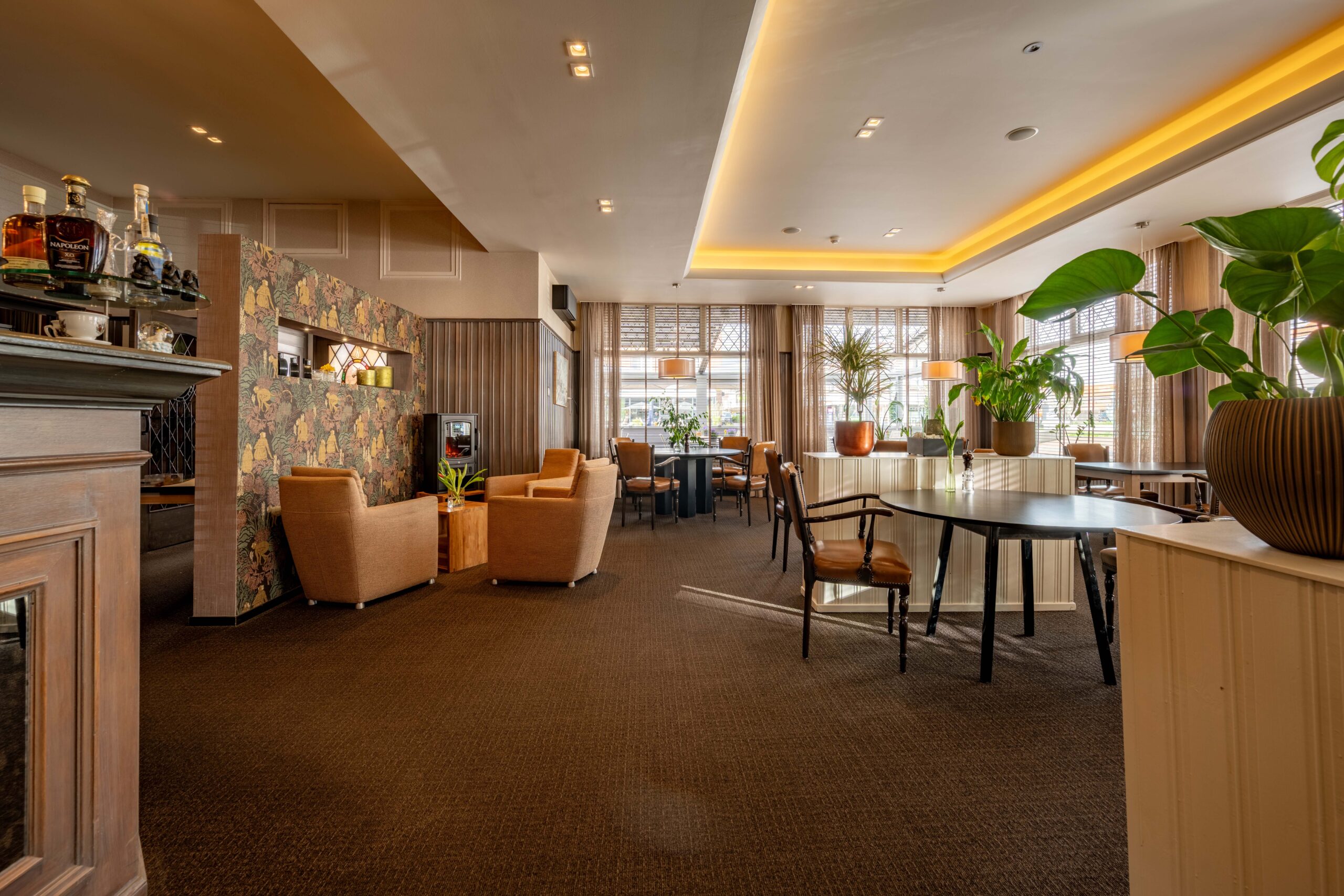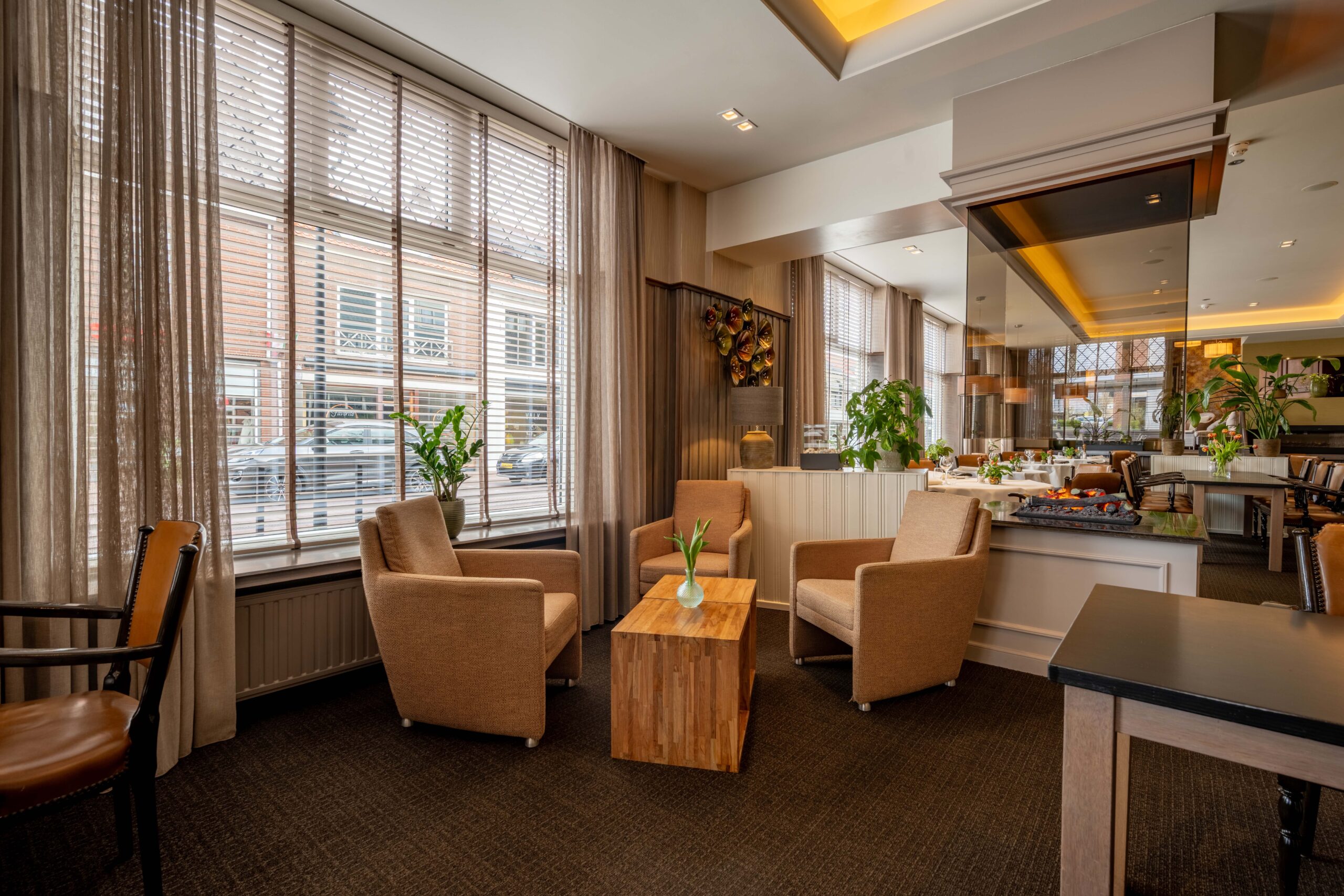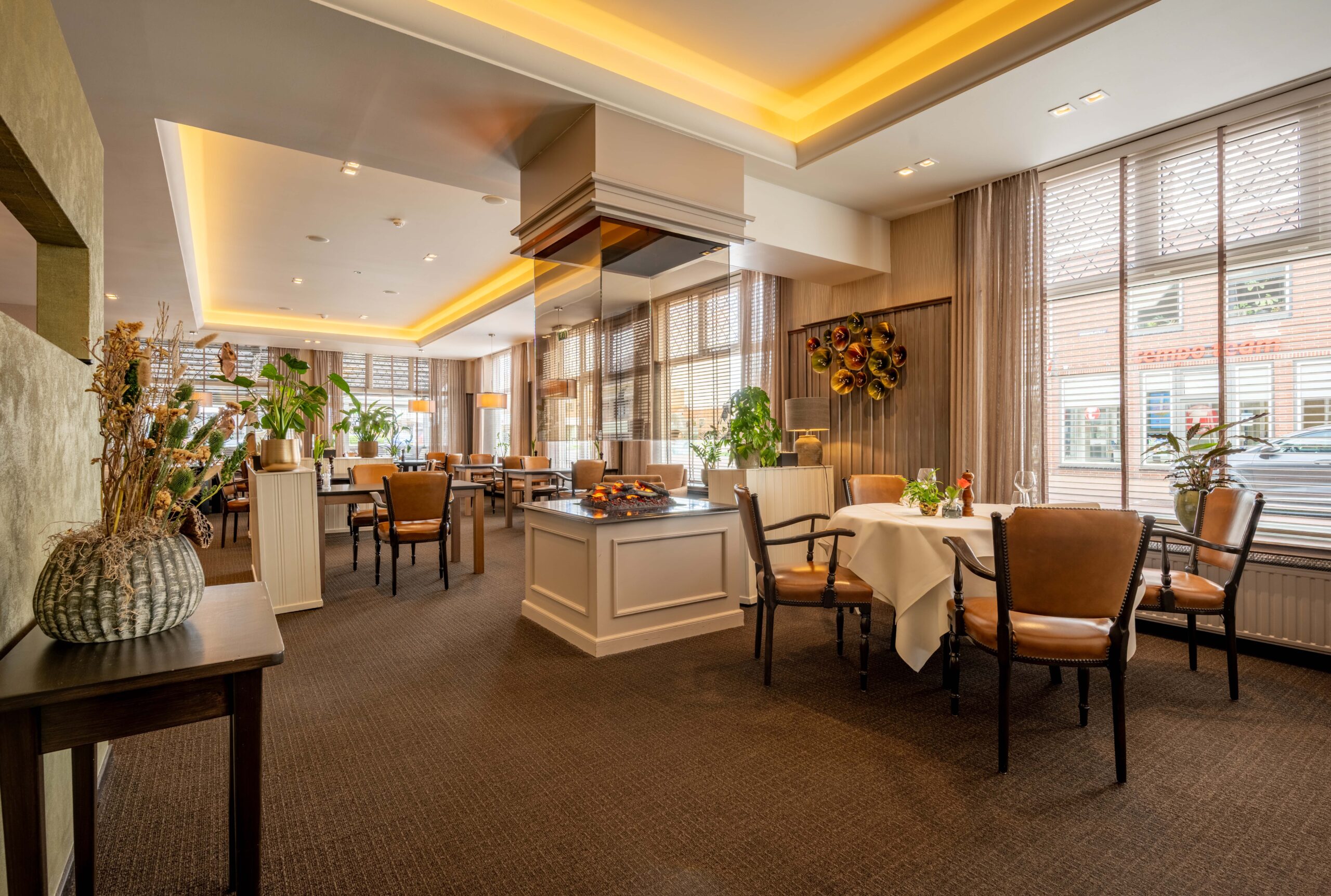 Momenteel is er plaats voor 50 gasten, maar door extra tafels toe te voegen is meer capaciteit mogelijk. Een elektrische haard in het midden en vier kleinere haardjes verspreid door de ruimte zorgen voor extra sfeer. Een bijzonder detail is het ‘toneel’ – een verhoogd gedeelte van het restaurant, ingericht als knusse huiskamer met haard en loungebank. Dit is een heerlijke plek voor hotelgasten om voor of na het diner even te ontspannen. Het restaurant is voorzien van airconditioning, waardoor het ’s zomers koel en ’s winters behaaglijk warm is.