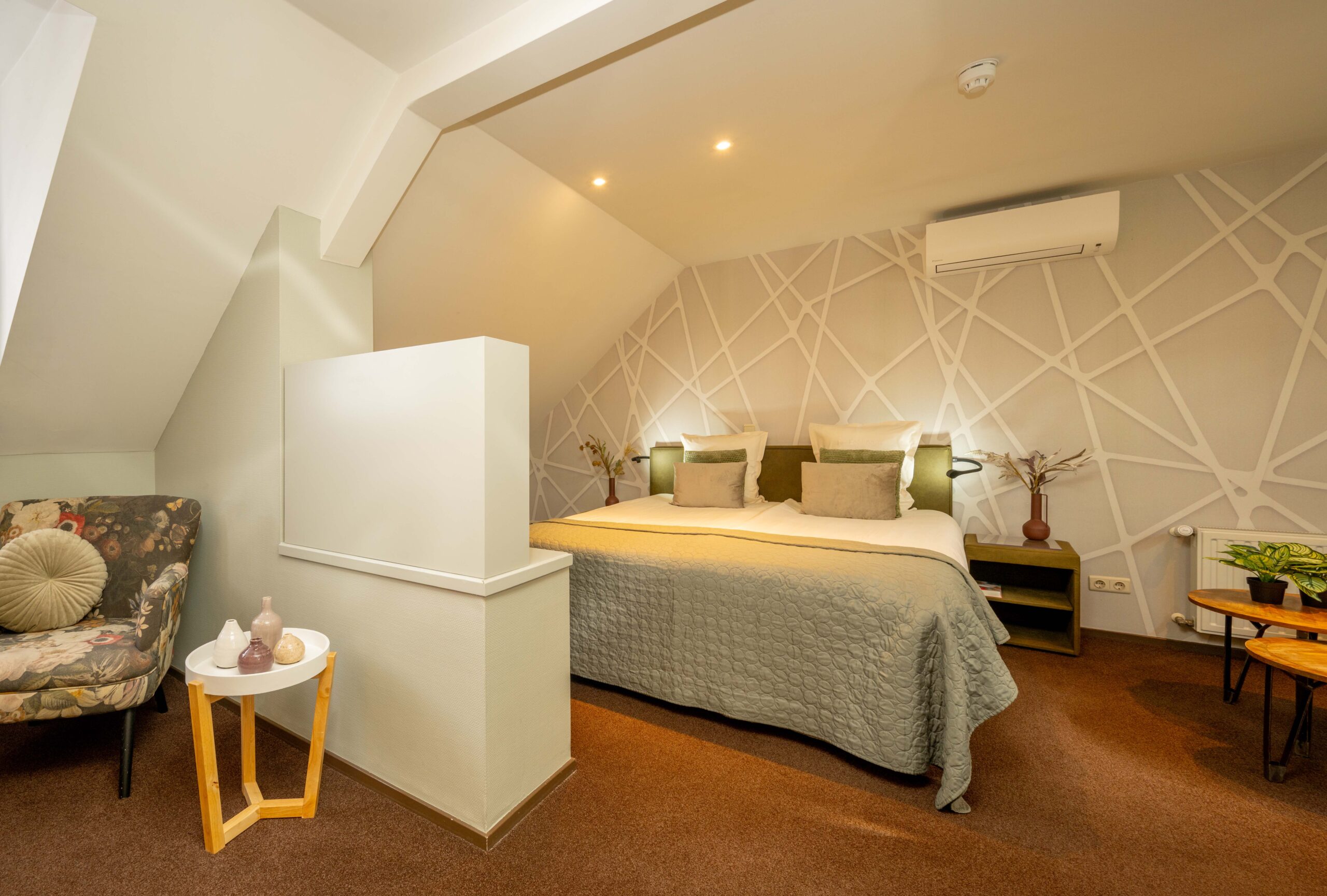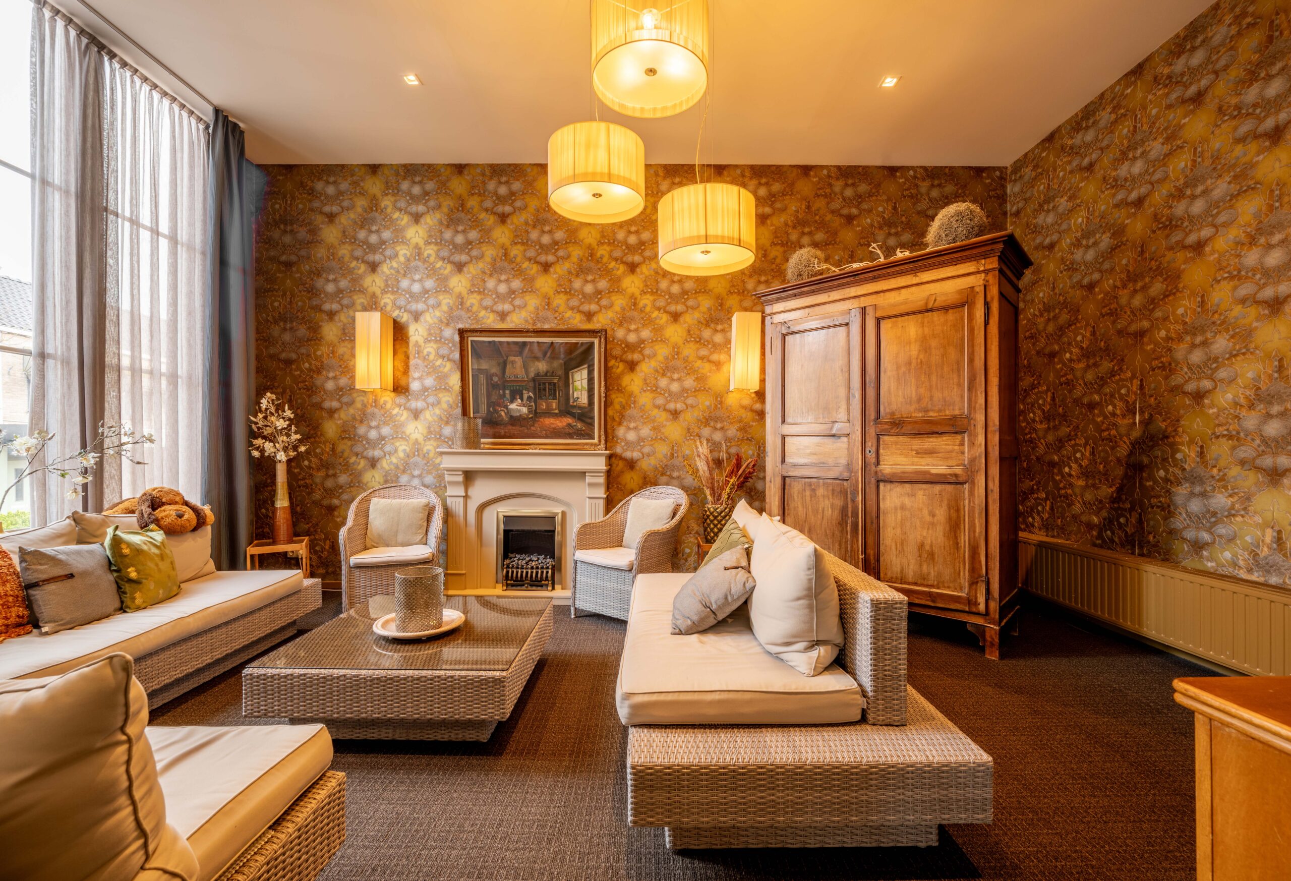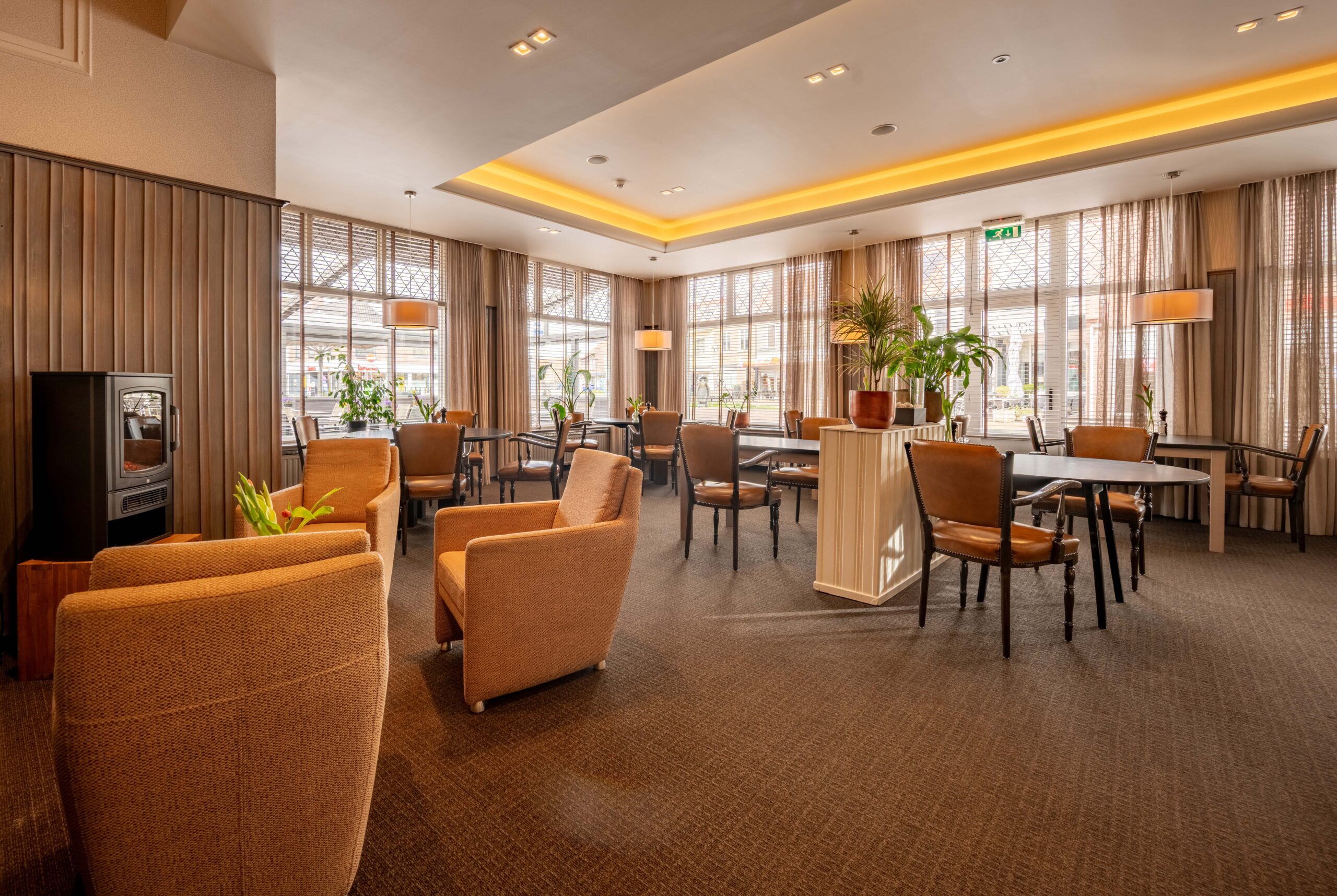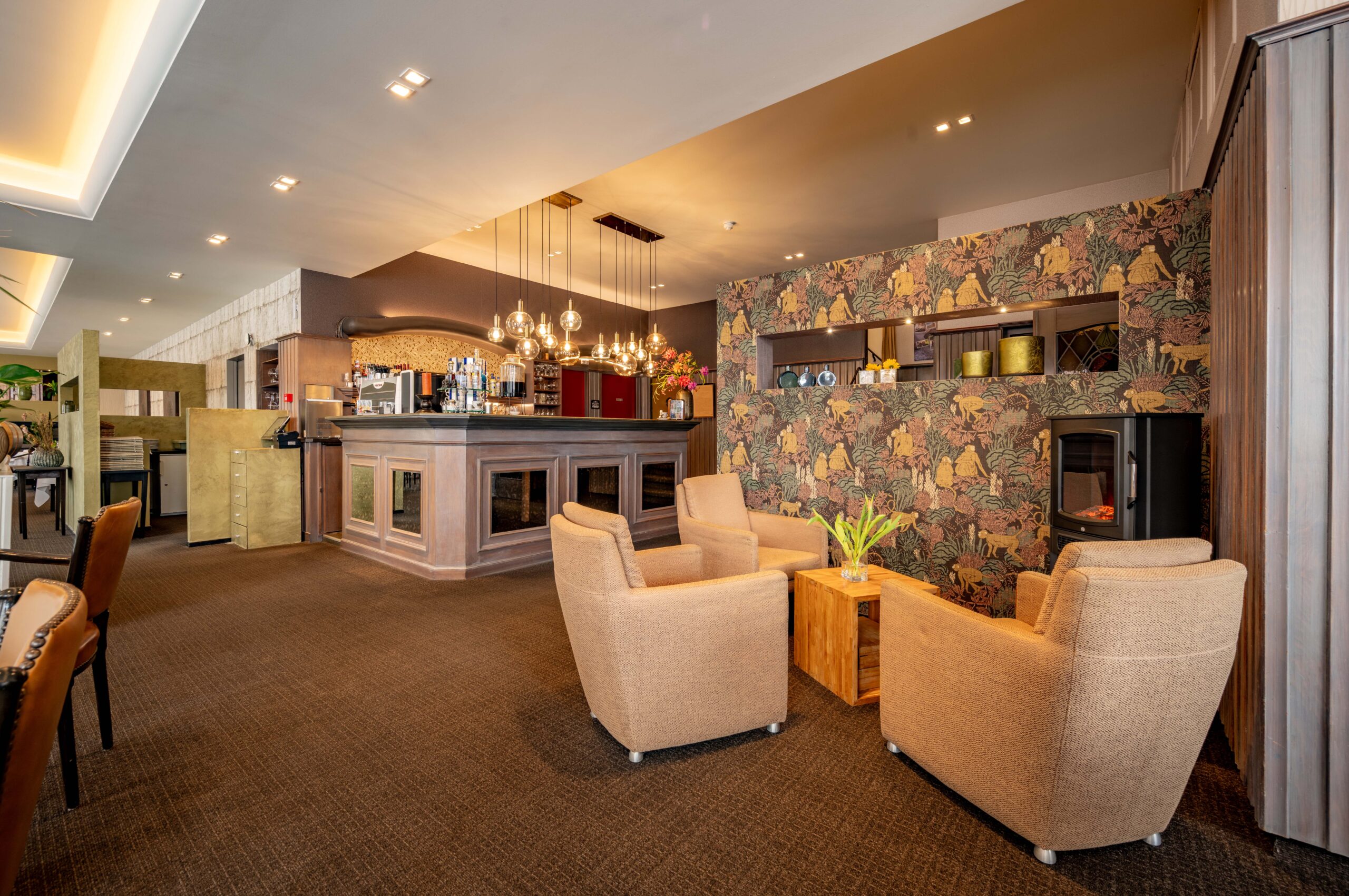 Momenteel is er plaats voor 50 gasten, maar door extra tafels toe te voegen is meer capaciteit mogelijk. Een elektrische haard in het midden en vier kleinere haardjes verspreid door de ruimte zorgen voor extra sfeer. Een bijzonder detail is het ‘toneel’ – een verhoogd gedeelte van het restaurant, ingericht als knusse huiskamer met haard en loungebank. Dit is een heerlijke plek voor hotelgasten om voor of na het diner even te ontspannen. Het restaurant is voorzien van airconditioning, waardoor het ’s zomers koel en ’s winters behaaglijk warm is.
