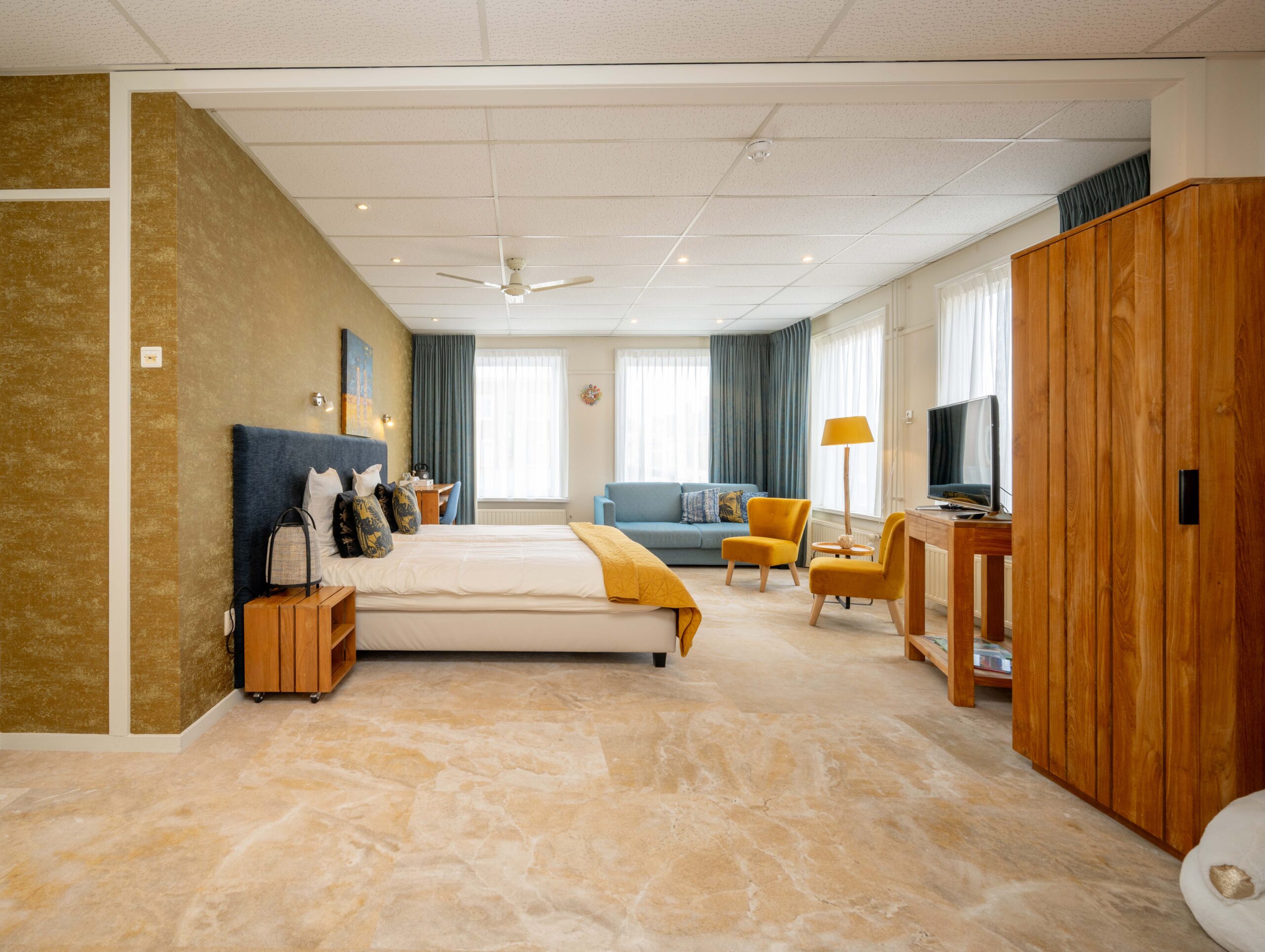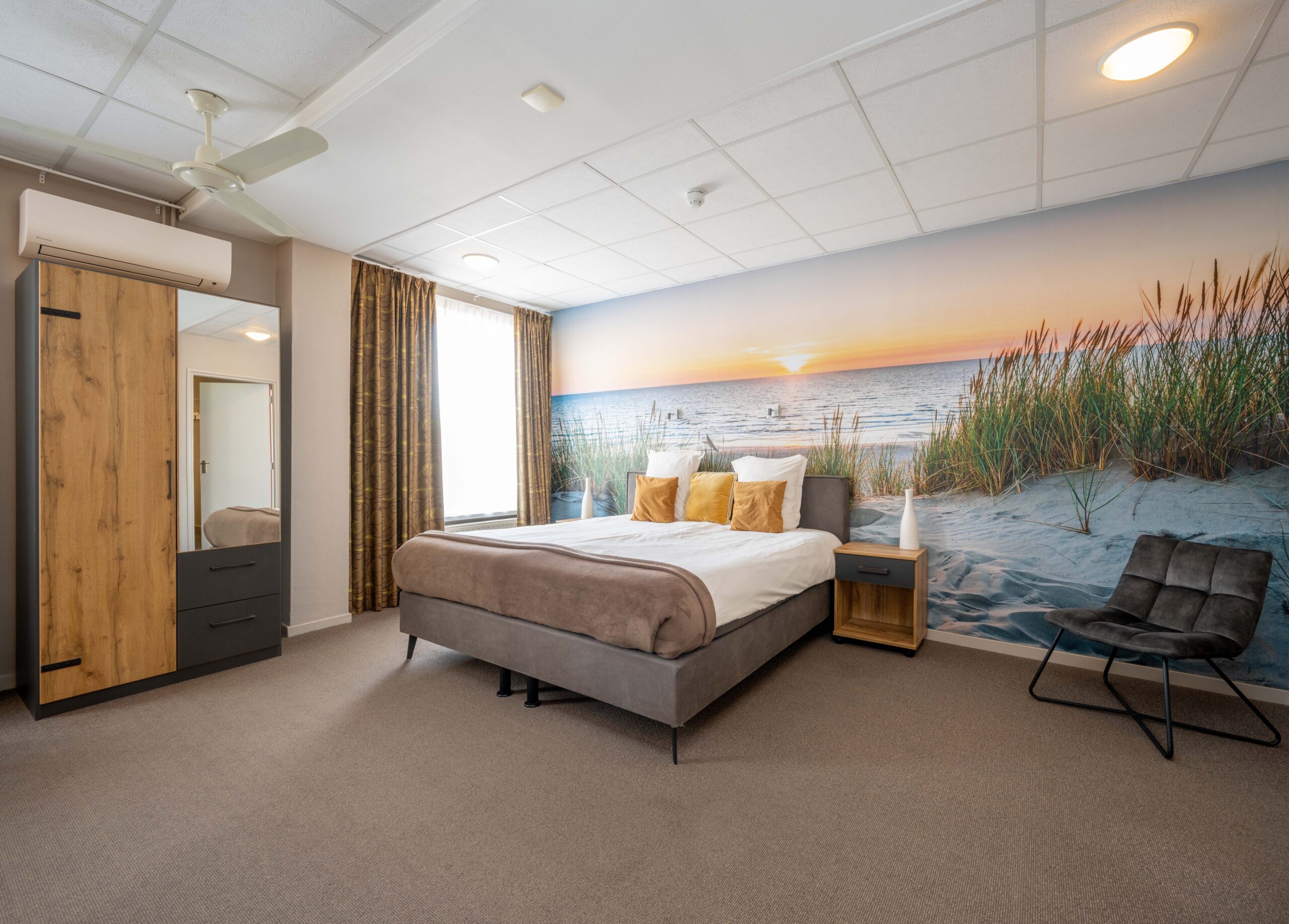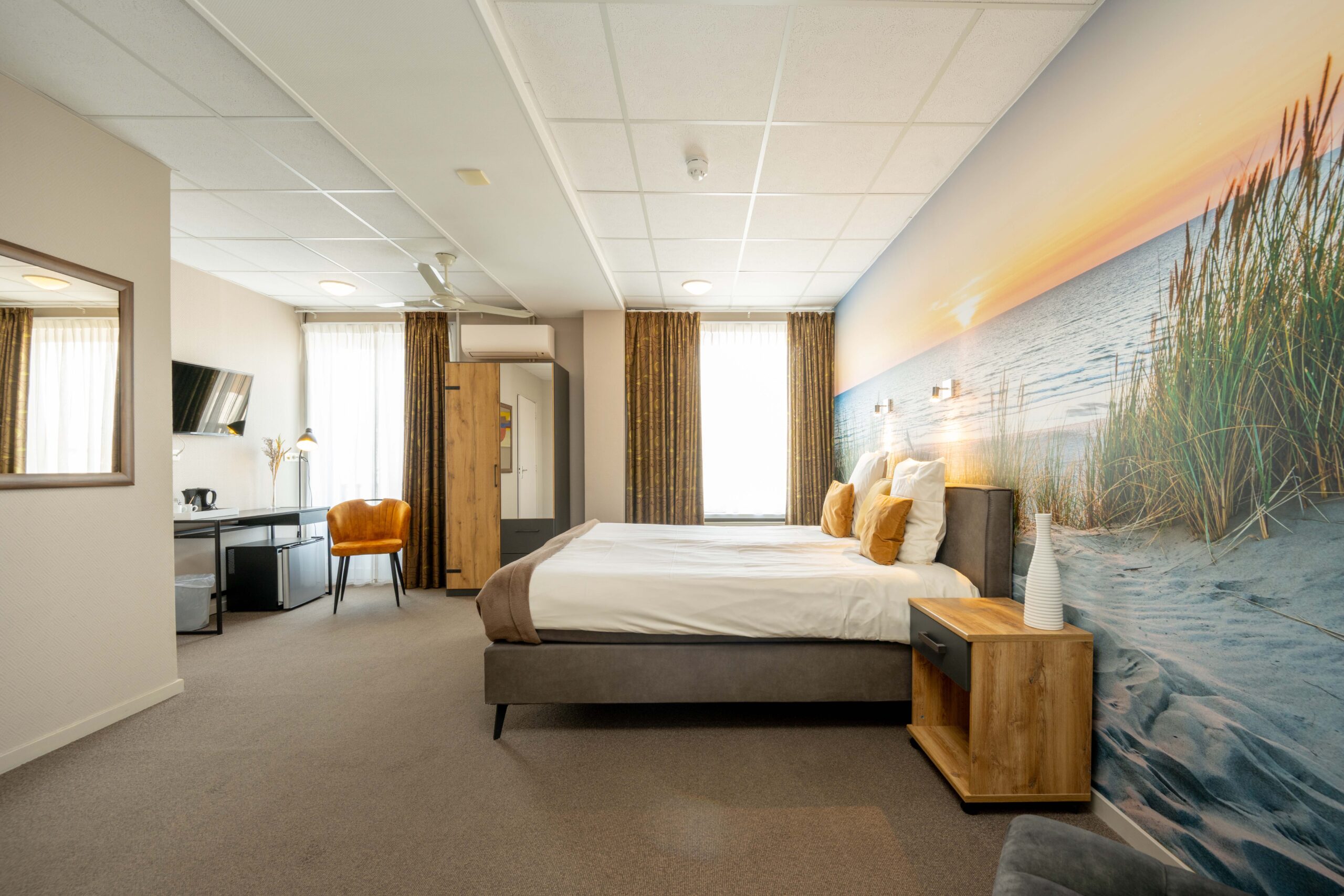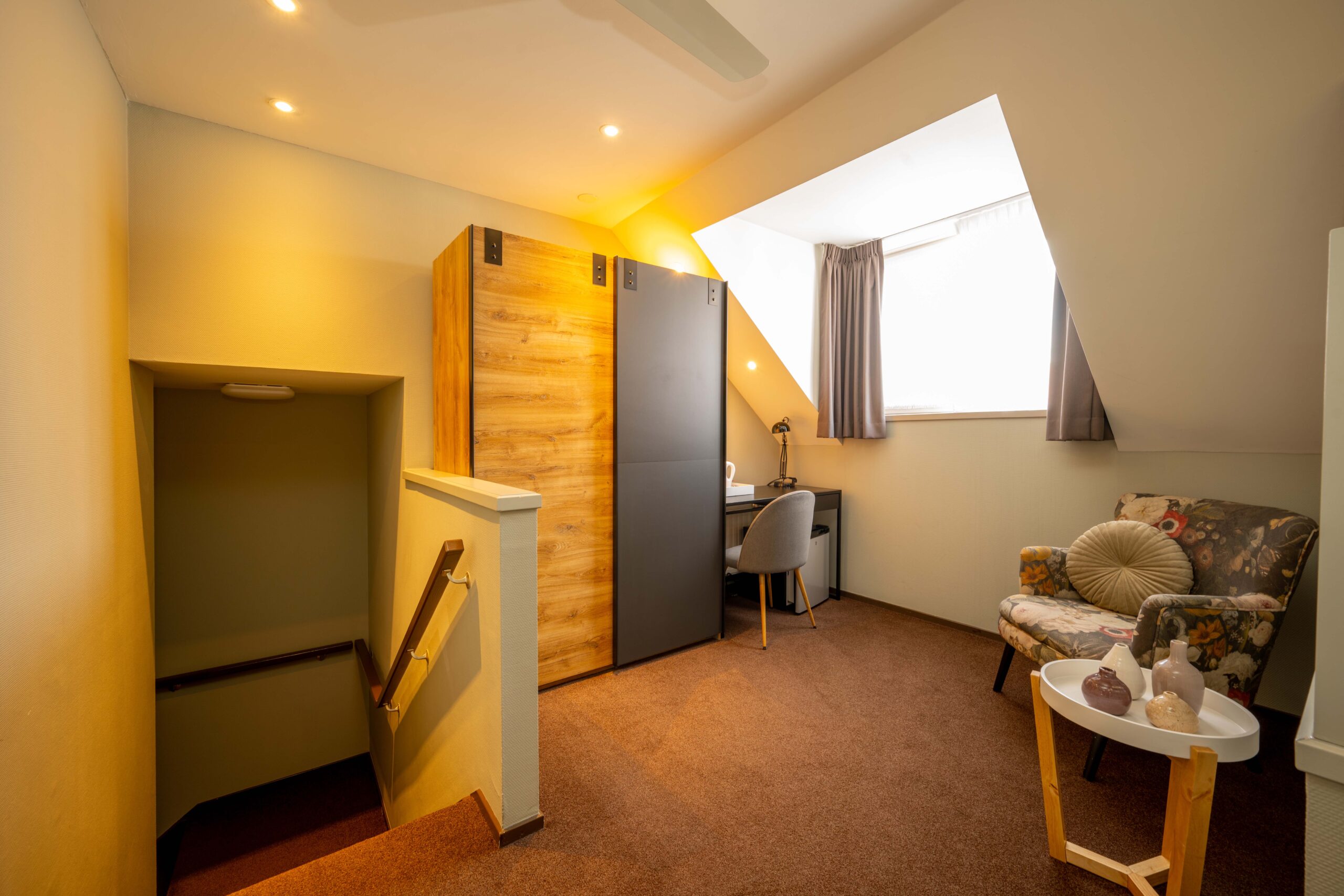 Momenteel is er plaats voor 50 gasten, maar door extra tafels toe te voegen is meer capaciteit mogelijk. Een elektrische haard in het midden en vier kleinere haardjes verspreid door de ruimte zorgen voor extra sfeer. Een bijzonder detail is het ‘toneel’ – een verhoogd gedeelte van het restaurant, ingericht als knusse huiskamer met haard en loungebank. Dit is een heerlijke plek voor hotelgasten om voor of na het diner even te ontspannen. Het restaurant is voorzien van airconditioning, waardoor het ’s zomers koel en ’s winters behaaglijk warm is.
