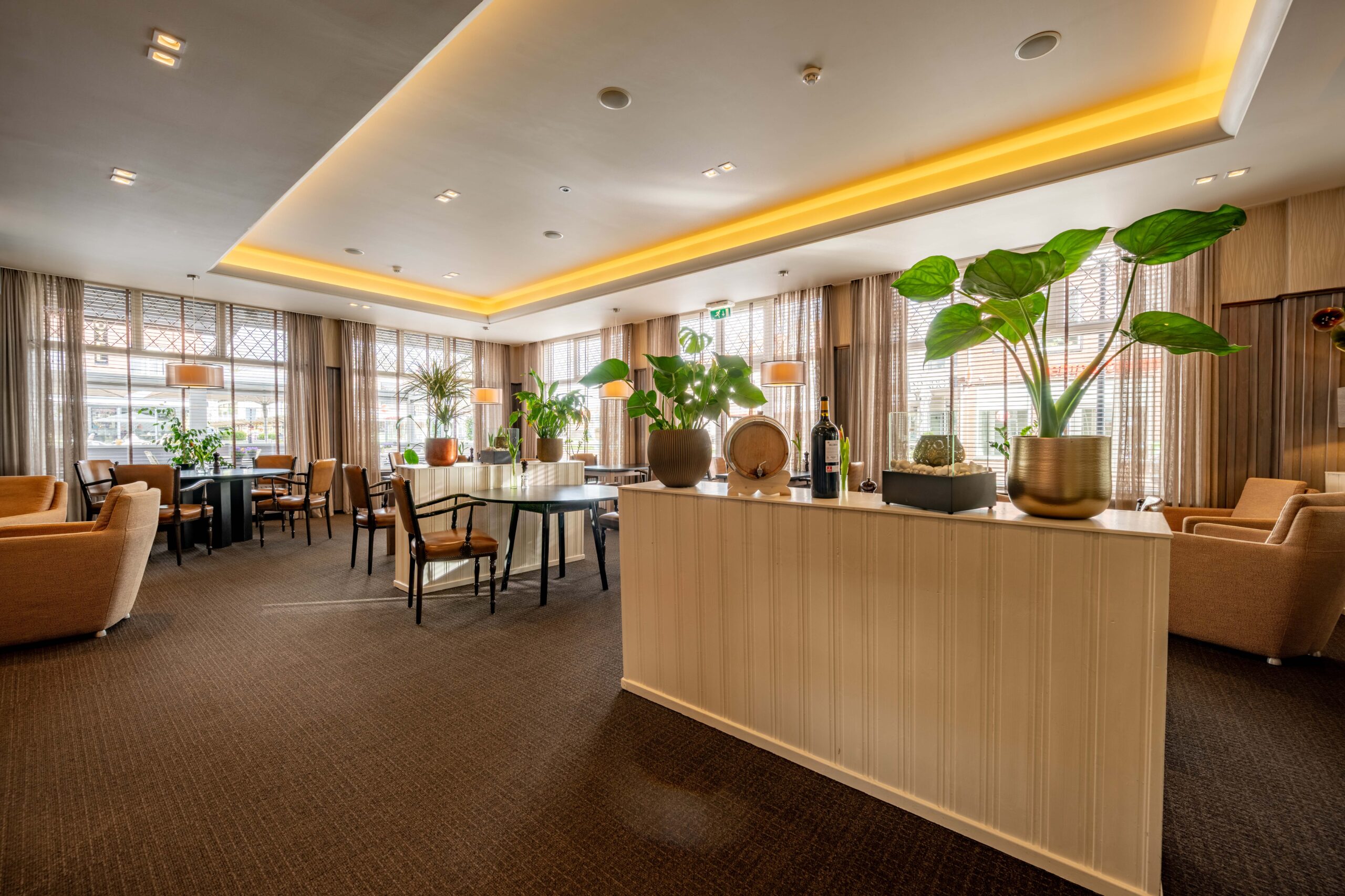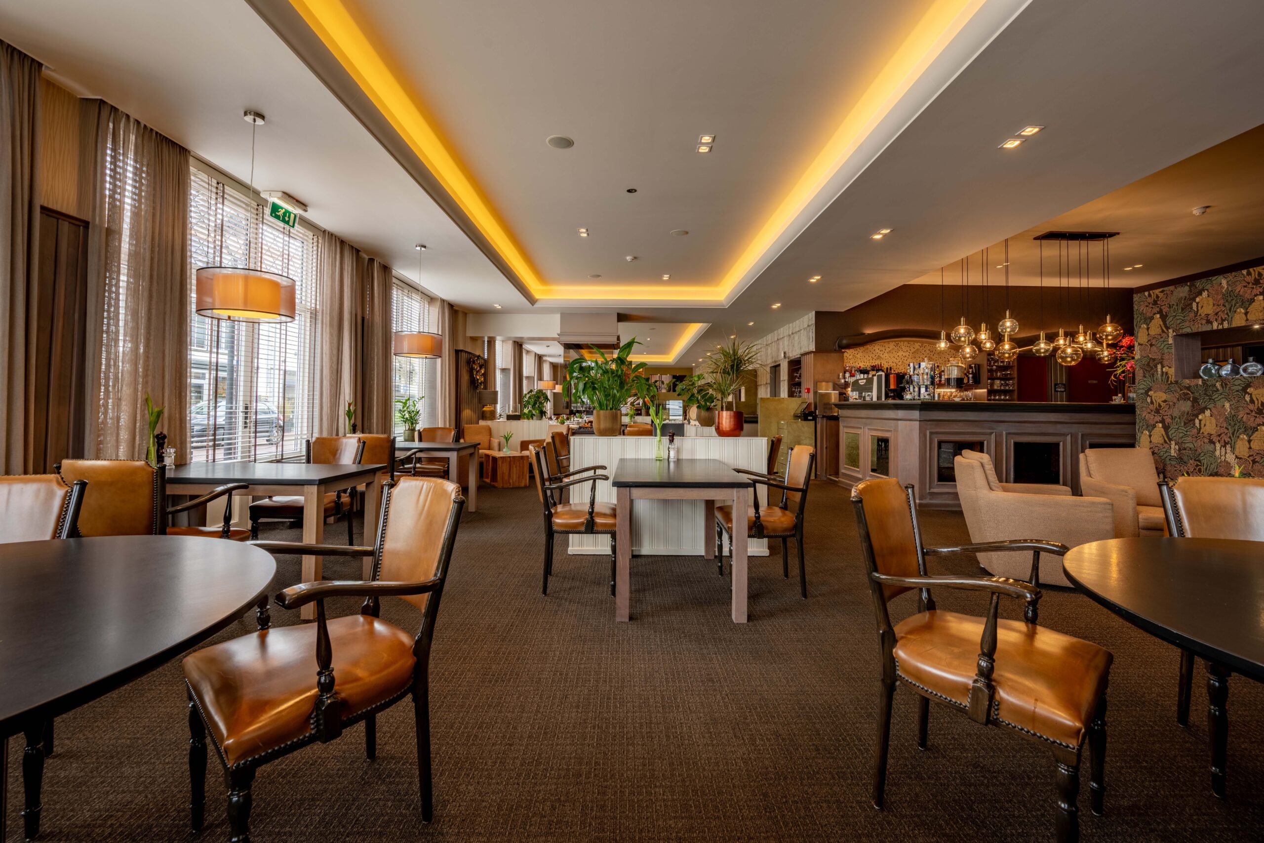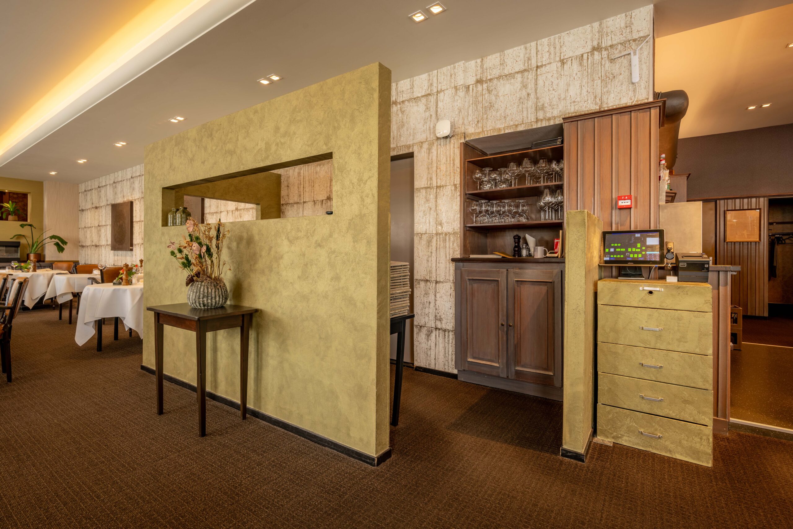 Wie het restaurant binnenstapt, loopt via de entree vrijwel direct naar het buffet, waar hotelgasten kunnen in- en uitchecken. Het buffet fungeert daarnaast als uitgiftepunt voor (warme) dranken en is uitgerust met een koffiezetapparaat, melkopschuimer, glazen vaatwasmachine met osmose-apparaat en diverse drankkoelingen. Het restaurant zelf is sfeervol en huiselijk ingericht, met cognackleurige stoelen gecombineerd met roomwitte en groene tinten, en ademt de charme van een klassiek restaurant.