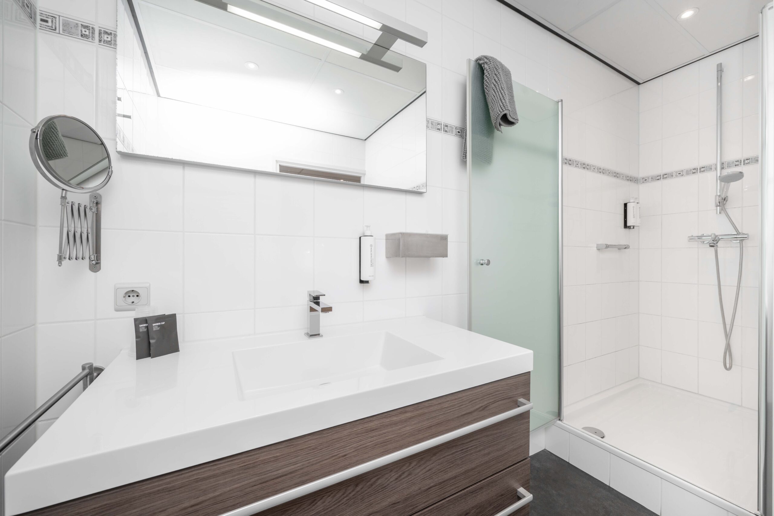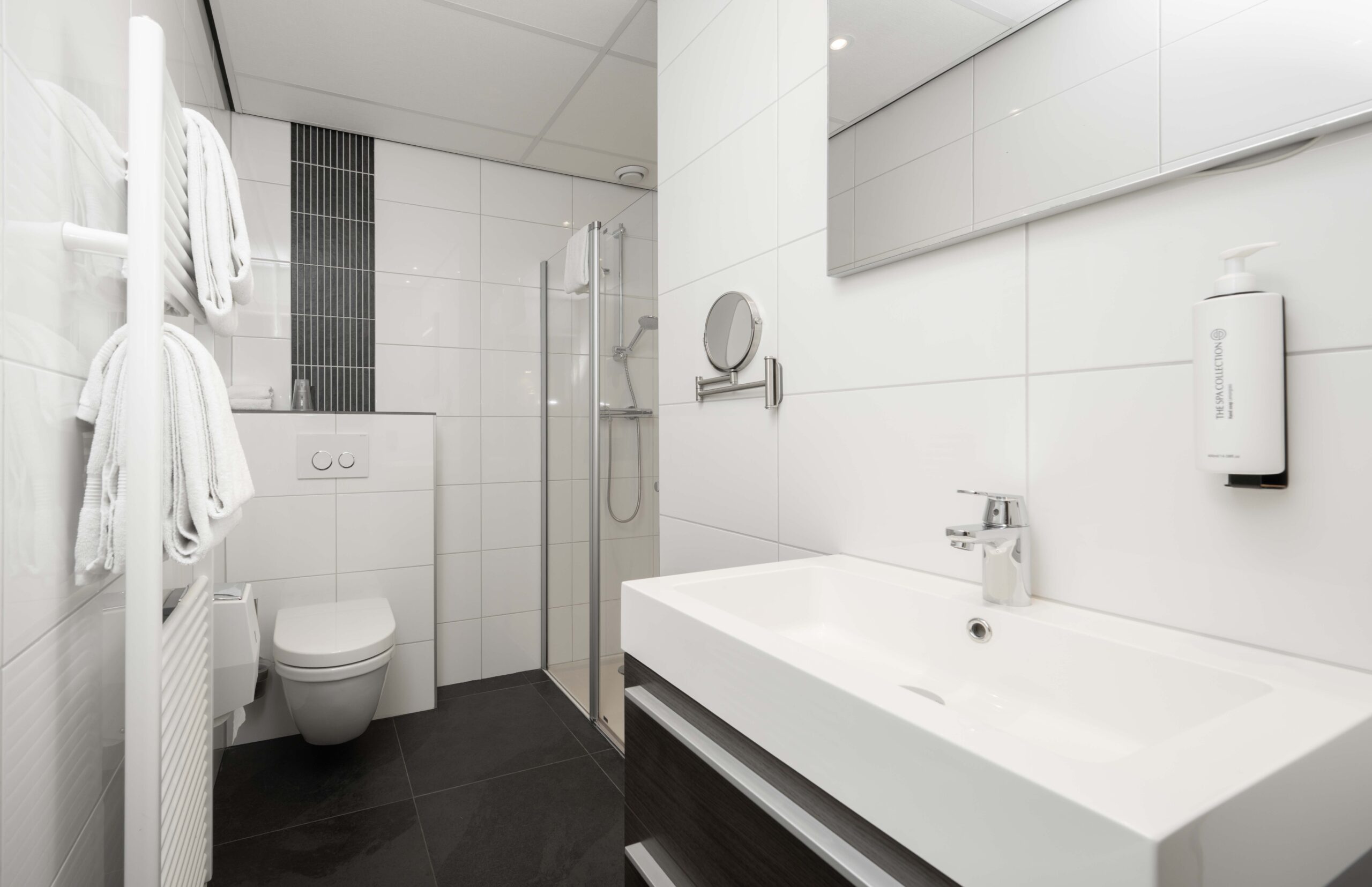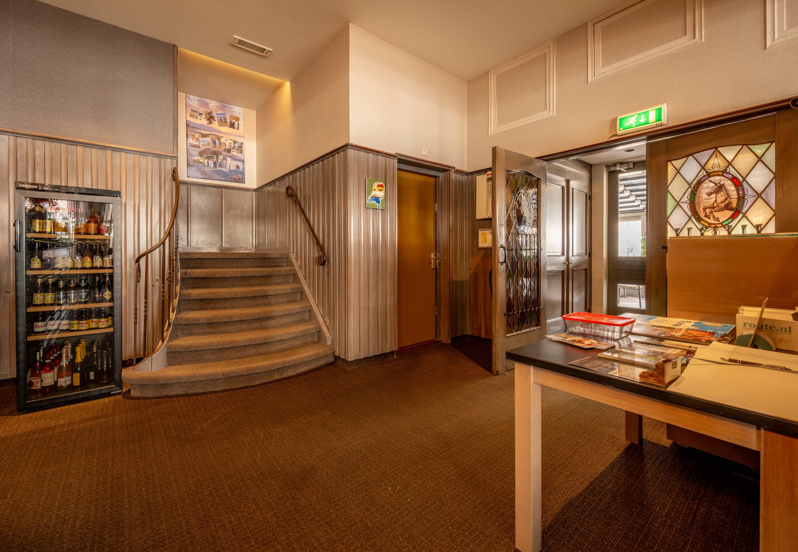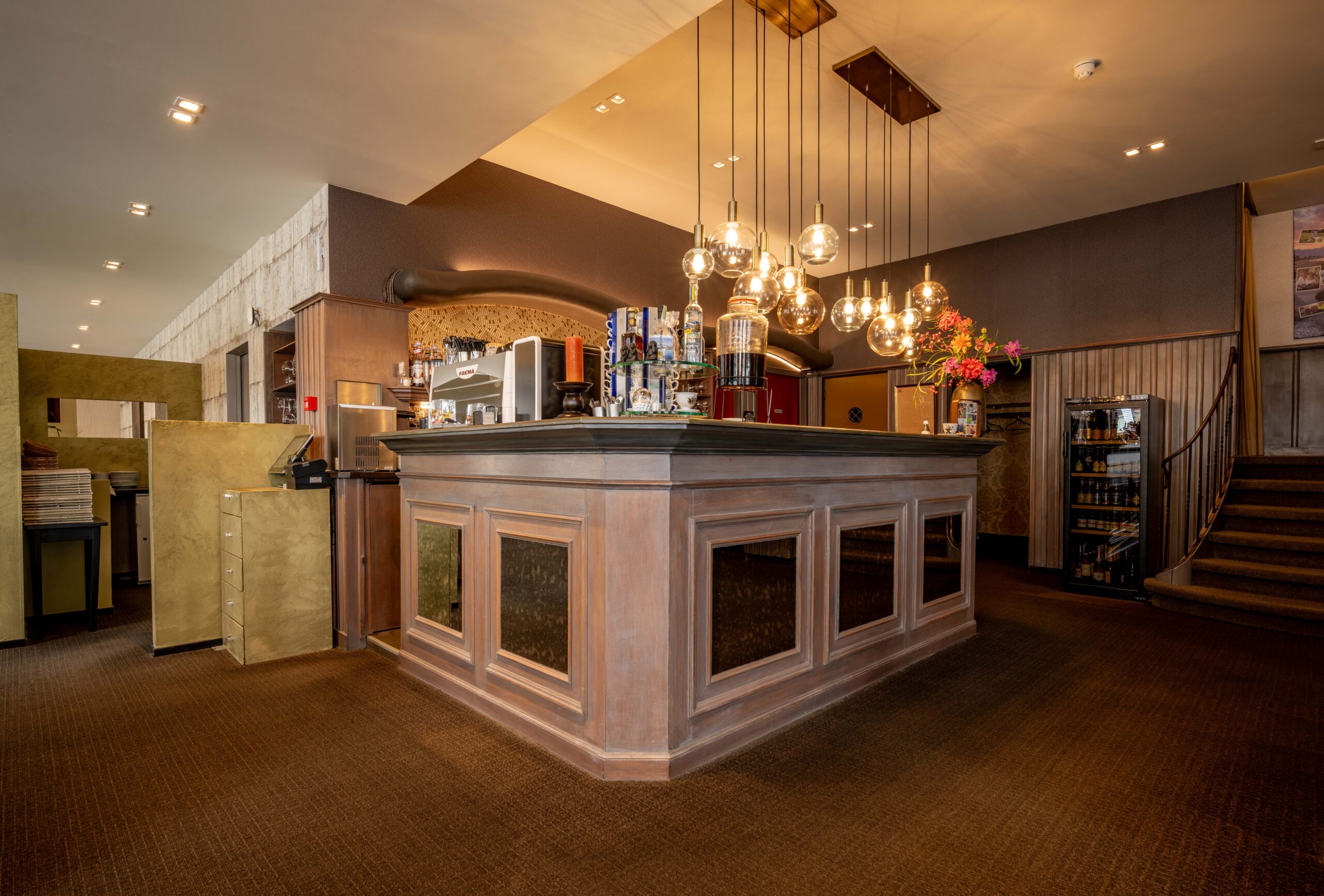 Wie het restaurant binnenstapt, loopt via de entree vrijwel direct naar het buffet, waar hotelgasten kunnen in- en uitchecken. Het buffet fungeert daarnaast als uitgiftepunt voor (warme) dranken en is uitgerust met een koffiezetapparaat, melkopschuimer, glazen vaatwasmachine met osmose-apparaat en diverse drankkoelingen. Het restaurant zelf is sfeervol en huiselijk ingericht, met cognackleurige stoelen gecombineerd met roomwitte en groene tinten, en ademt de charme van een klassiek restaurant.
