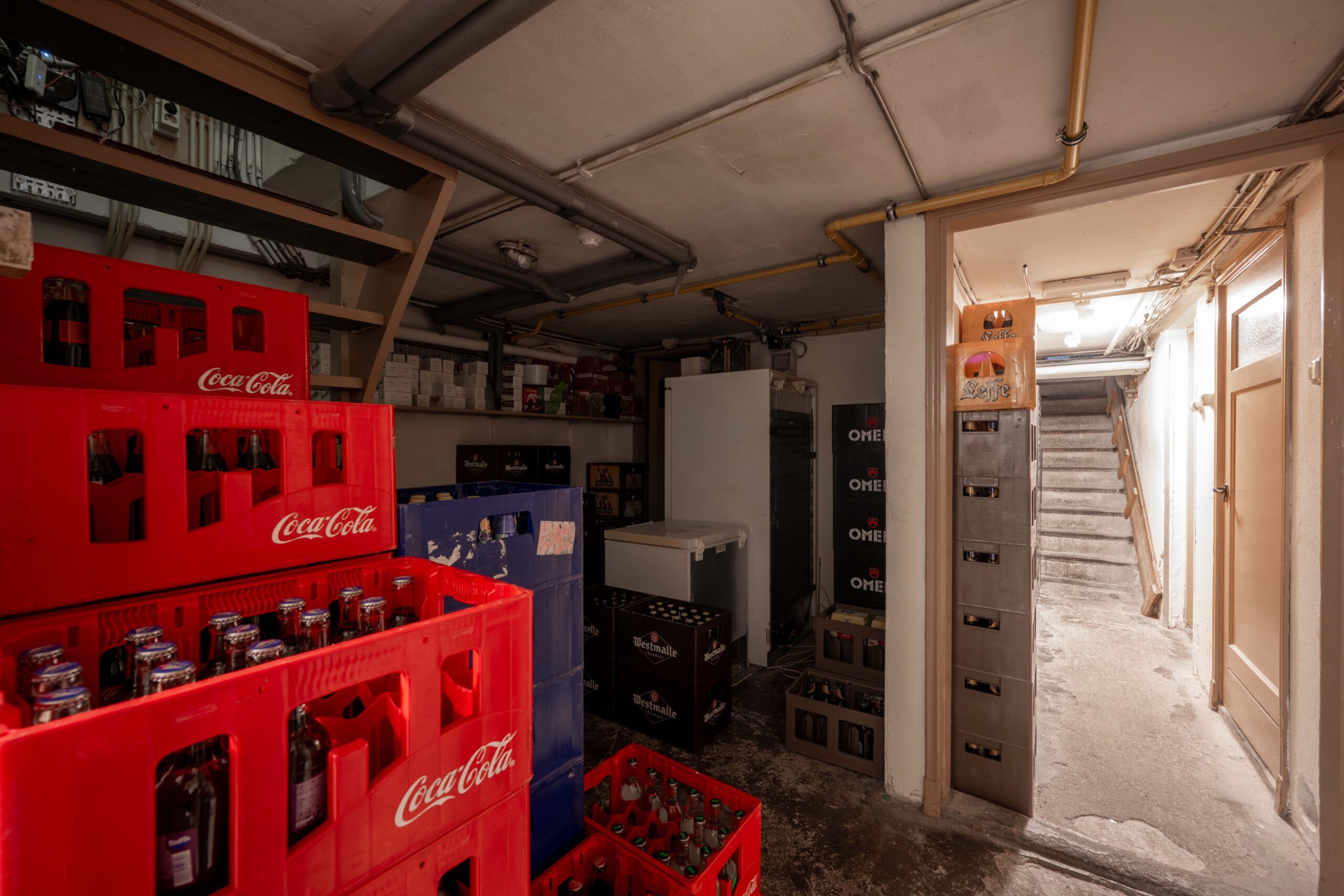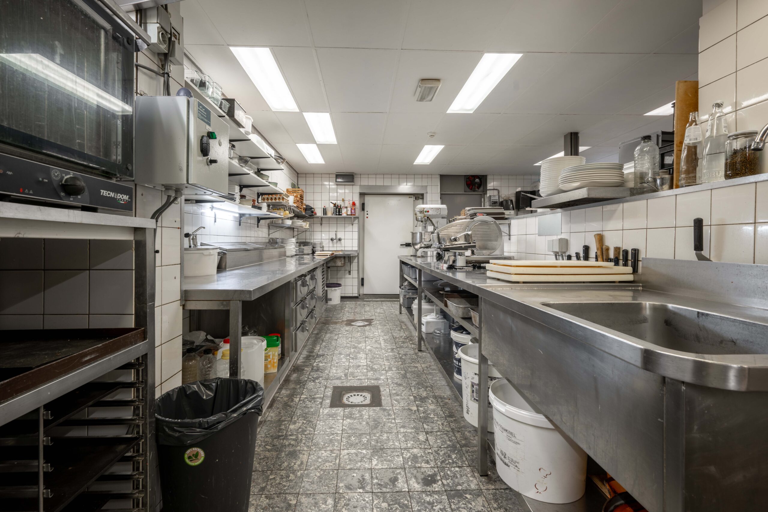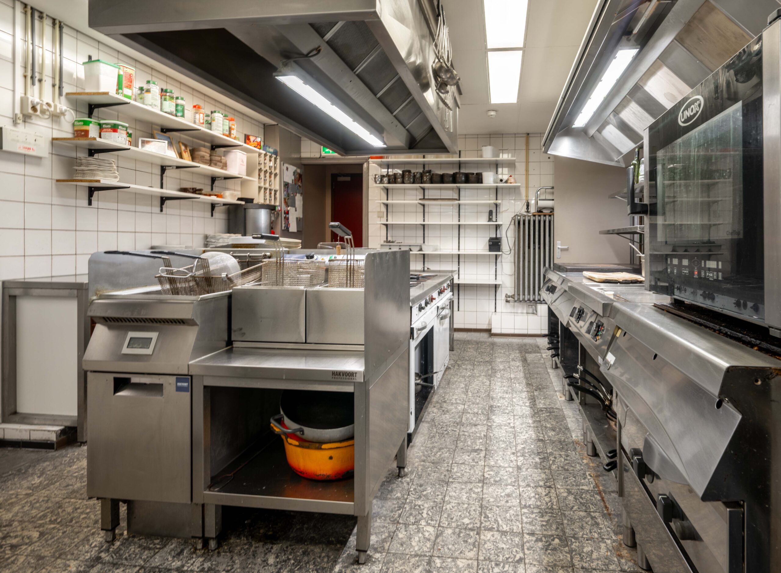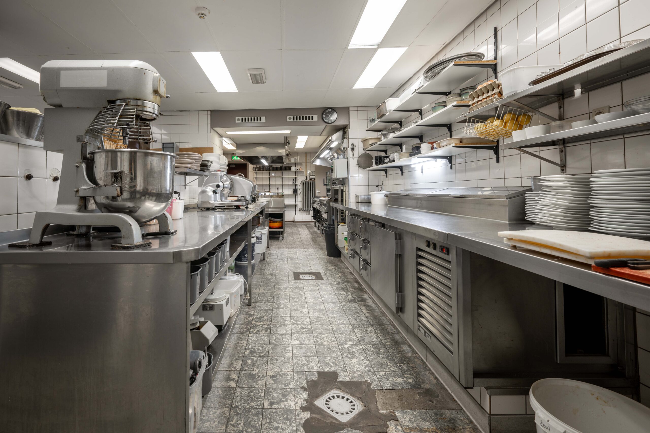 De keuken is zowel via een ingang naast het buffet als rechtstreeks vanuit het restaurant bereikbaar. Het is een opvallend ruime en goed uitgeruste keuken, ideaal voor een hotel-restaurant van dit formaat. Je vindt er onder andere zeven gaspitten, een warmhoudplaat voor soepen, een elektrische plaat voor vlees en vis, één geïntegreerde frituur en twee losse frituren, twee ovens, twee magnetrons, werkbanken met koelelementen, een vacumeermachine, een ruime koelcel van circa 3×3 meter, wijnkasten en losse diepvriezers. De spoelkeuken is voorzien van een doorschuifvaatwasmachine en bevoorrading kan efficiënt via de achterzijde. Onder de keuken bevindt zich een grote kelder met extra opslagruimte en nog een diepvriezer. Daarnaast is er ook onder het ‘toneel’ in het restaurant een kelder aanwezig, wat zorgt voor nog meer praktische opslagmogelijkheden.