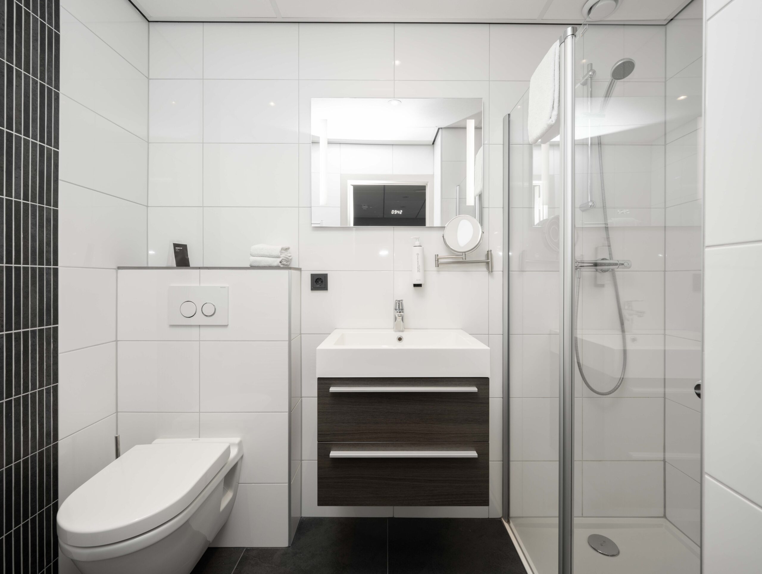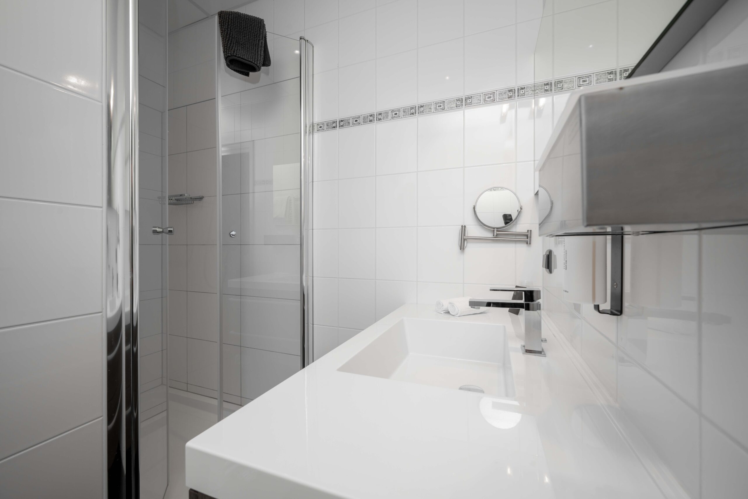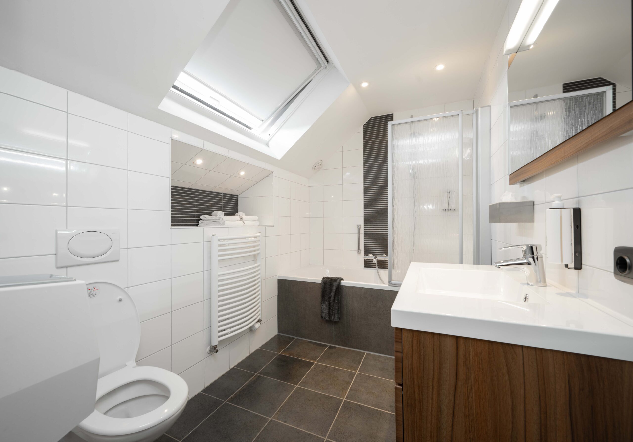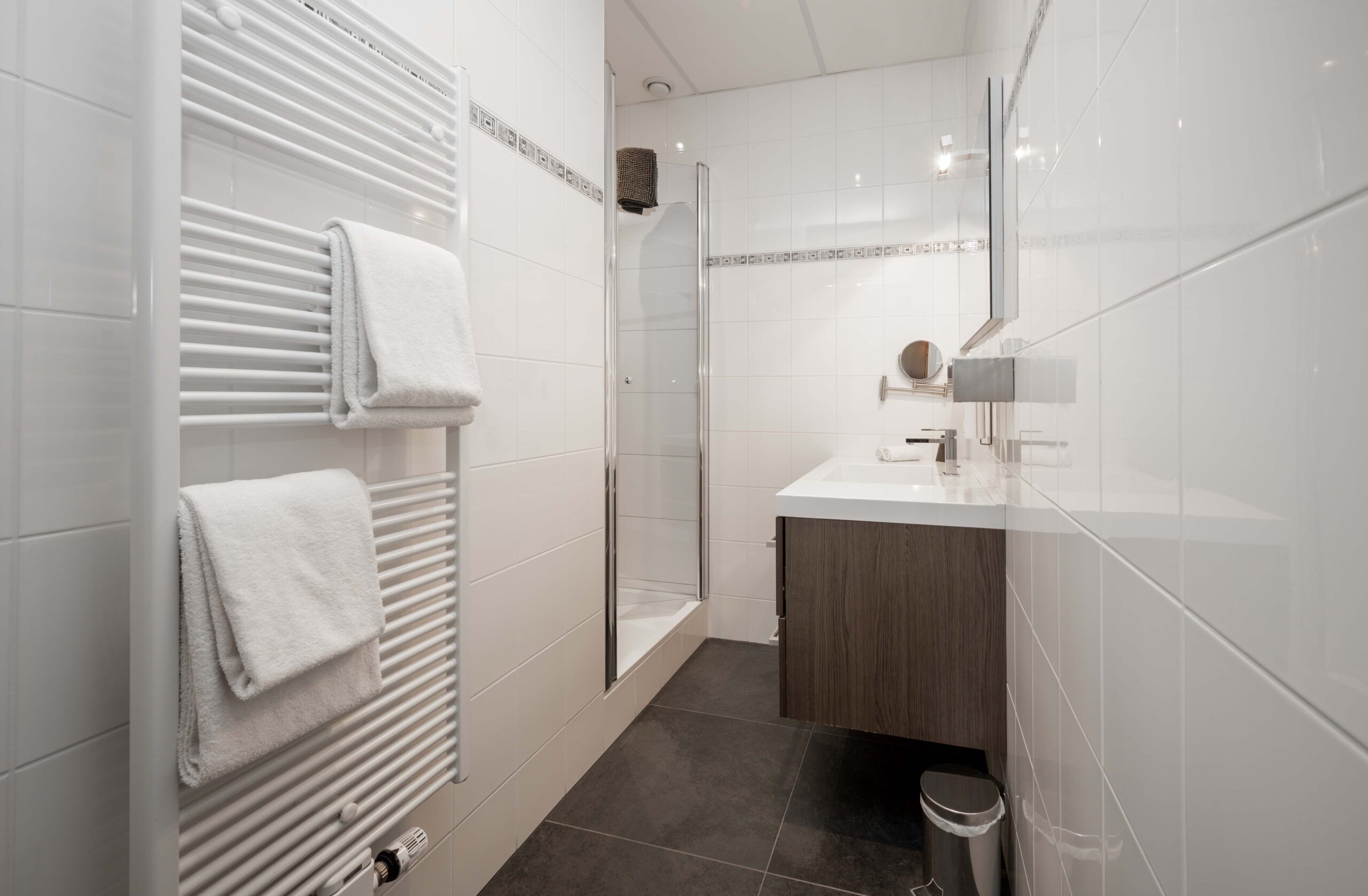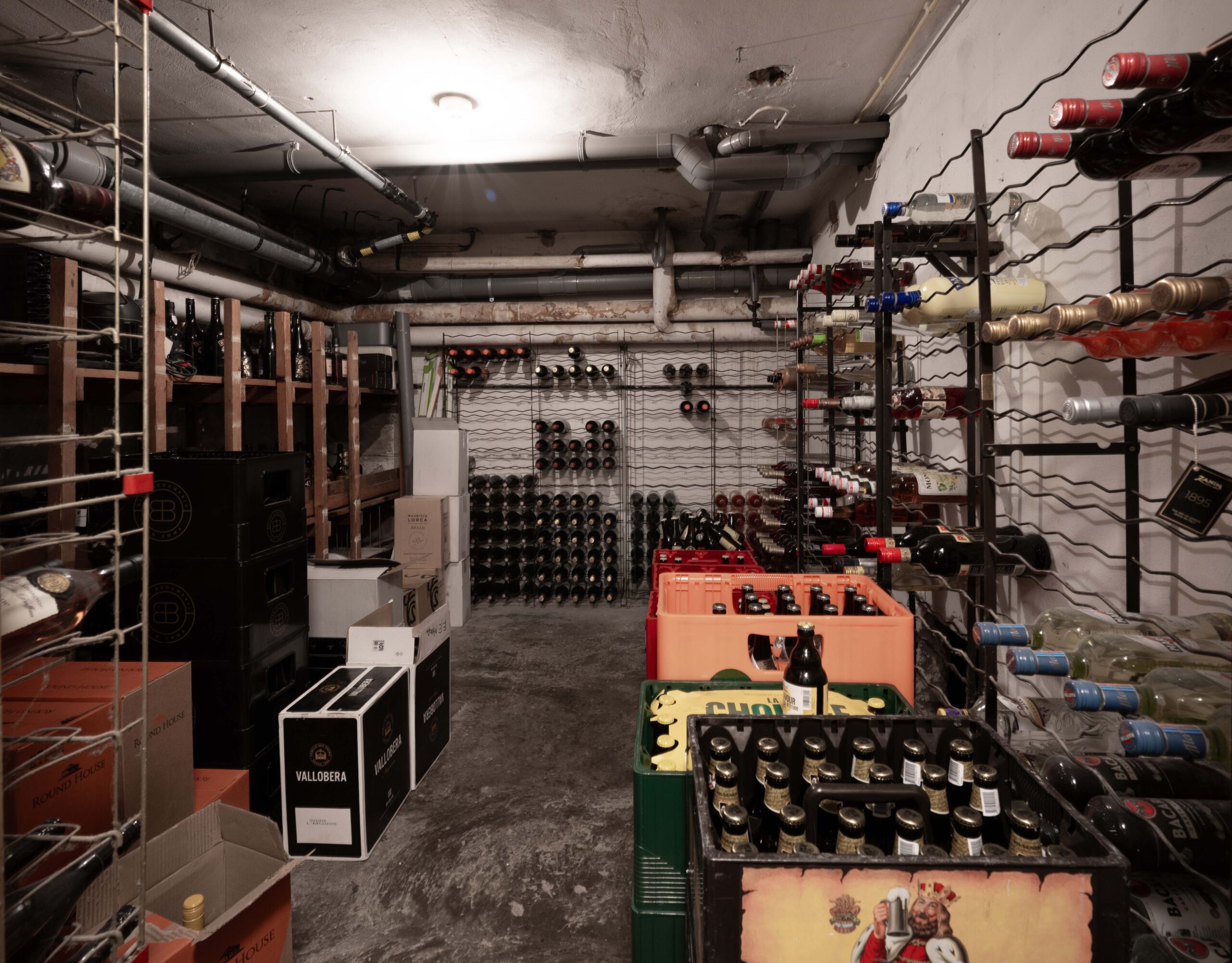 De keuken is zowel via een ingang naast het buffet als rechtstreeks vanuit het restaurant bereikbaar. Het is een opvallend ruime en goed uitgeruste keuken, ideaal voor een hotel-restaurant van dit formaat. Je vindt er onder andere zeven gaspitten, een warmhoudplaat voor soepen, een elektrische plaat voor vlees en vis, één geïntegreerde frituur en twee losse frituren, twee ovens, twee magnetrons, werkbanken met koelelementen, een vacumeermachine, een ruime koelcel van circa 3×3 meter, wijnkasten en losse diepvriezers. De spoelkeuken is voorzien van een doorschuifvaatwasmachine en bevoorrading kan efficiënt via de achterzijde. Onder de keuken bevindt zich een grote kelder met extra opslagruimte en nog een diepvriezer. Daarnaast is er ook onder het ‘toneel’ in het restaurant een kelder aanwezig, wat zorgt voor nog meer praktische opslagmogelijkheden.
