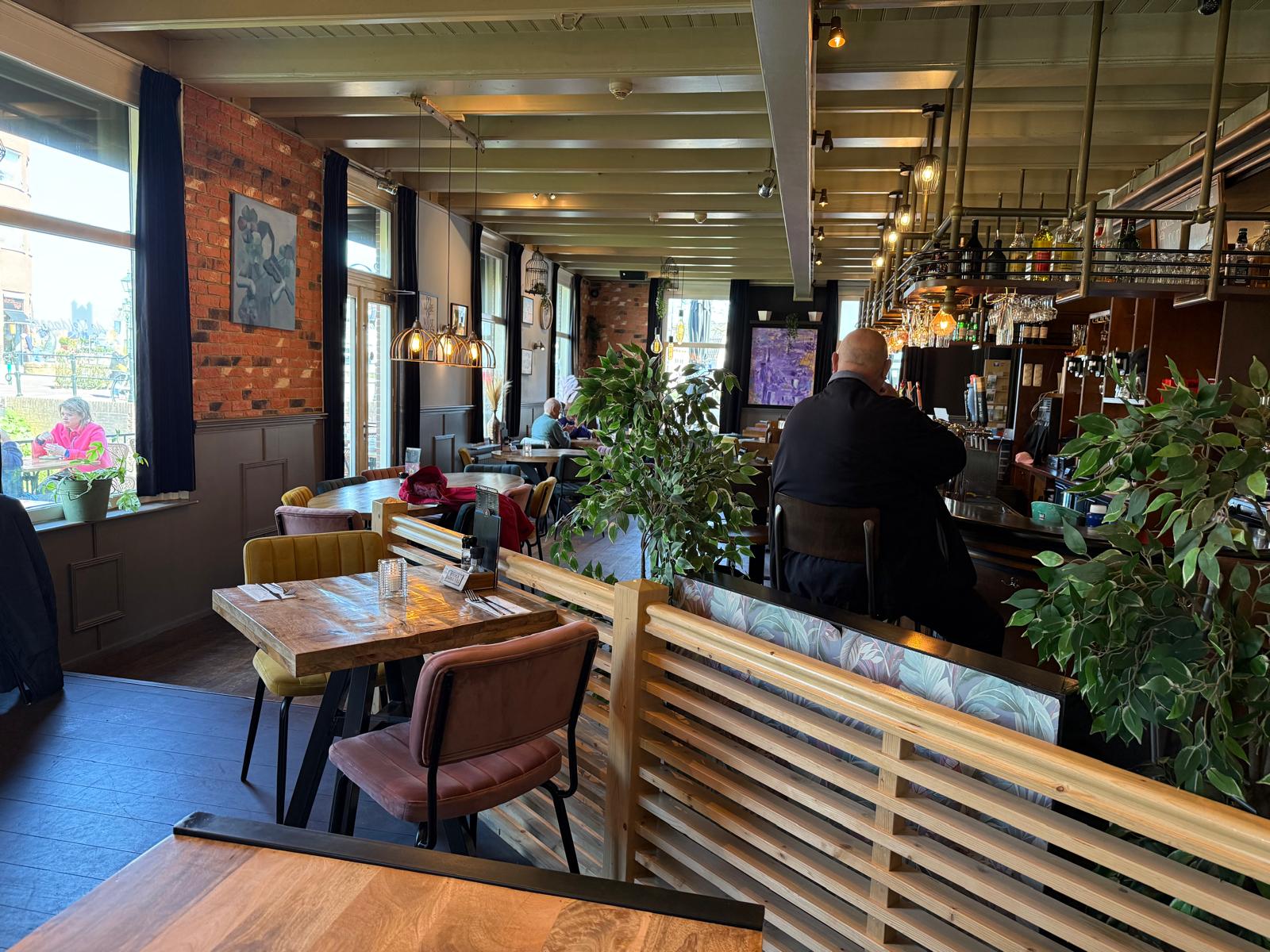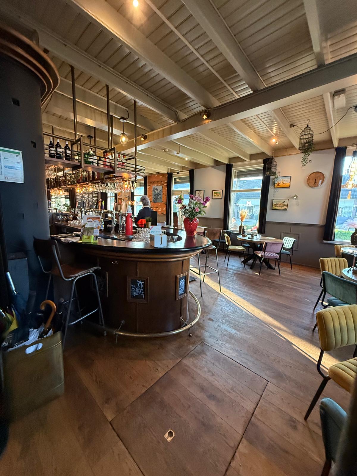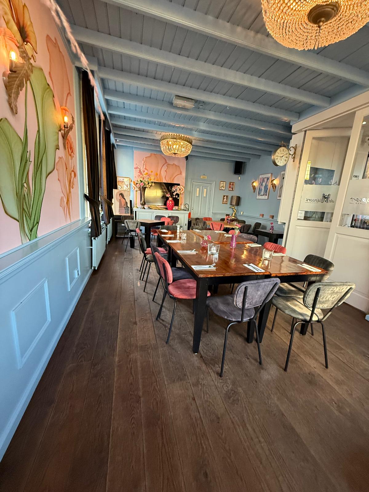 Het interieur bestaat uit rustieke houten tafels, kleurrijke stoelen en warme verlichting, wat zorgt voor een prettige en huiselijke uitstraling. Het restaurant is slim ingericht met verschillende zitgedeeltes, ideaal voor zowel intieme diners als gezellige borrels. De zwarte wanden met artistieke decoraties en krijtbordillustraties geven de ruimte een eigentijdse en persoonlijke uitstraling. Grote ramen zorgen voor veel natuurlijk licht en bieden een mooi uitzicht op de omgeving.