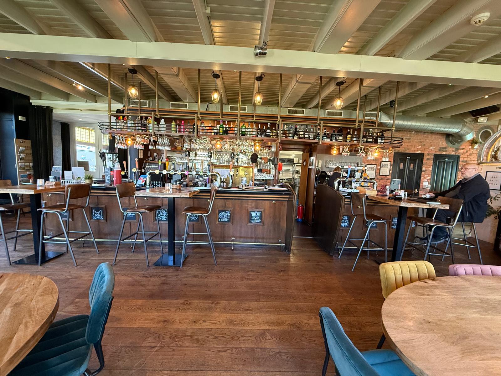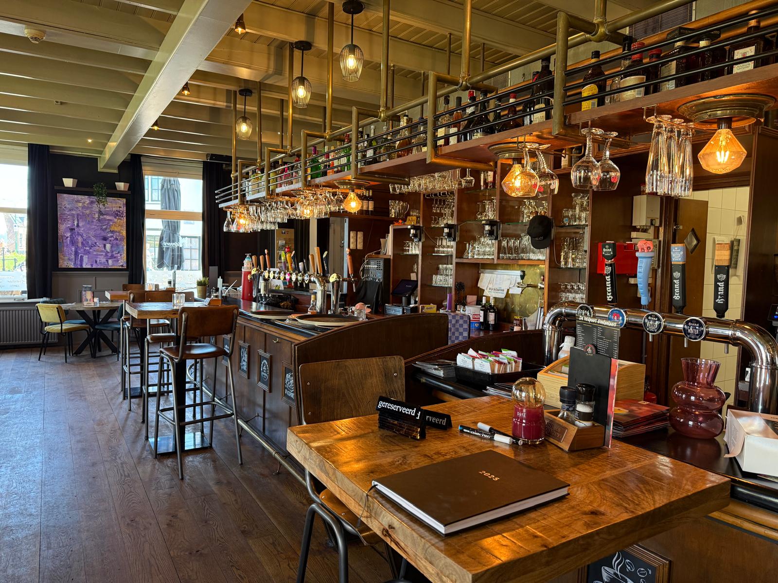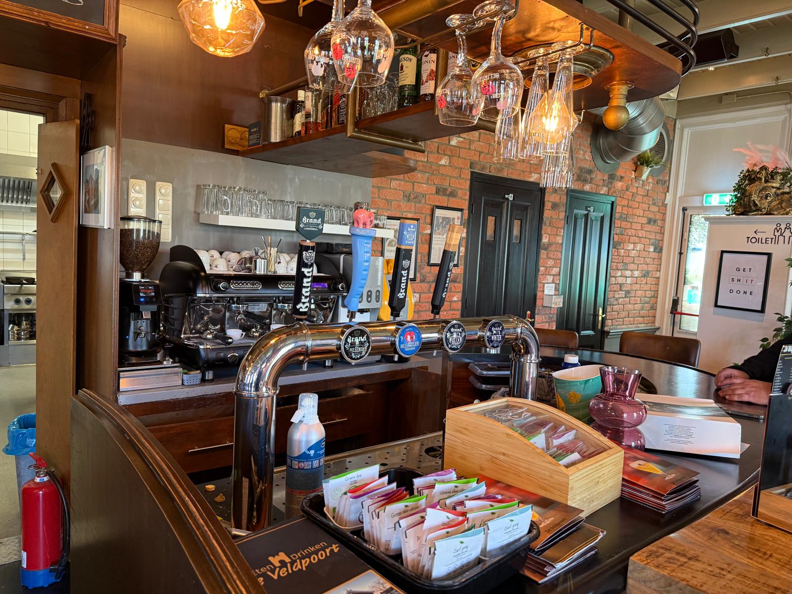 De bar, met een indrukwekkende keuze aan bieren op de tap, is het centrale punt van het restaurant. Gasten kunnen hier verschillende drankjes bestellen, terwijl ze genieten van de ontspannen sfeer. De combinatie van moderne elementen en warme houten accenten maakt De Veldpoort een bijzondere plek om te eten en drinken in een prettige omgeving.