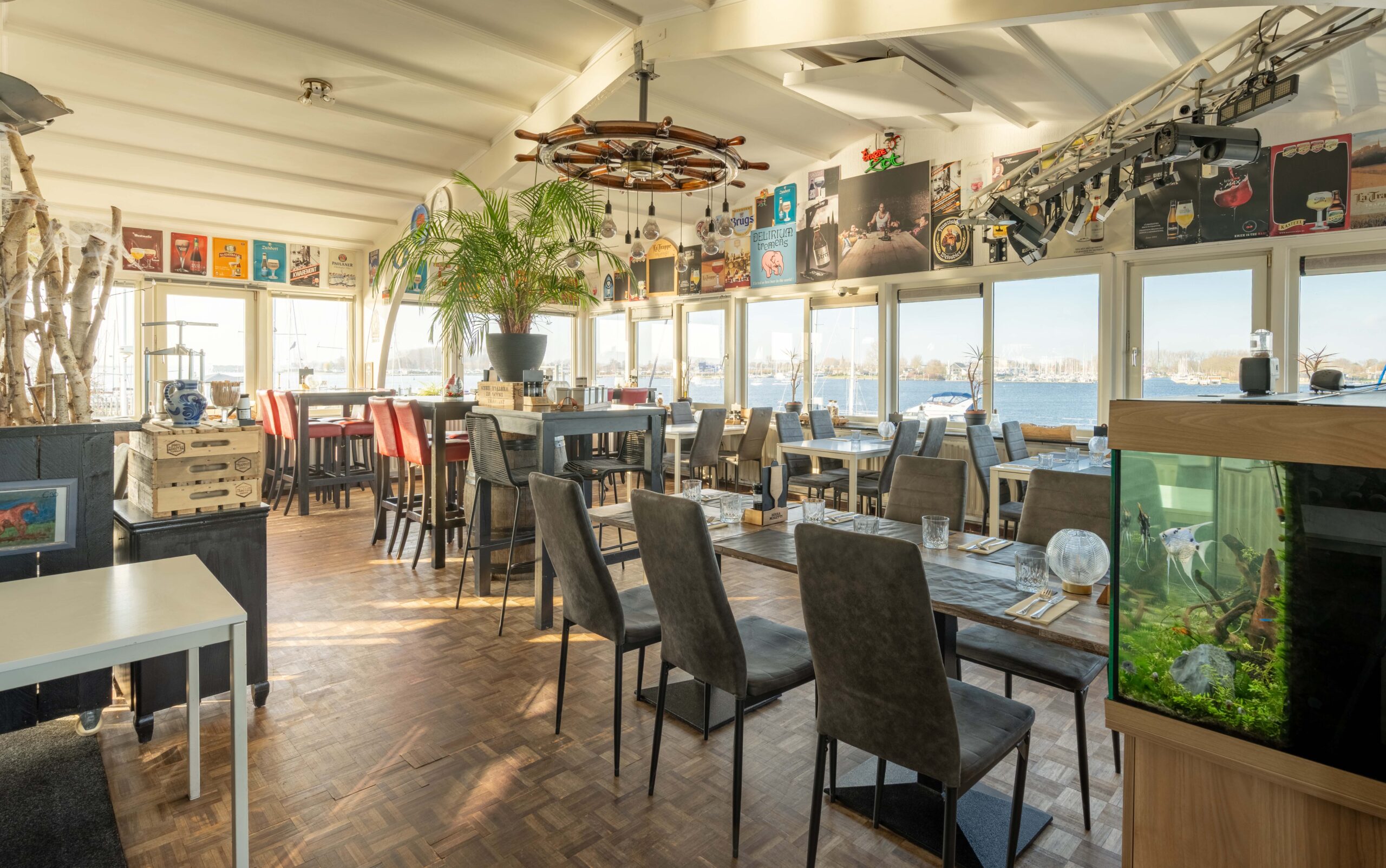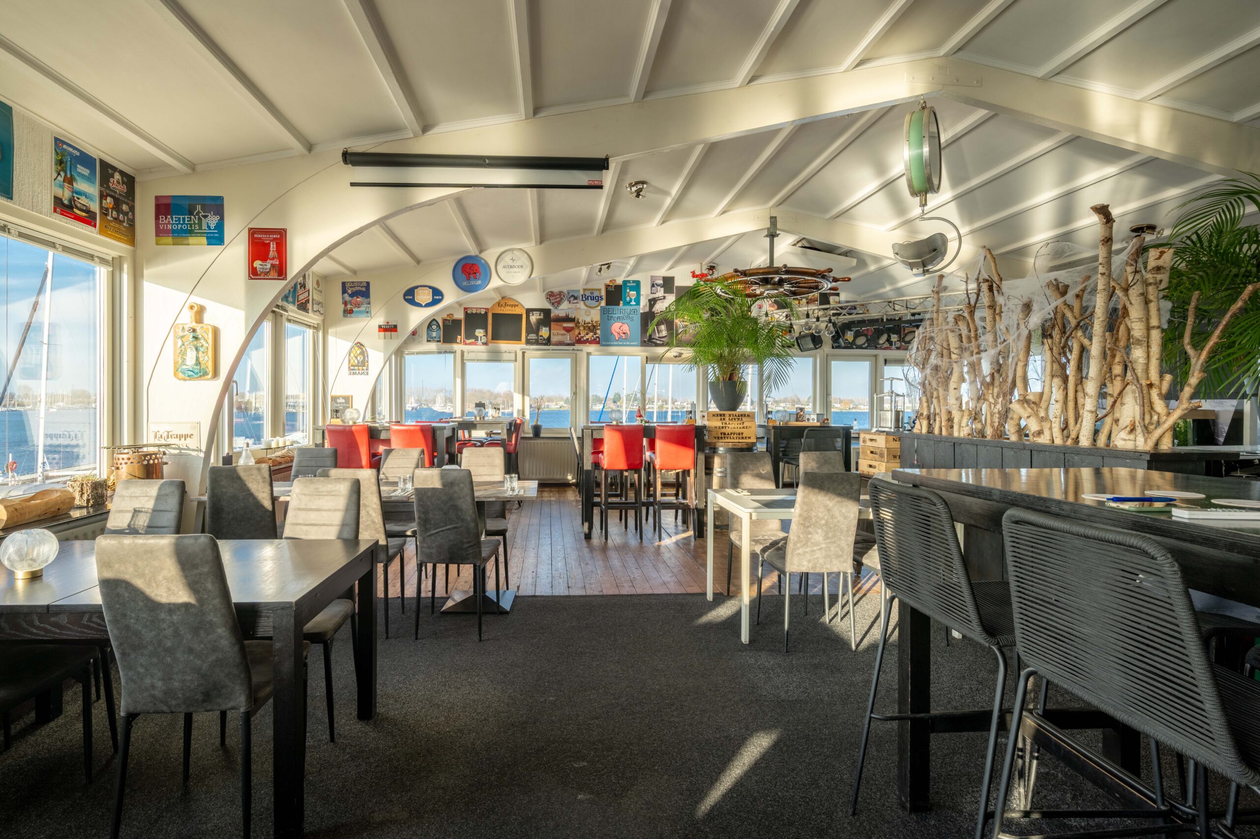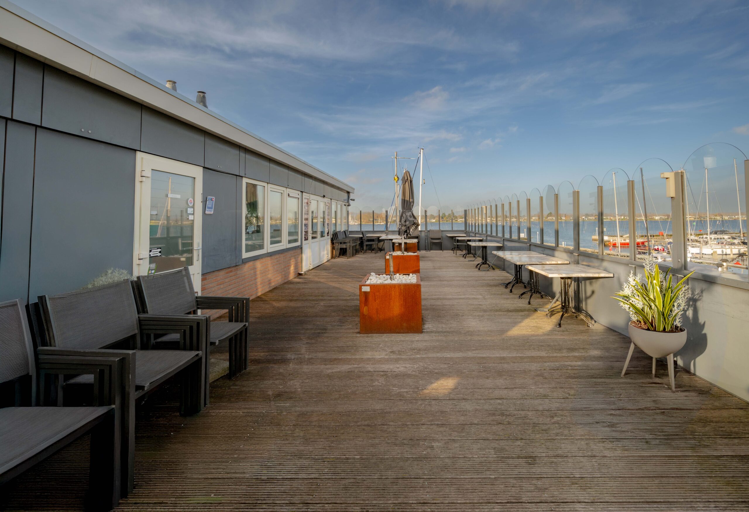 Het royale terras is een echte eyecatcher en biedt plek aan zo’n 40 gasten. Iedereen kan hier genieten van het prachtige uitzicht, dat reikt tot aan Kortgene aan de overkant. Met heaters, parasols, warme dekens en glazen windschermen is het terras het hele jaar door een comfortabele plek om te zitten en te genieten van het water en de zon.