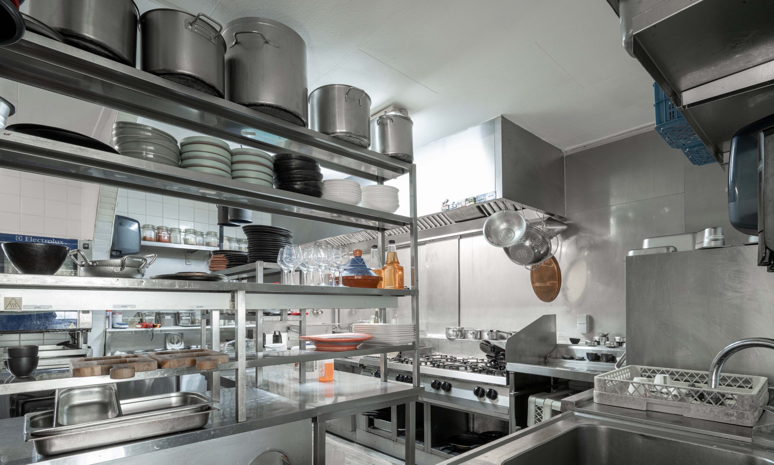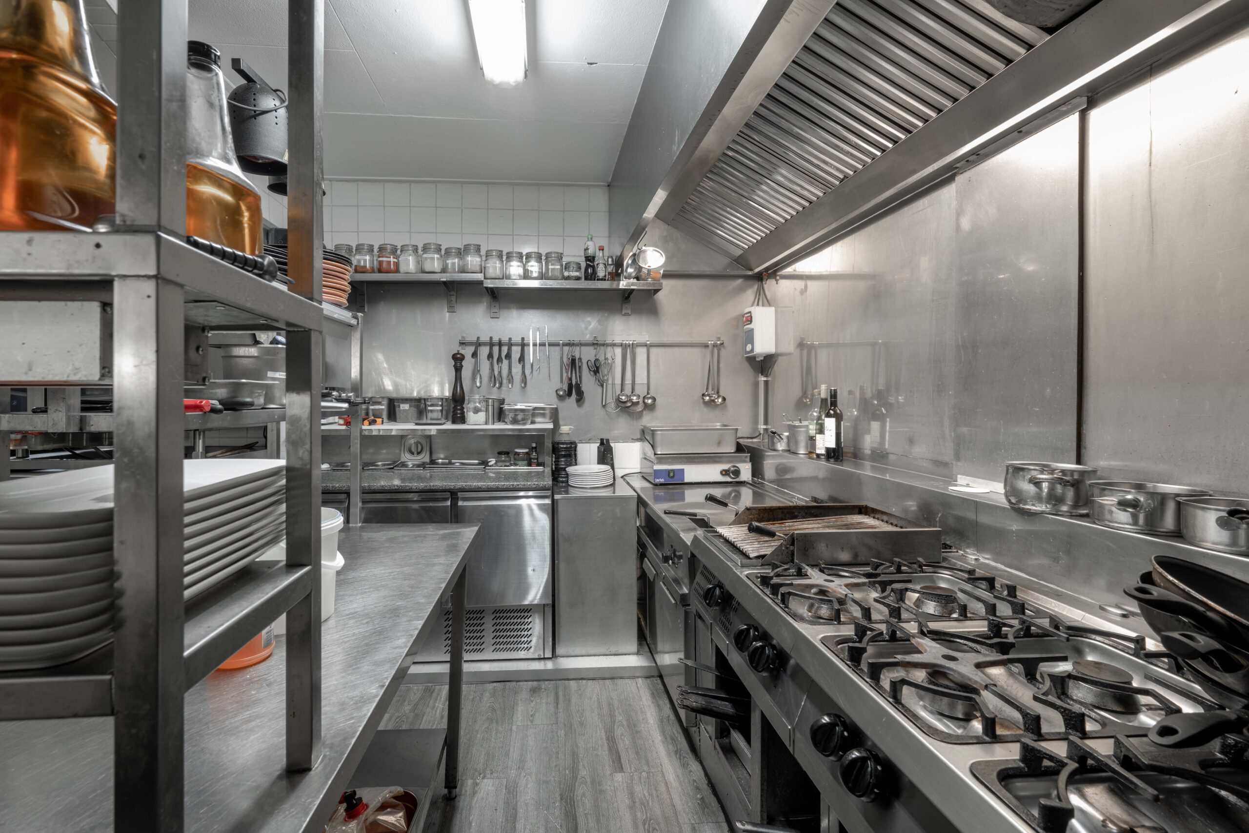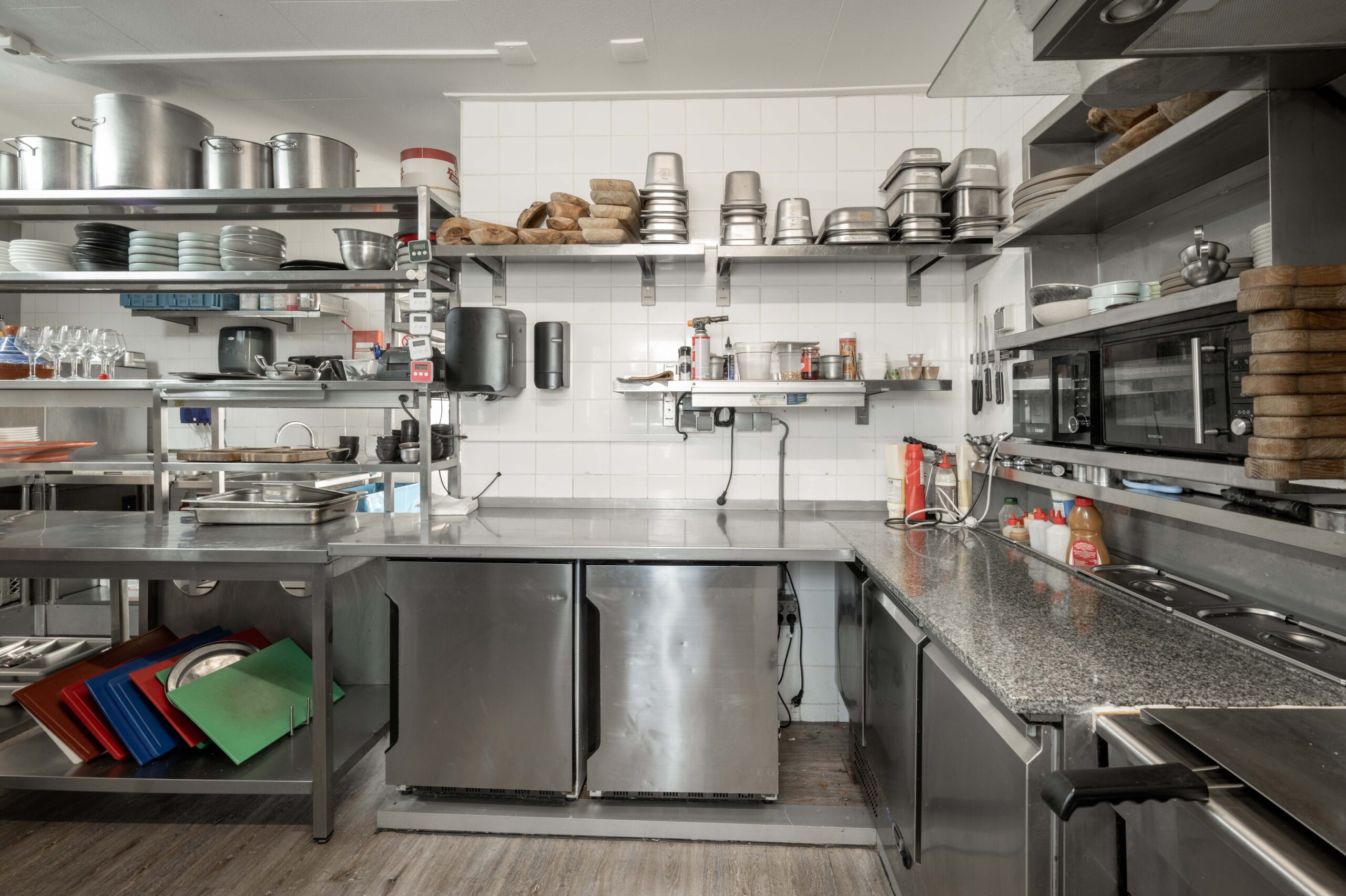 Vanuit de bar loop je zo de keuken binnen, die is ingedeeld in een warme-, koude-, uitgifte- en afwaskant. Er is volop ruimte voor een team van drie koks en 1 afwasser. De keukenapparatuur is in uitstekende staat: gewoon aanschakelen en aan de slag. Zo vind je er onder andere een lavagrill, combisteamer, zes gaspitten, bakplaat, vaatwasmachine, twee gekoelde RVS-werkbanken met saladière, vriezers en koelingen; volledig uitgevoerd in RVS. ’s Zomers kunnen de keukendeuren naar het terras open en worden daar nog eens twee barbecues geplaatst, wat elk seizoen extra sfeer en gezelligheid toevoegt.