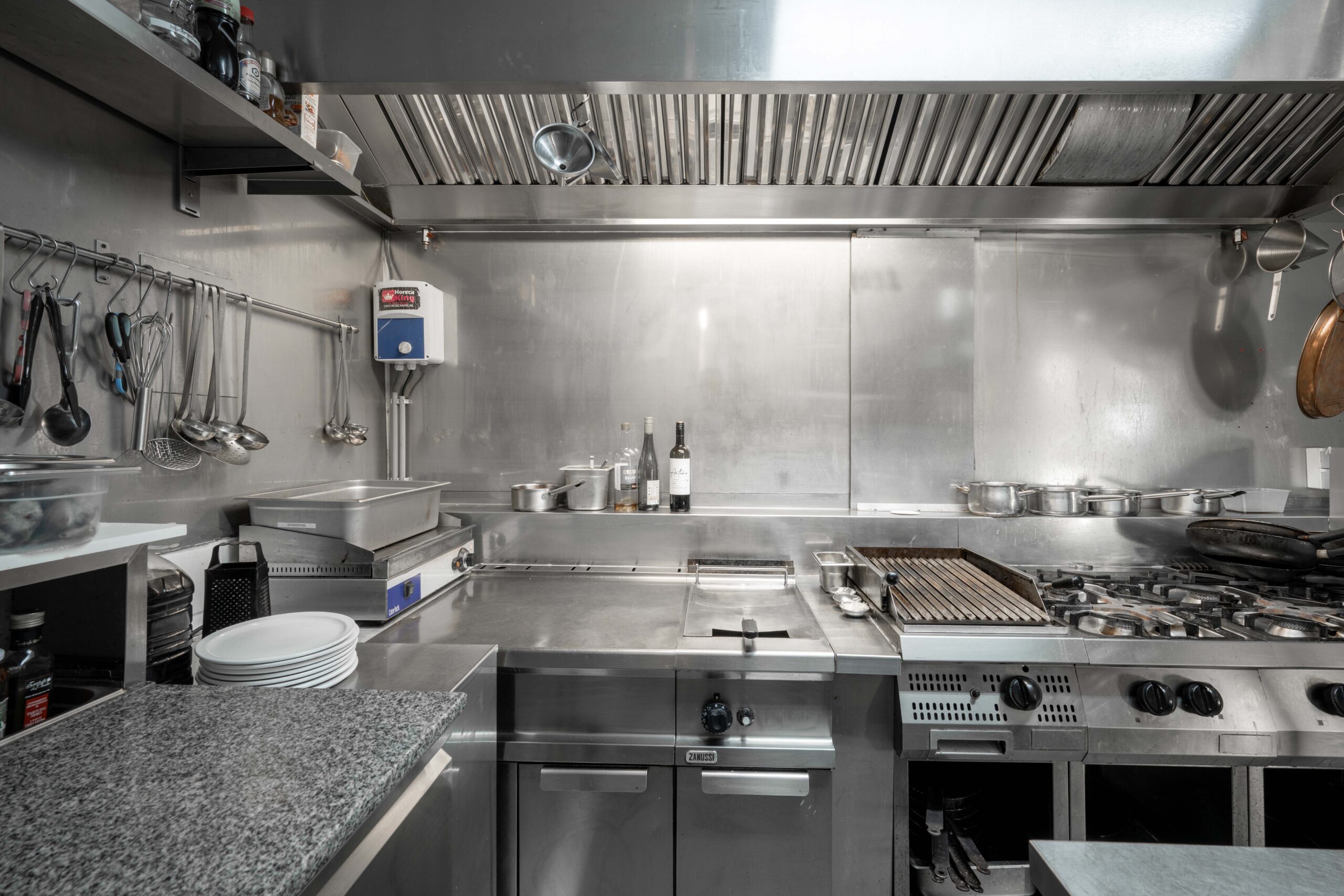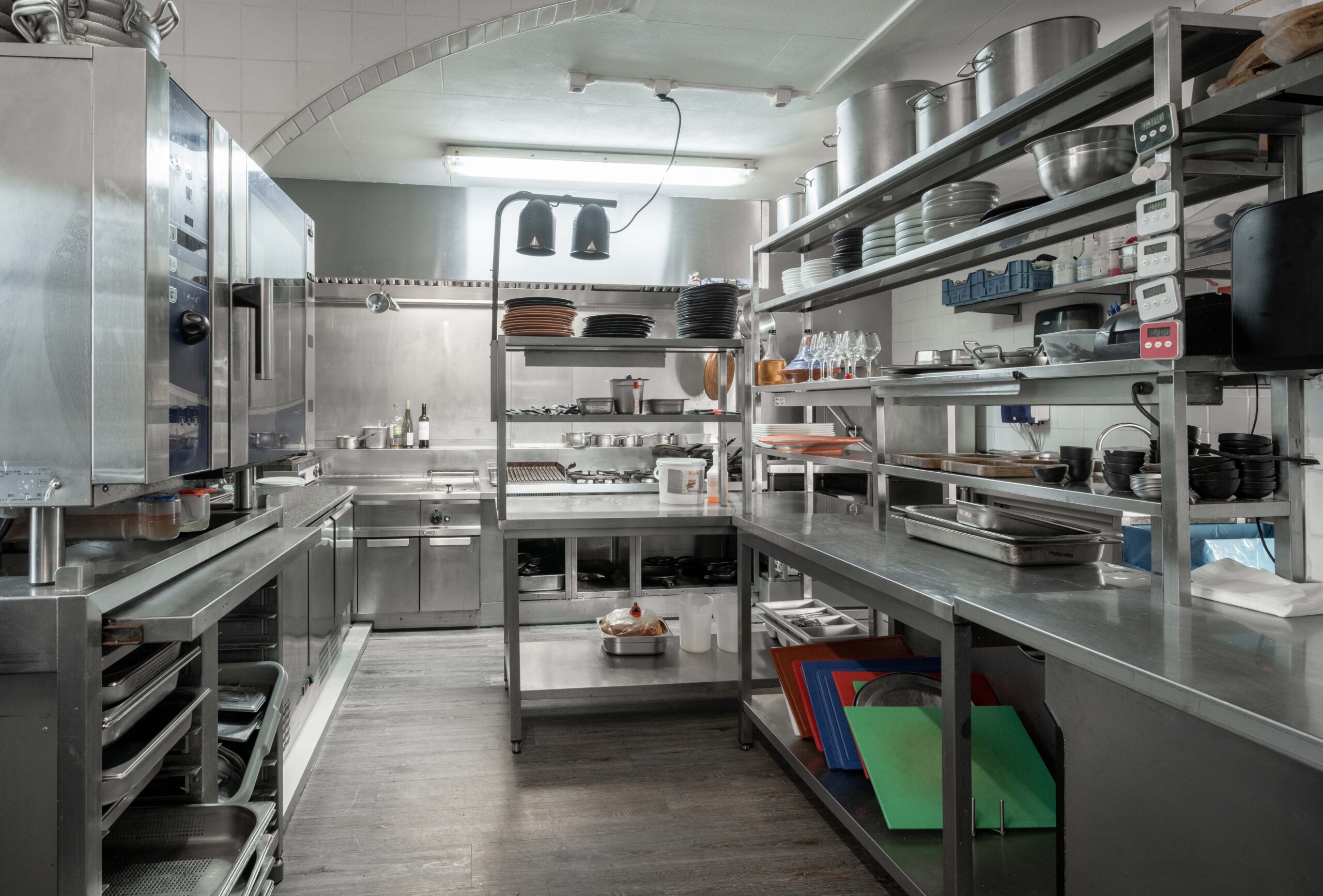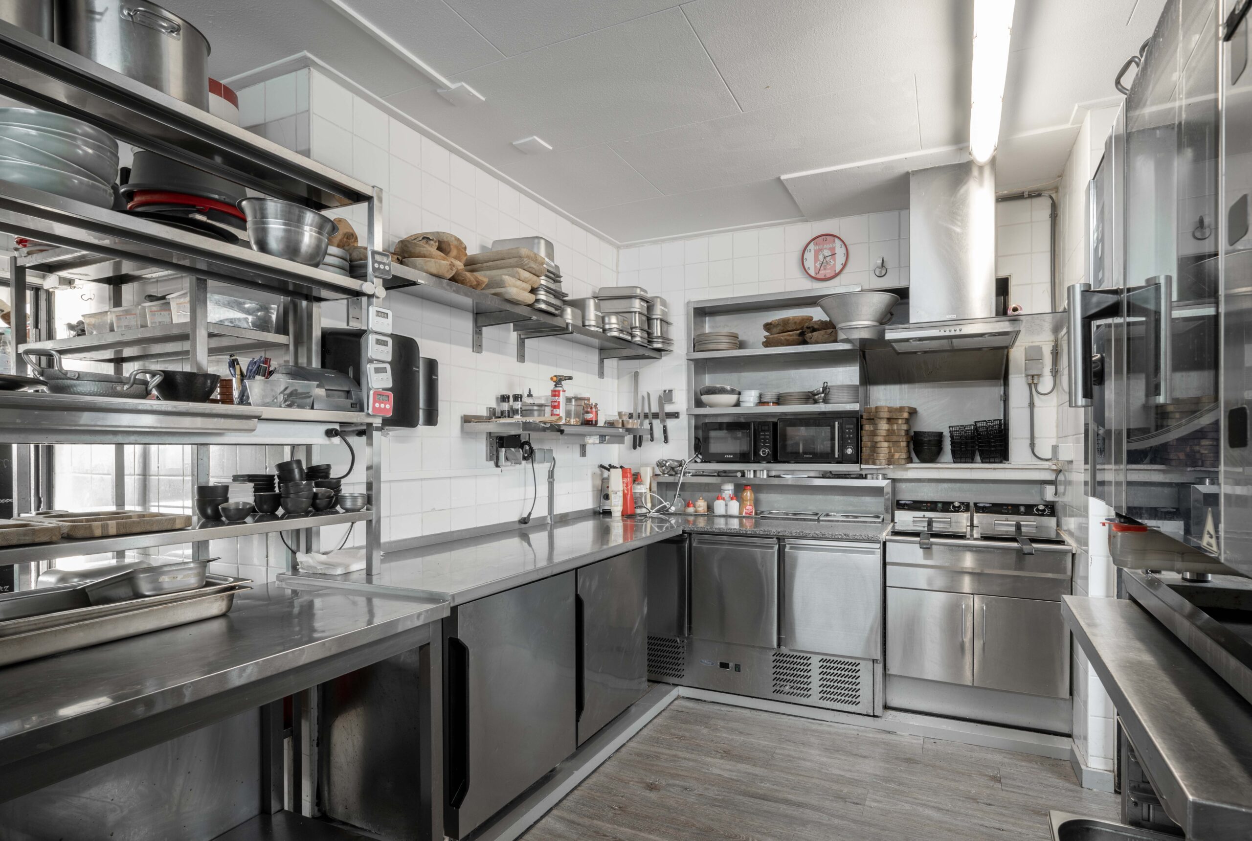 Vanuit de bar loop je zo de keuken binnen, die is ingedeeld in een warme-, koude-, uitgifte- en afwaskant. Er is volop ruimte voor een team van drie koks en 1 afwasser. De keukenapparatuur is in uitstekende staat: gewoon aanschakelen en aan de slag. Zo vind je er onder andere een lavagrill, combisteamer, zes gaspitten, bakplaat, vaatwasmachine, twee gekoelde RVS-werkbanken met saladière, vriezers en koelingen; volledig uitgevoerd in RVS. ’s Zomers kunnen de keukendeuren naar het terras open en worden daar nog eens twee barbecues geplaatst, wat elk seizoen extra sfeer en gezelligheid toevoegt.