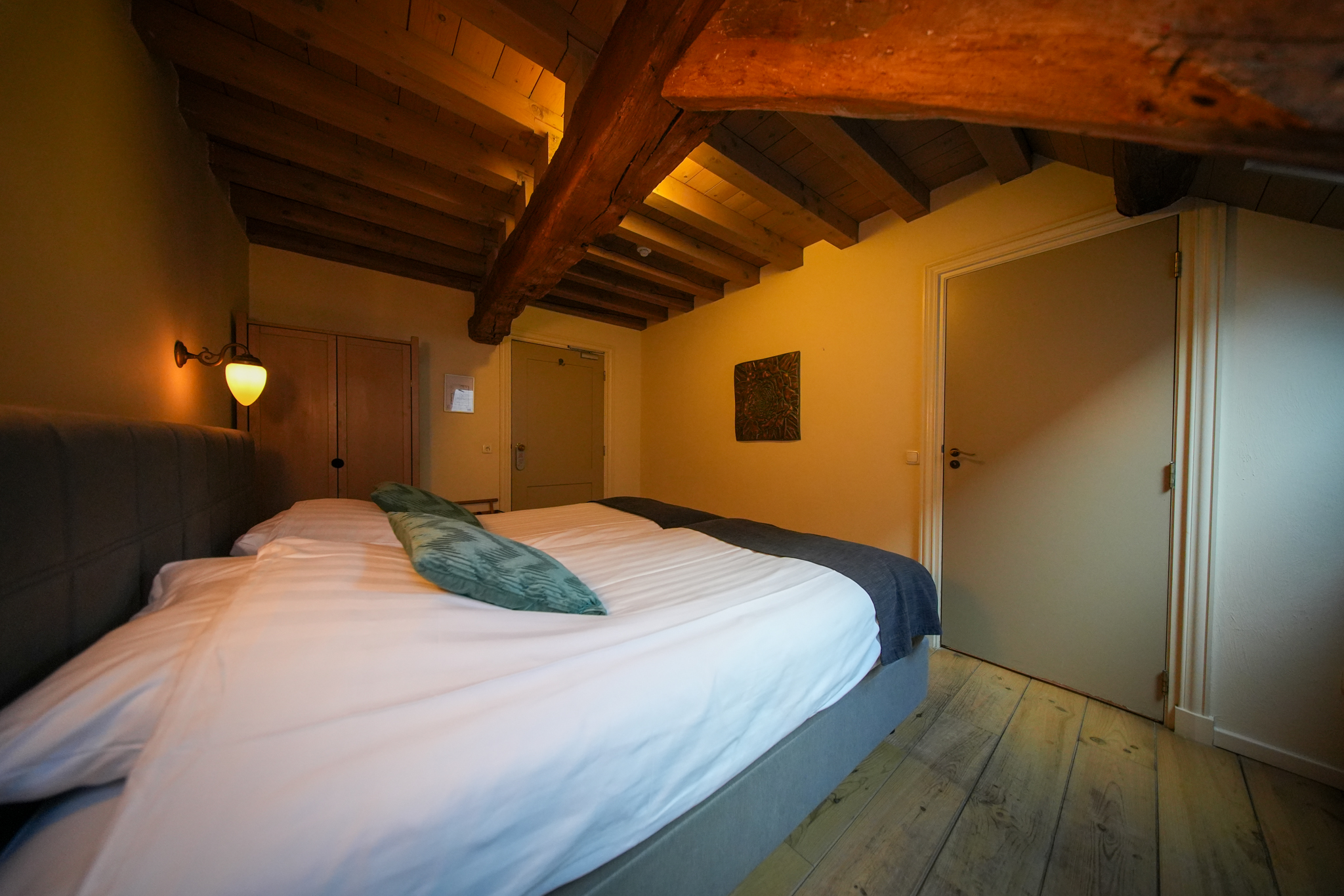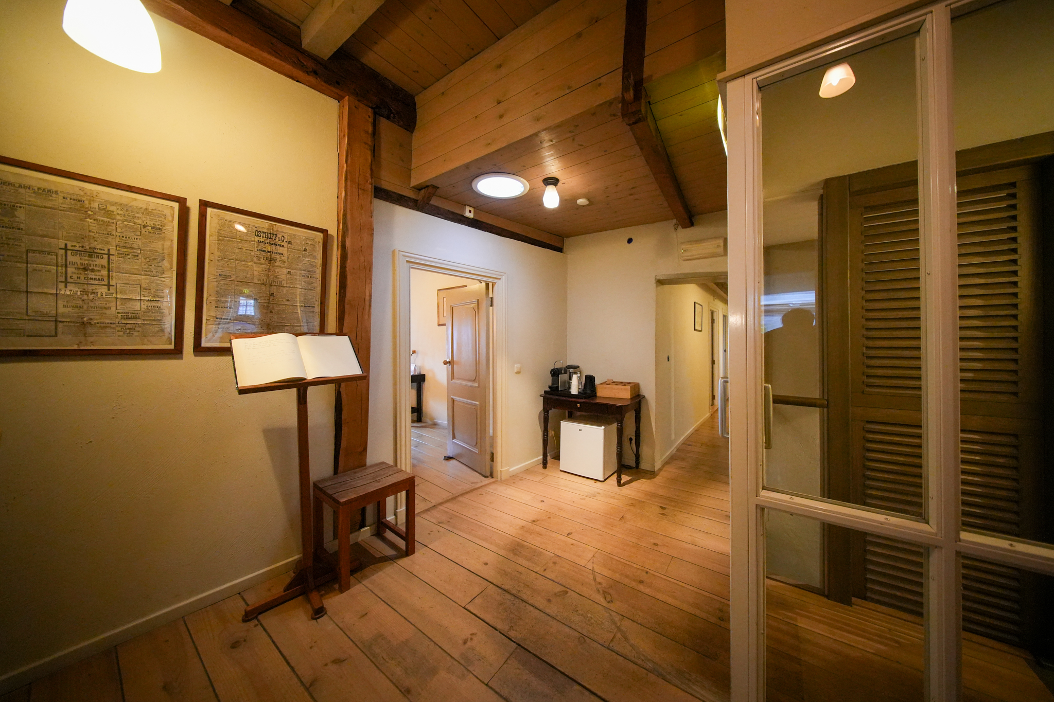 Op de eerste verdieping vindt men 7 x 2-persoonskamers en de suite. Allen voorzien van eigen sanitair. Tevens vindt men op deze verdieping de wasruimte en een personeelsruimte.