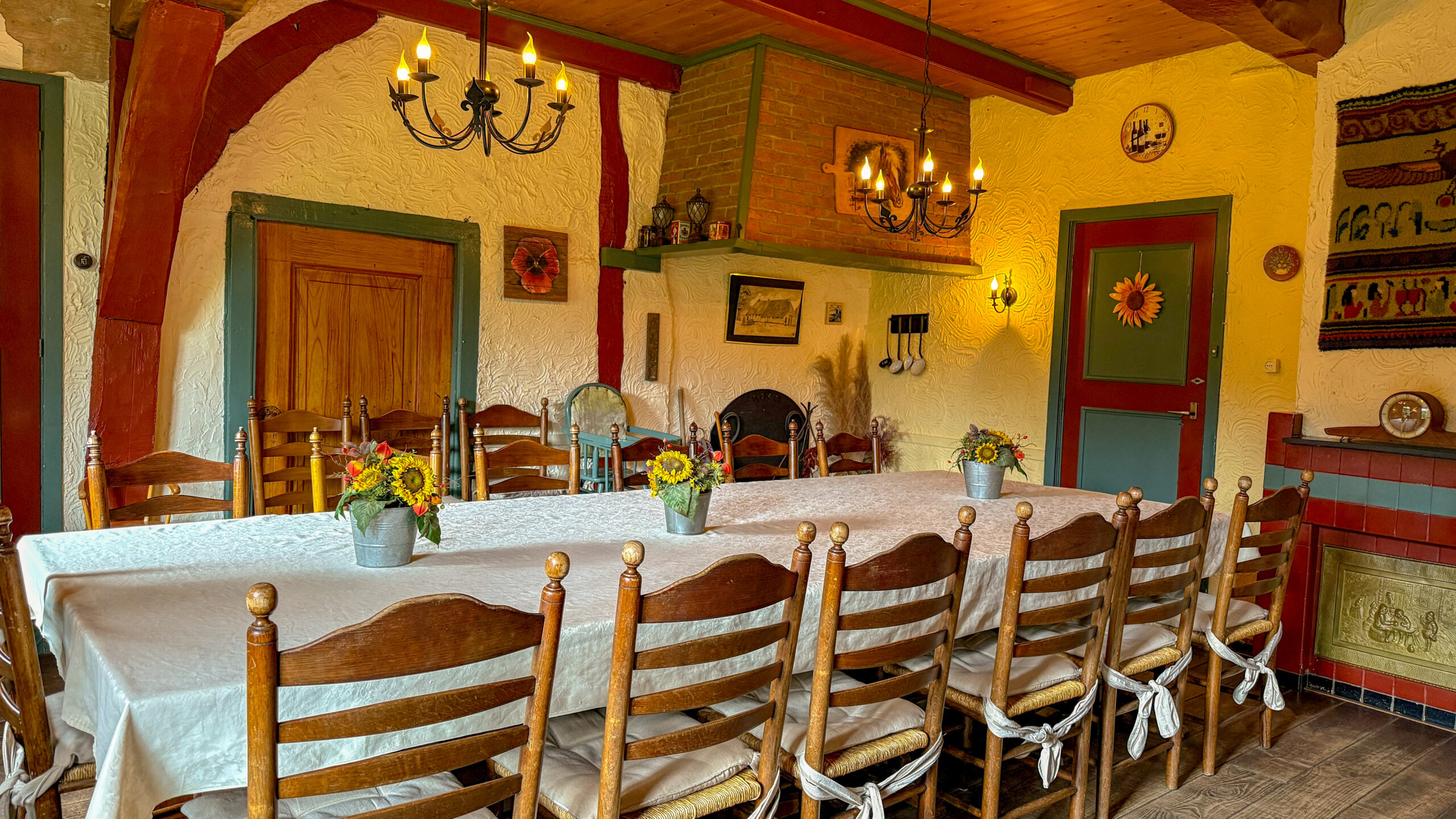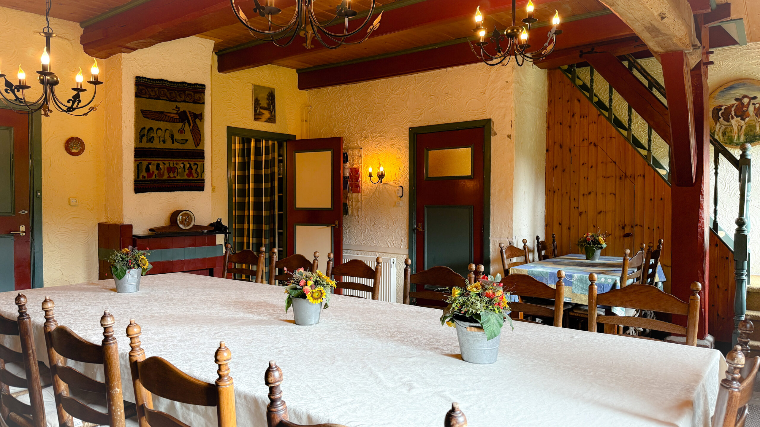 • Een royale eetkamer voor maximaal 20 personen, tuingericht en direct naast de keuken gelegen.
