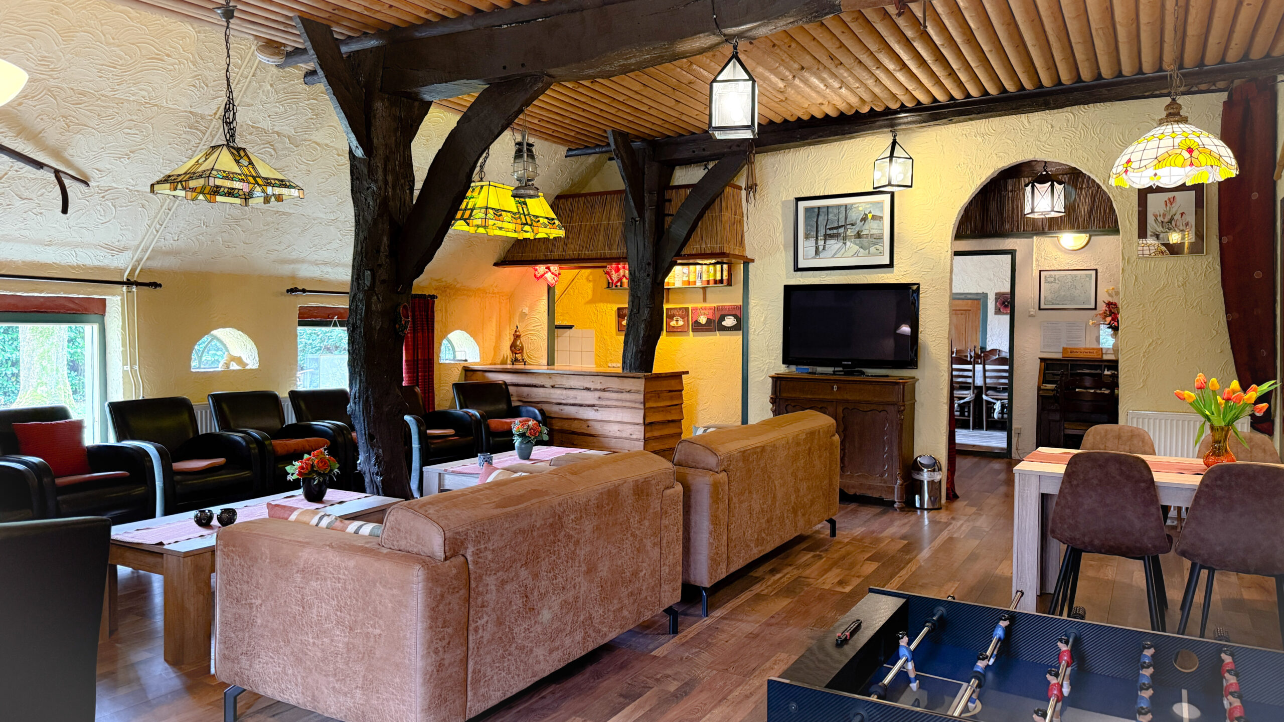• Een indrukwekkende woon-/recreatieruimte in de voormalige deel, voorzien van zithoeken, bar, koelingen, tv-hoek en diverse spelmogelijkheden.