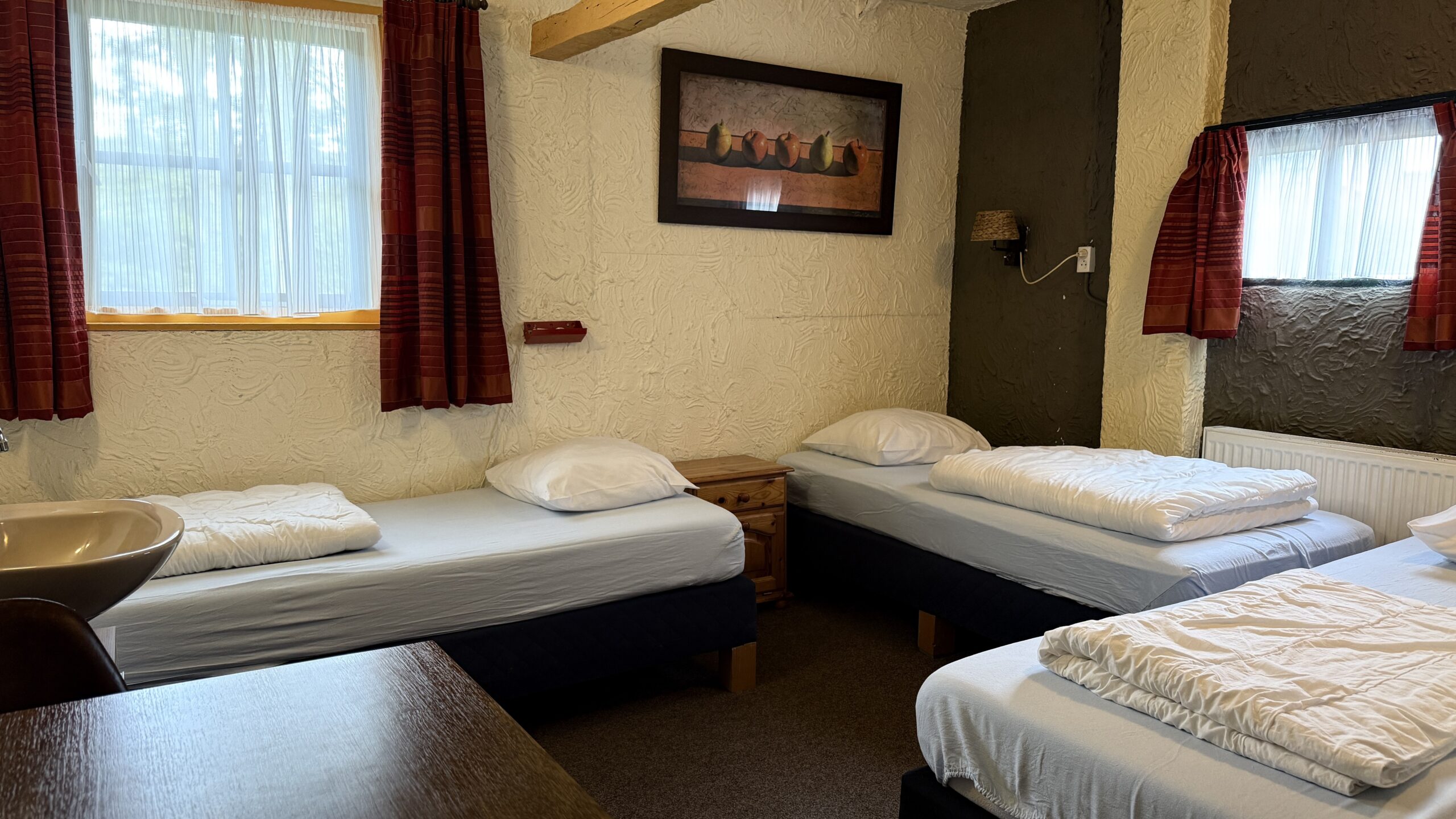 • 4 slaapkamers op de begane grond (3-persoons), met wastafel op de kamer en gezamenlijke douche- en toiletruimte op de gang.
