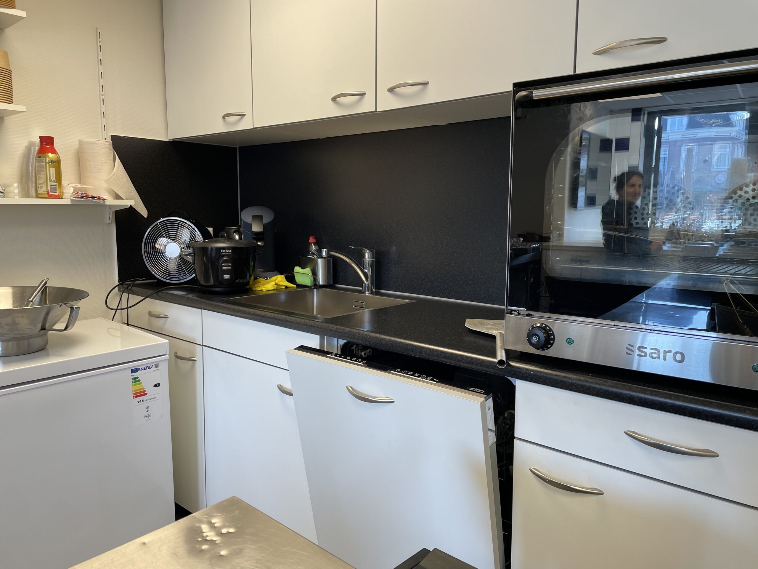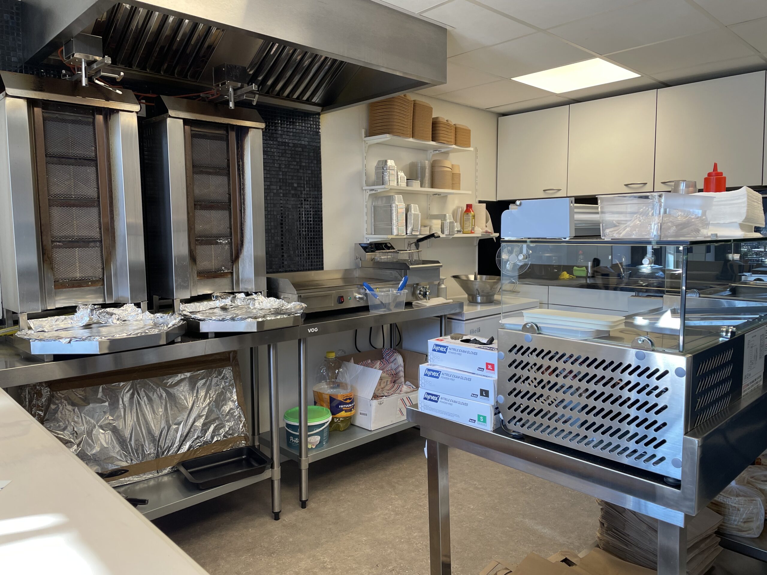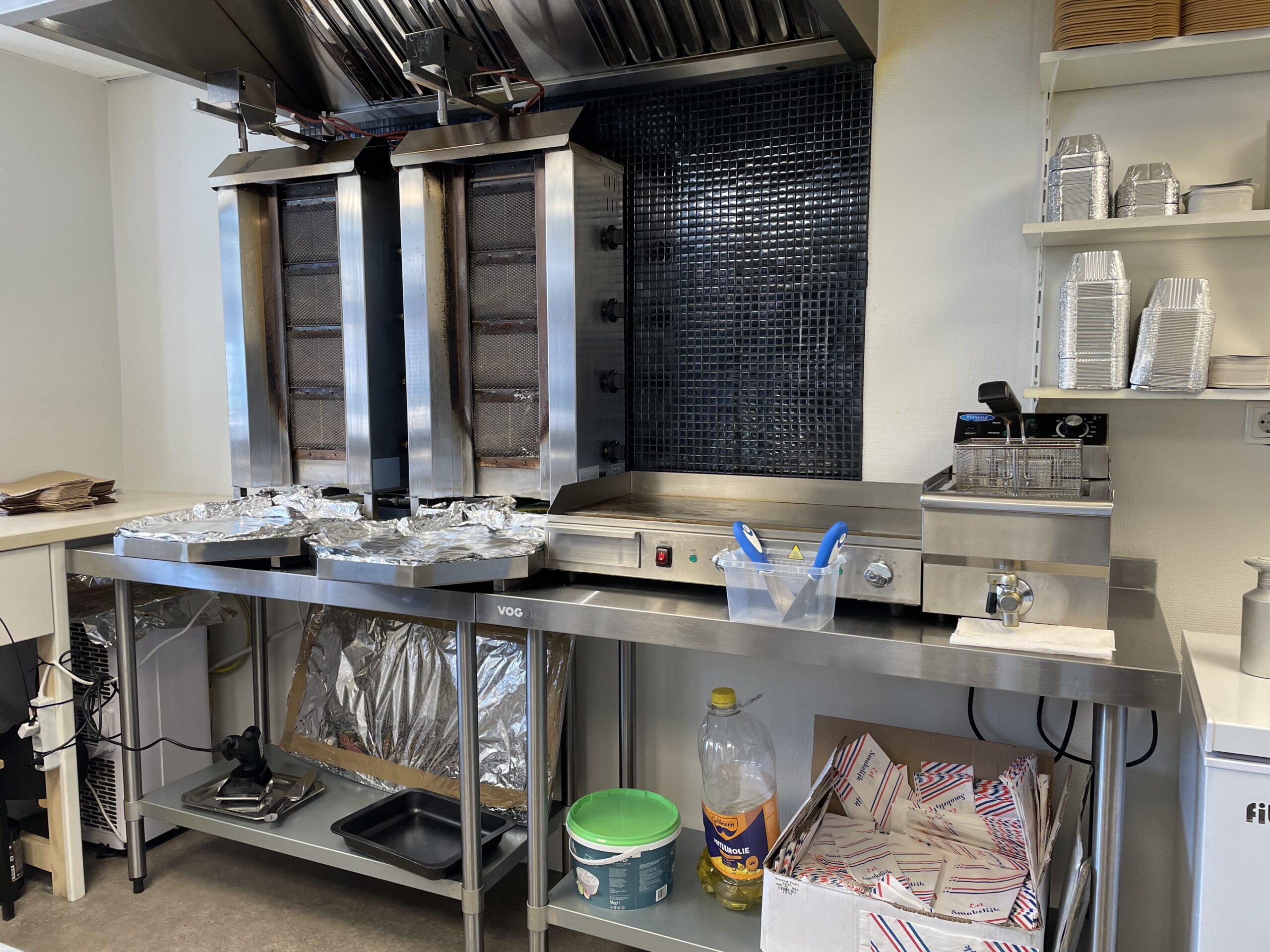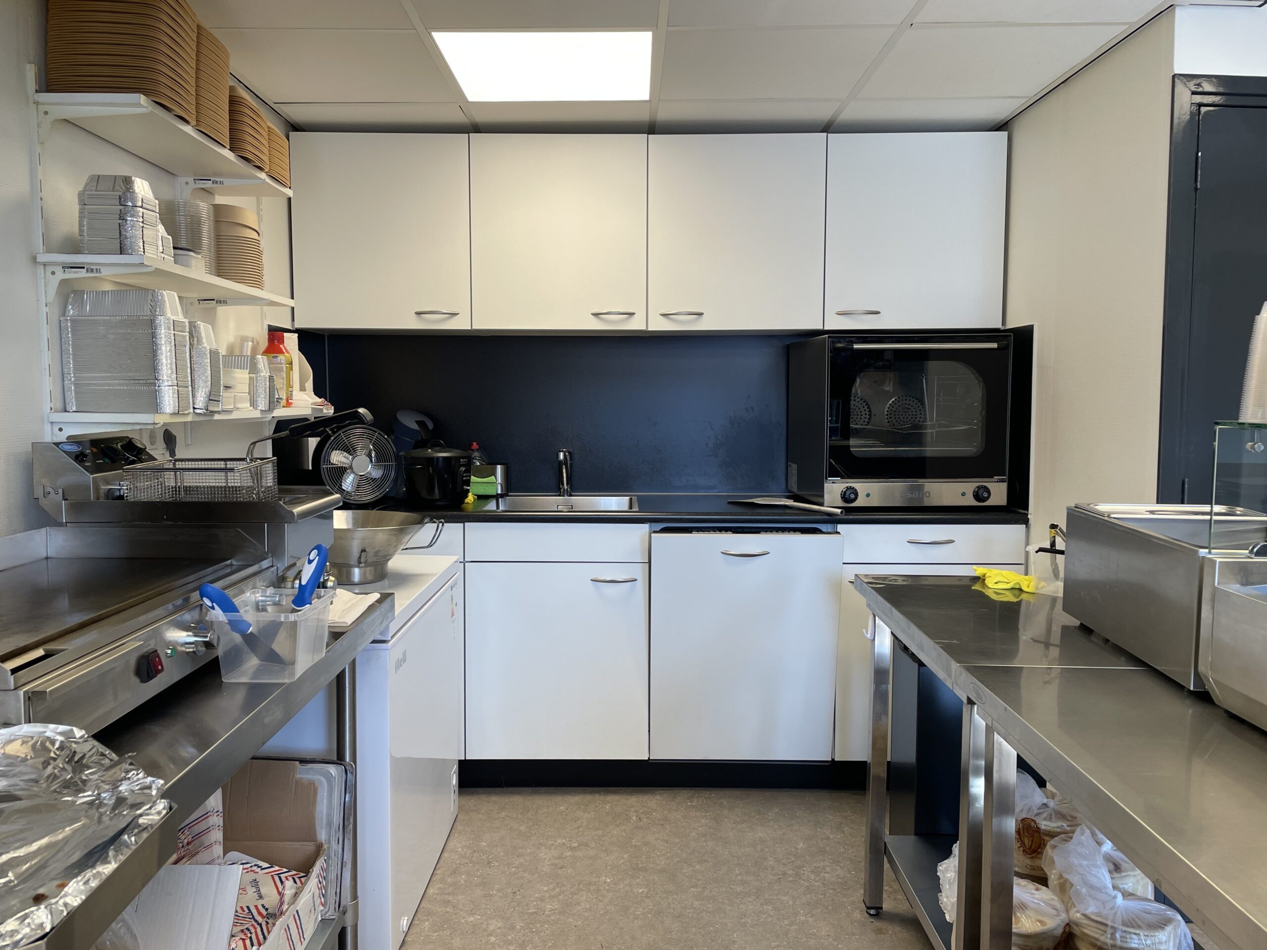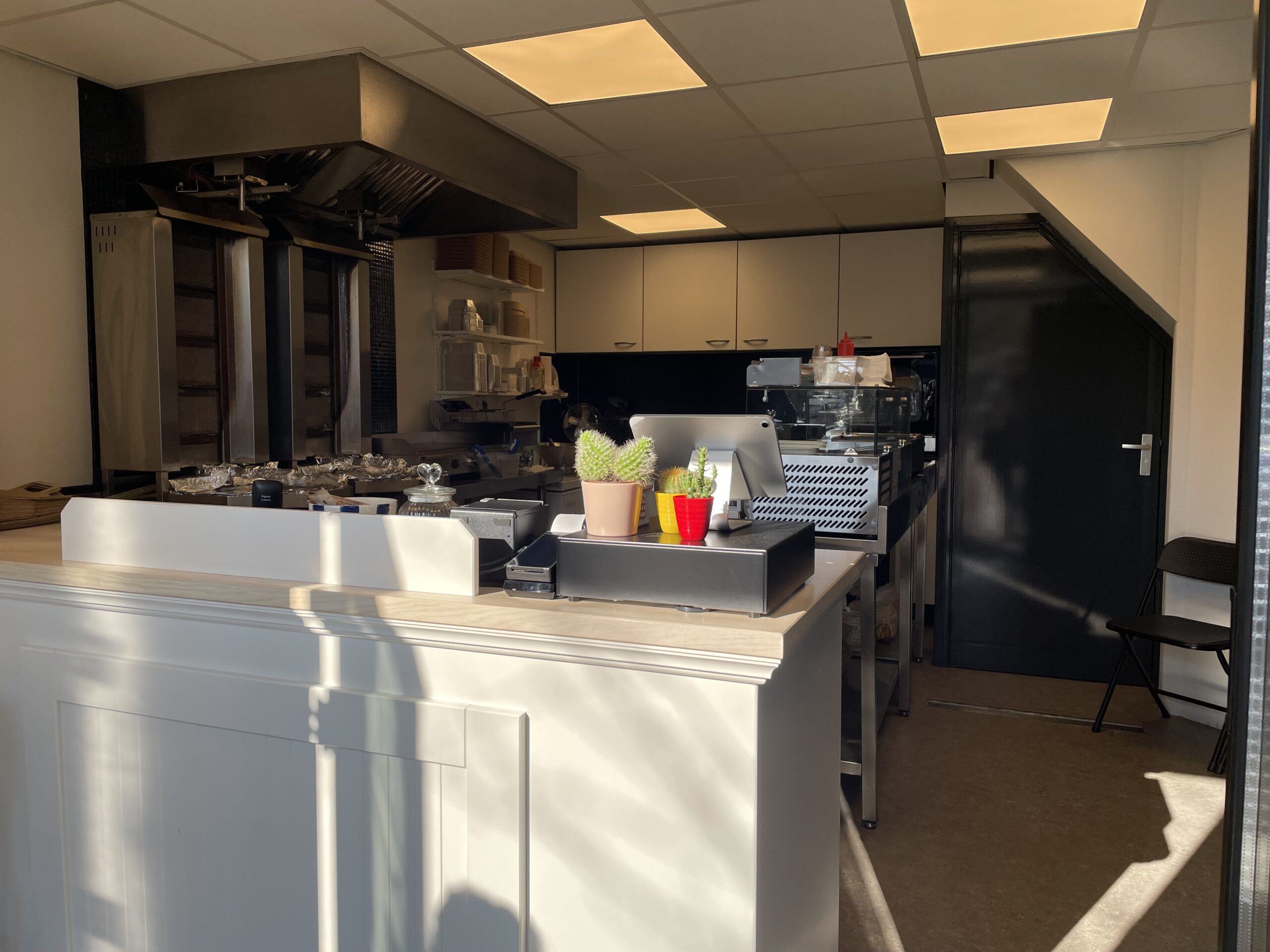 Via de trendy entree bereikt u de verkoopbalie. Aan de linkerkant hangt een tv en aan de rechterkant staat een koelkast met diverse frisdranken. Achter de verkoopbalie bevindt zich de volledig uitgeruste keuken. Rechts van de keuken bevindt zich een toilet. Naast de koelkast bevindt zich de meterkast.