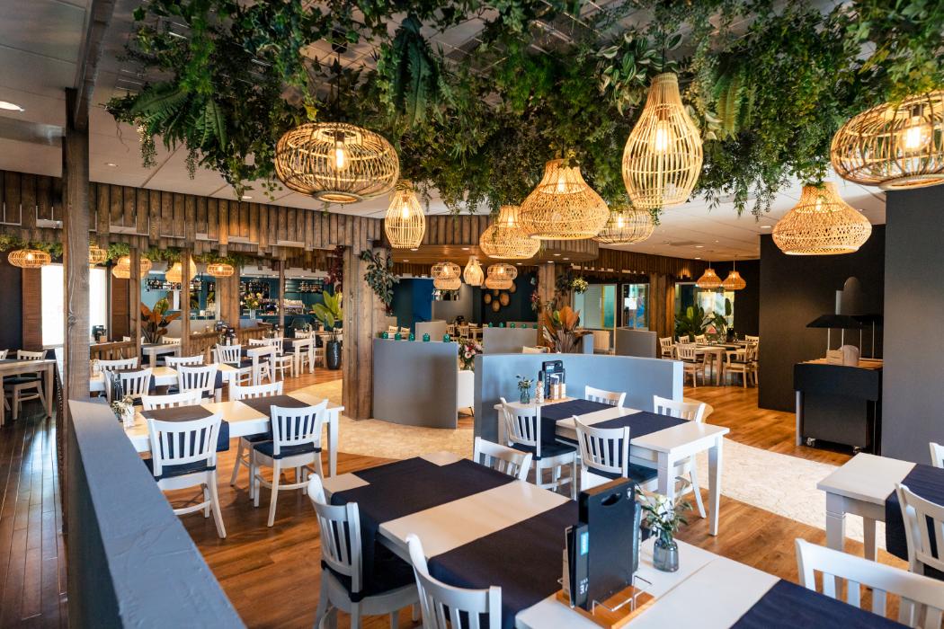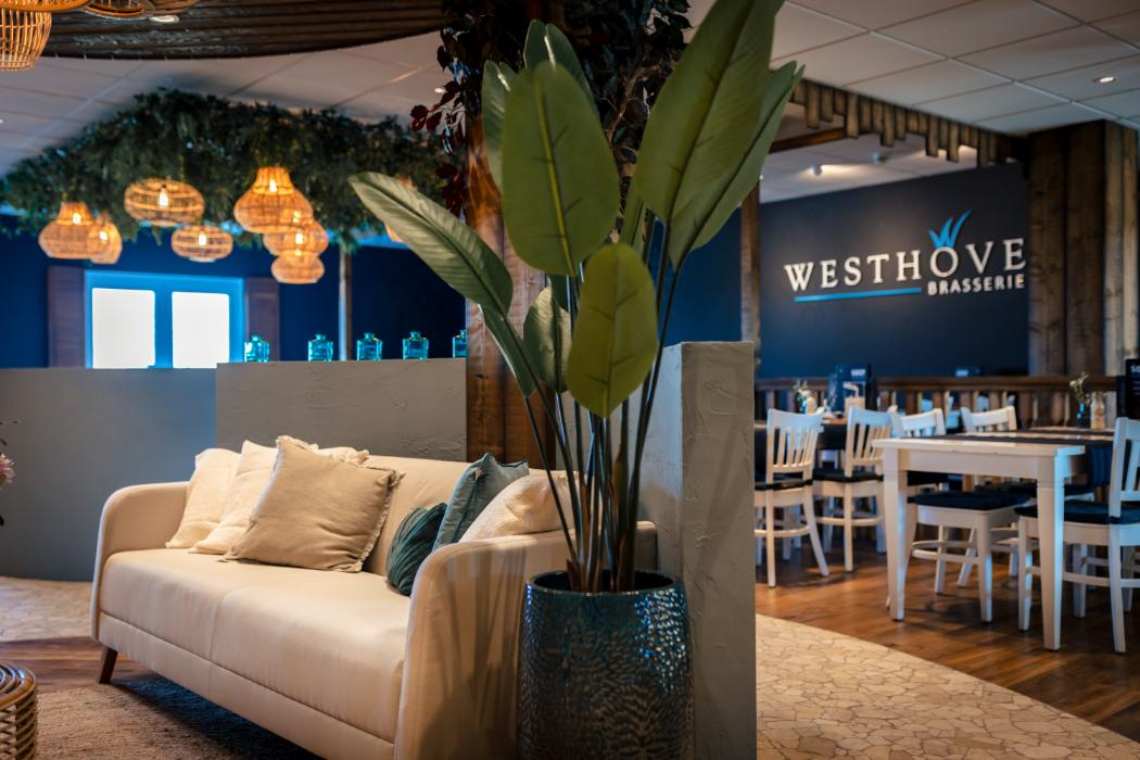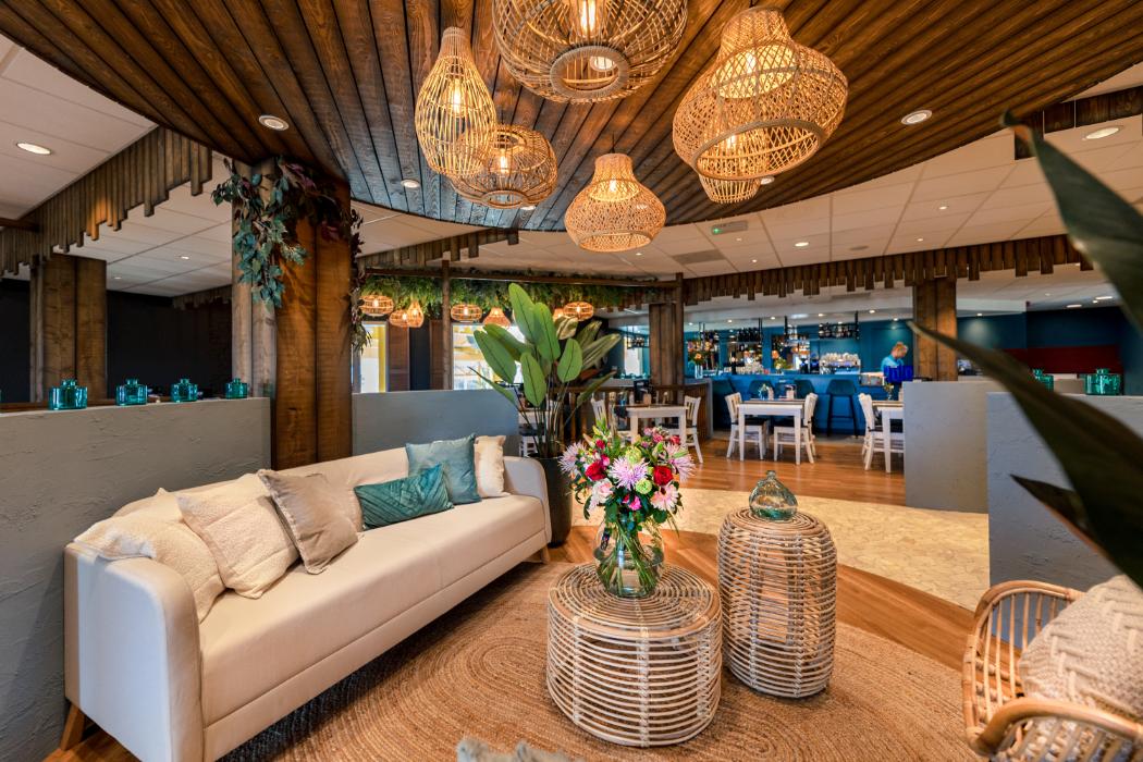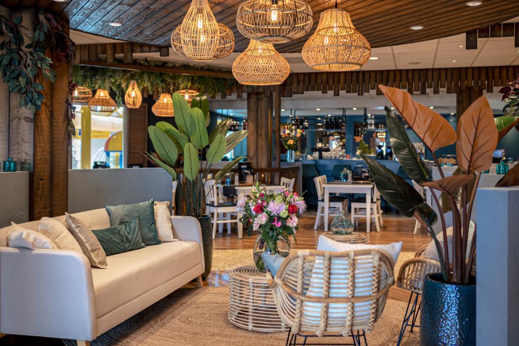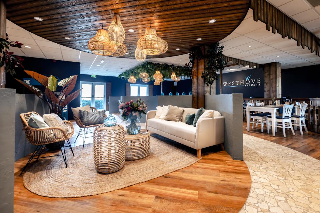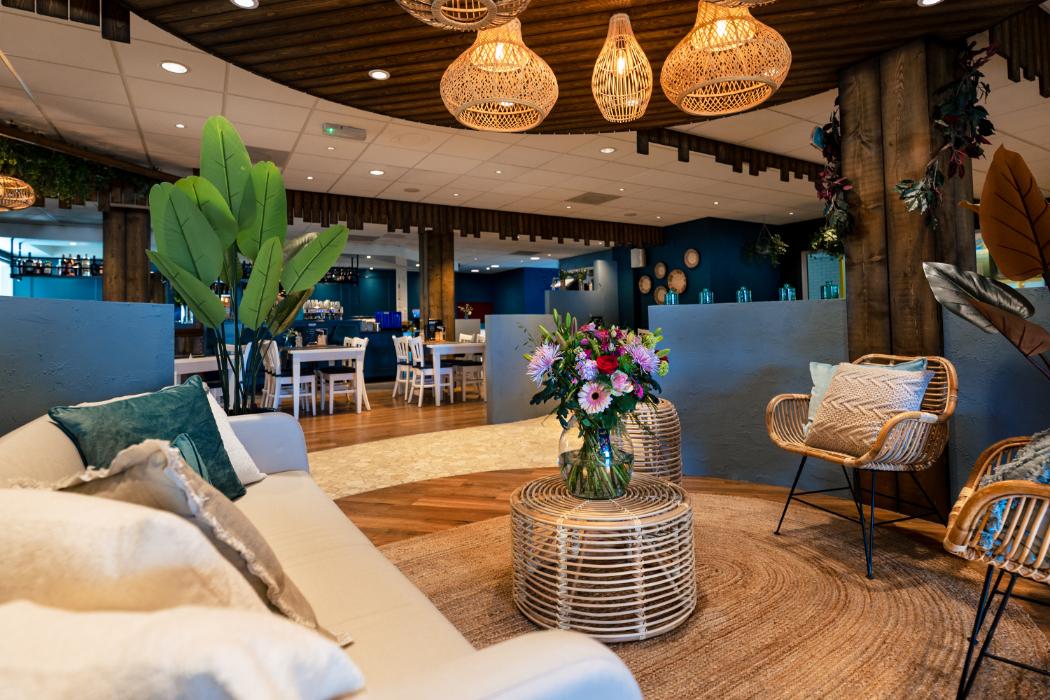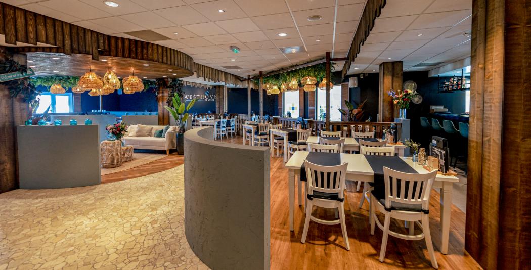 De brasserie is in 2022 volledig gerestyled. De combinatie van stijlvol blauw, natuurlijke tinten en het gebruik van riet en rotan zorgen voor een vriendelijke, warme uitstraling, waar gasten zich direct thuis voelen. Er is plaats voor circa 90 gasten om sfeervol te lunchen of dineren. Leuk is dat je vanuit het restaurant een doorkijkje hebt naar het overdekte zwembad. Voor ouders van jonge kinderen is daarnaast de directe doorgang, zónder geluidsoverlast, naar de indoor speeltuin een enorm pluspunt. Zij kunnen heerlijk ontspannen genieten, terwijl de kinderen eindeloos kunnen spelen. De brasserie beschikt over een elegante bar, voornamelijk gebruikt voor de uitgifte van warme en koude dranken. Hier vind je moderne voorzieningen zoals een biertapinstallatie, koeling, een koffiemachine (2022) en een kassasysteem (2022). De blauw velours barkrukken geven de bar een luxe uitstraling, al kiezen de meeste gasten voor een plek aan tafel.