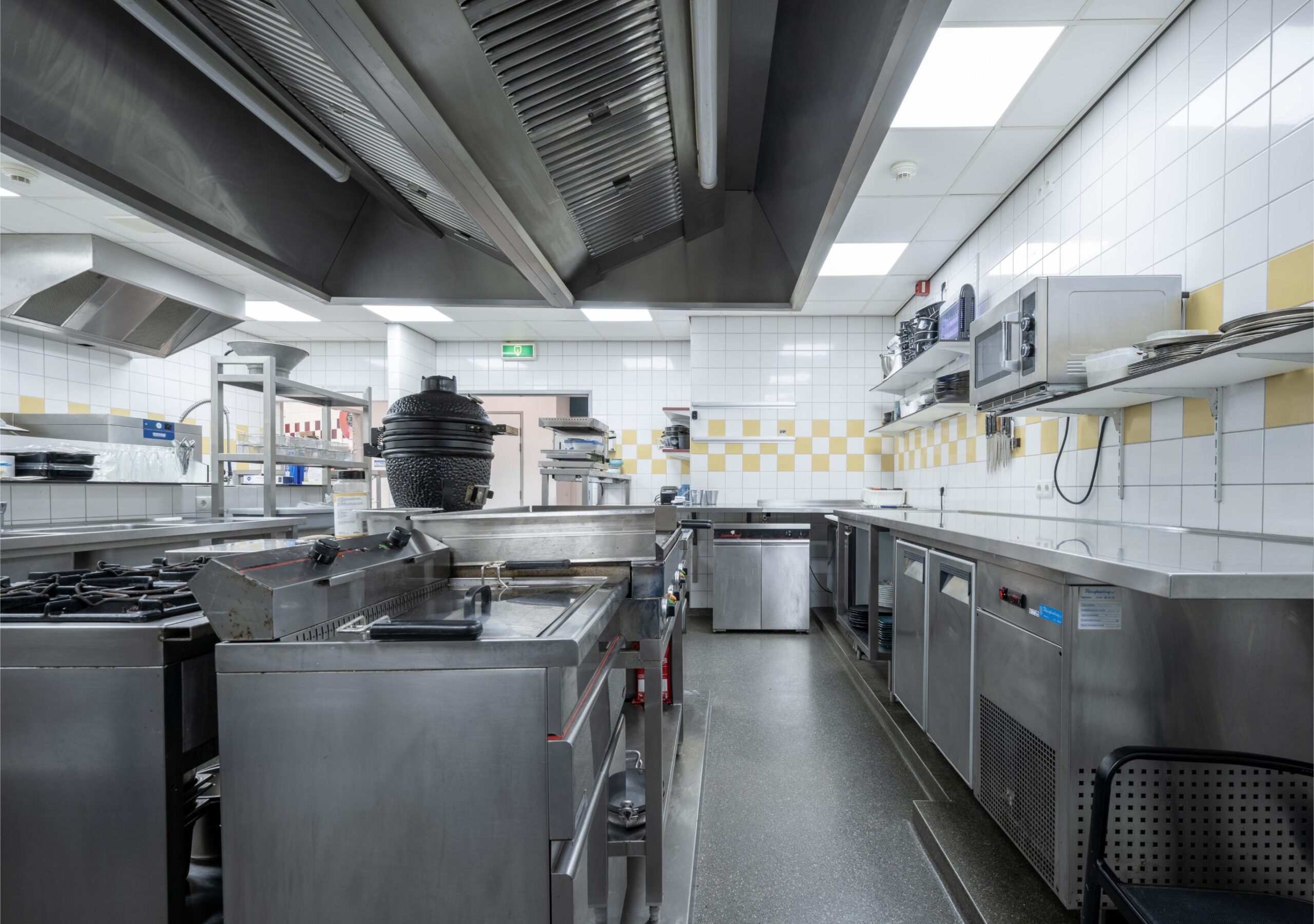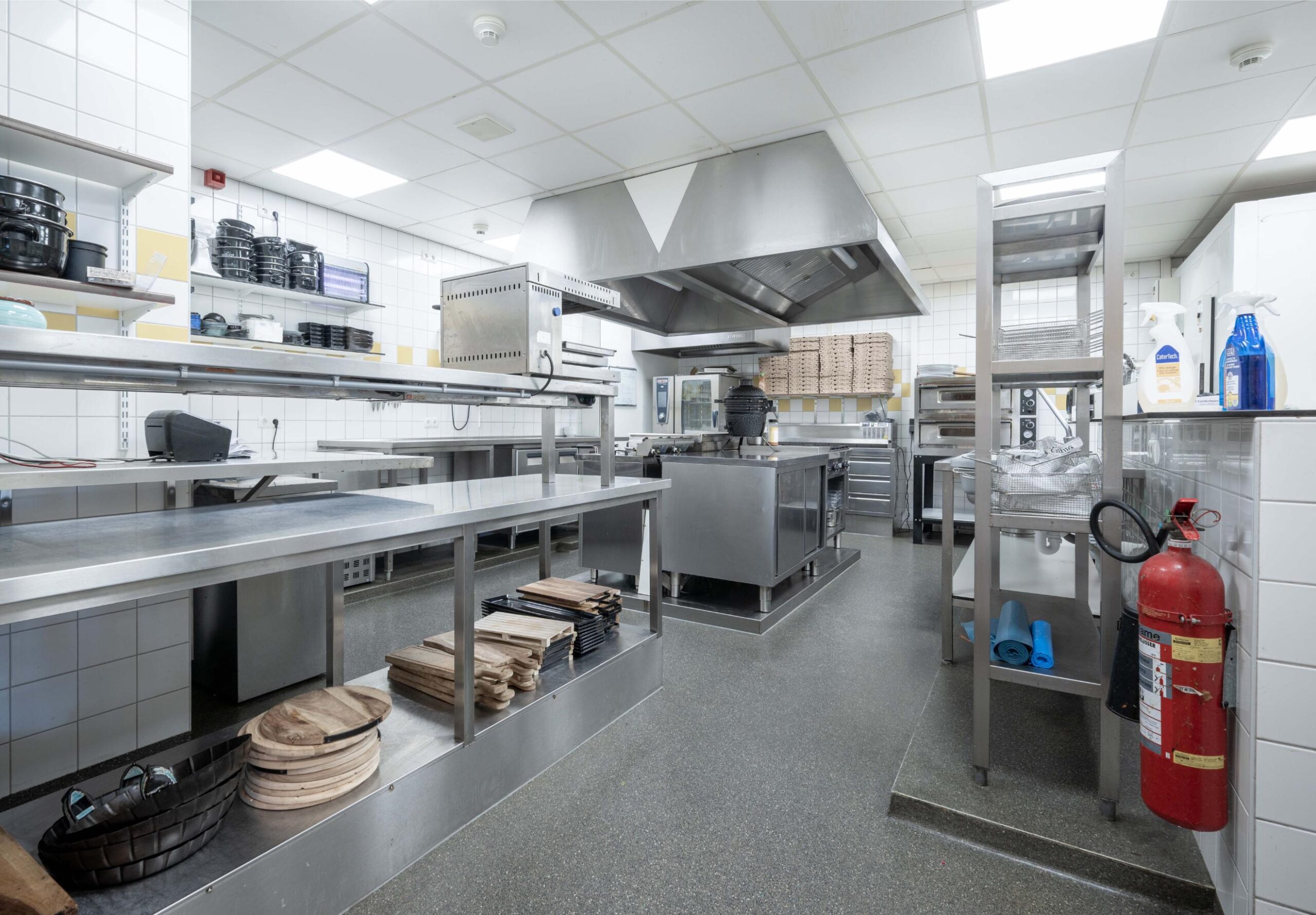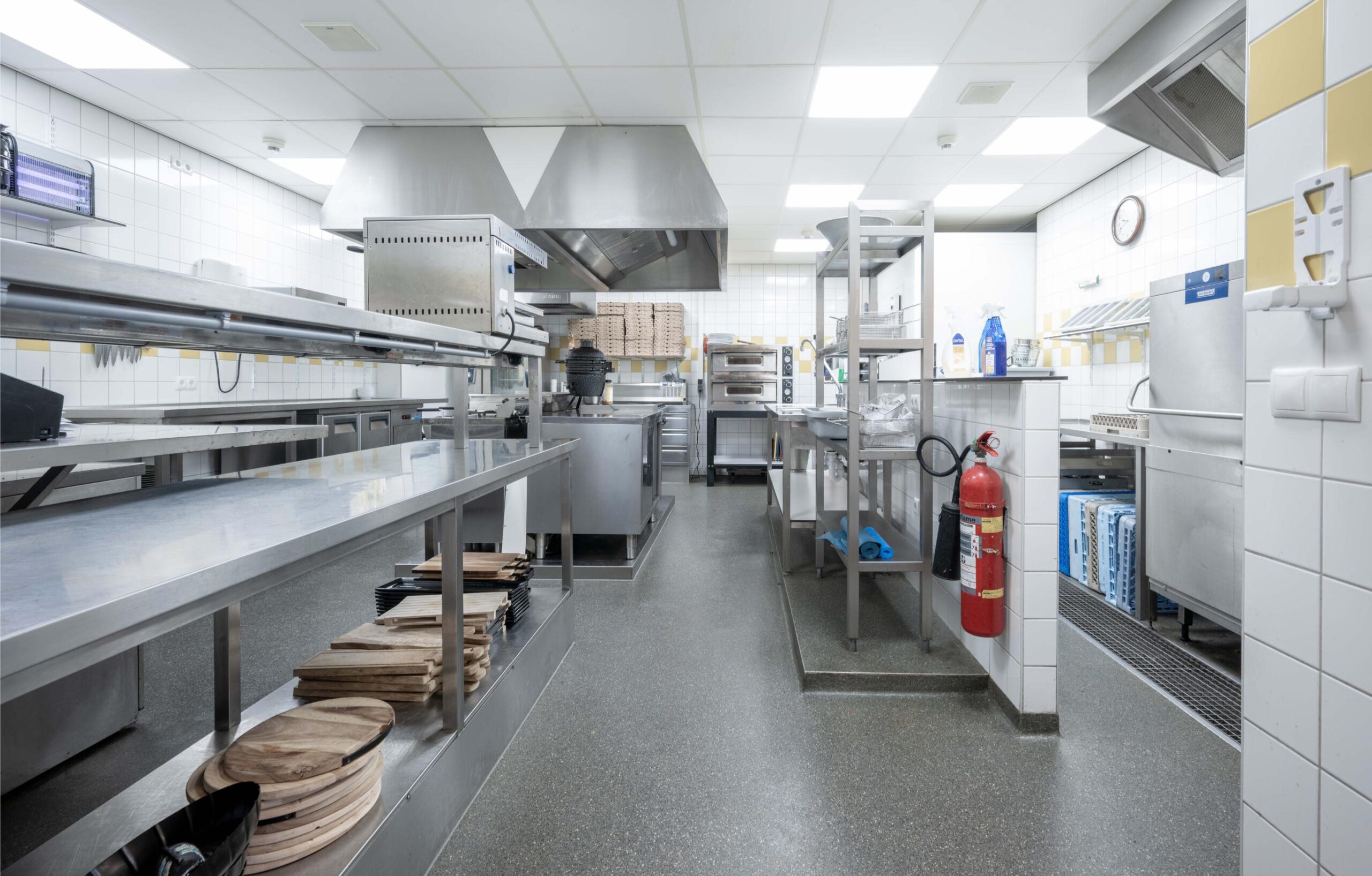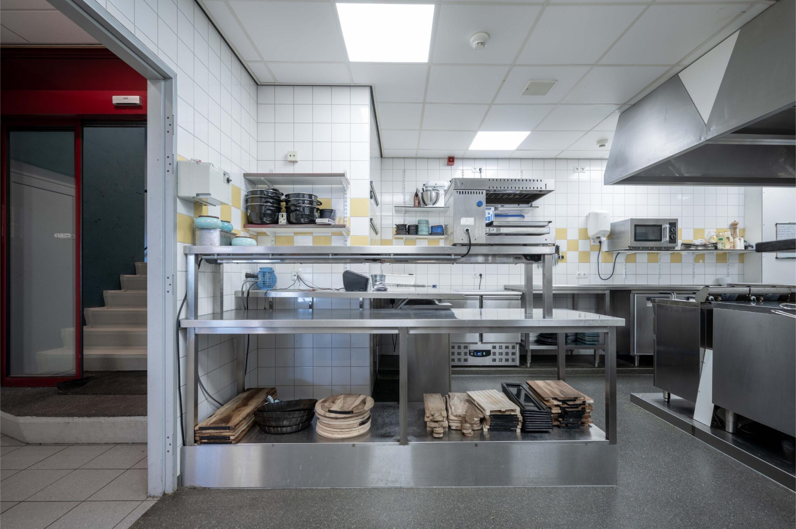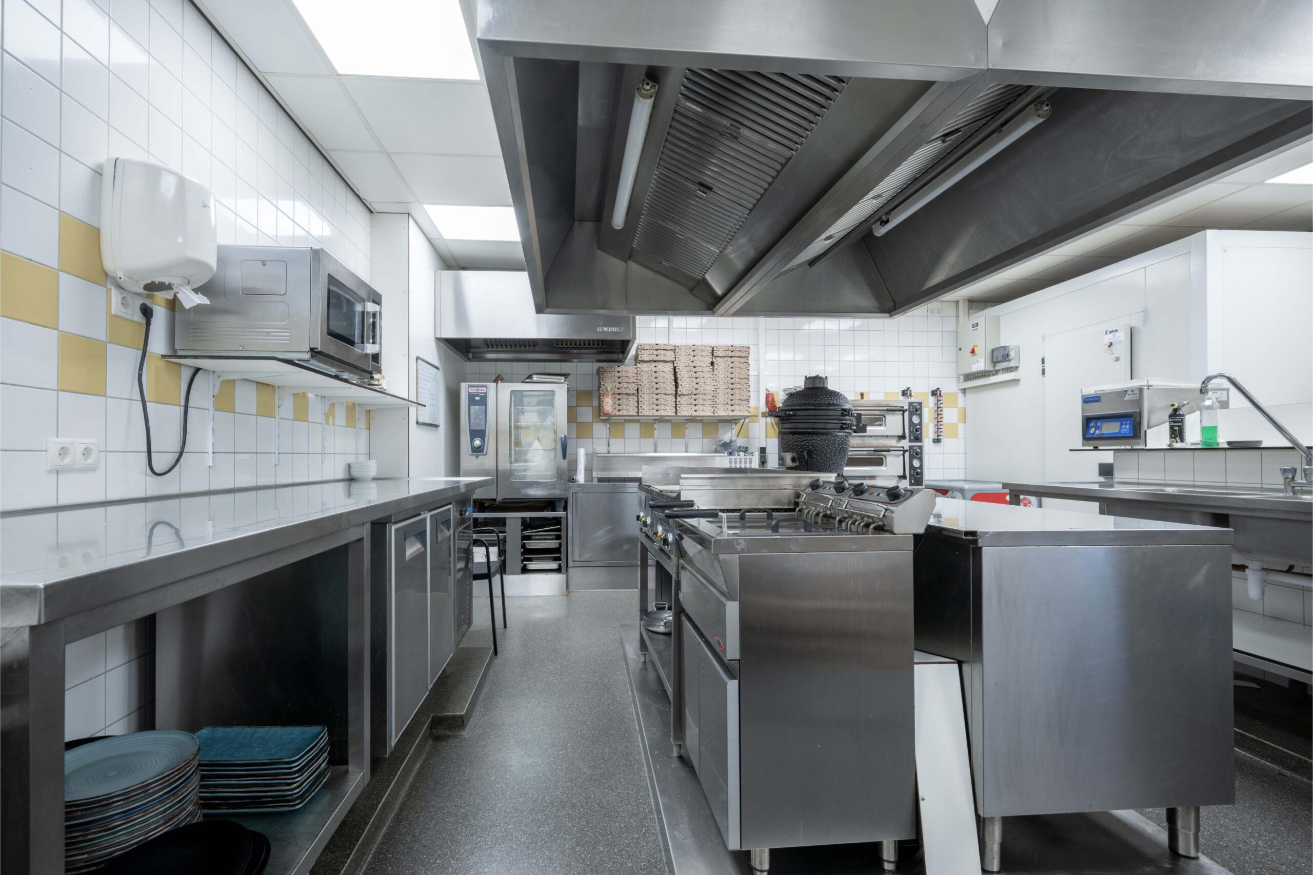 De keuken ligt centraal tussen de cafetaria en de brasserie. Doordat de brasserie iets verhoogd is aangelegd (+1,30 meter) en de keuken lager ligt, bereik je deze via een klein trapje. De ruimte is volledig betegeld, praktisch ingericht en eenvoudig schoon te houden. Er is voldoende werkruimte voor twee tot drie koks om tegelijkertijd aan de slag te gaan. De keuken is compleet uitgerust met onder meer gaspitten, een combisteamer, bakplaat, friteuse, diverse koelingen, twee pizzaovens, een bordenwarmhouder en een koel-vriescombinatie. Natuurlijk ontbreekt ook de spoelkeuken niet. Alles is aanwezig om gasten goed en efficiënt te bedienen.
