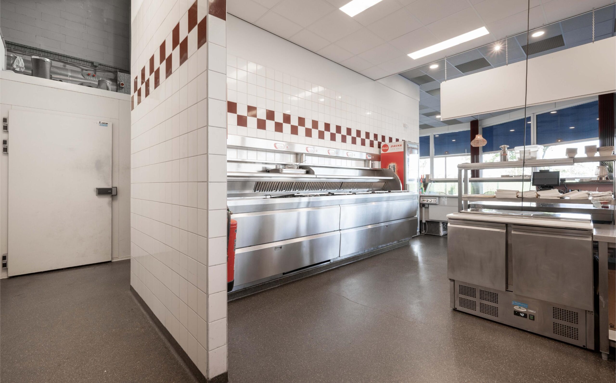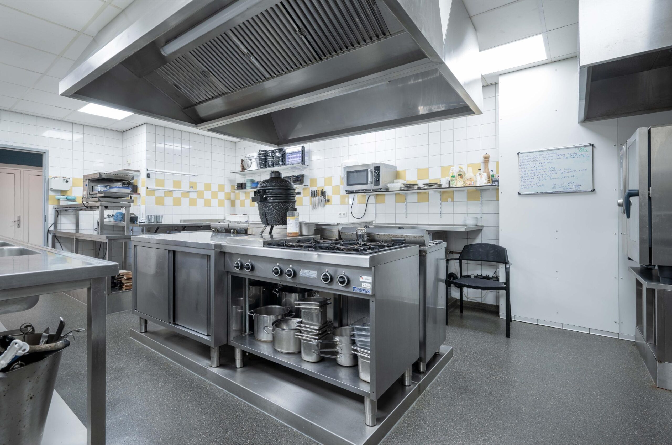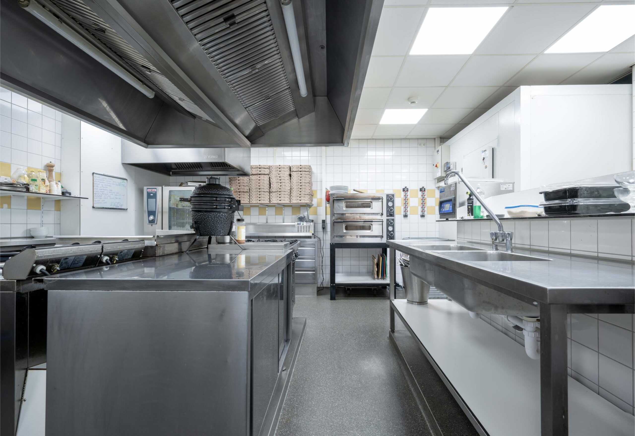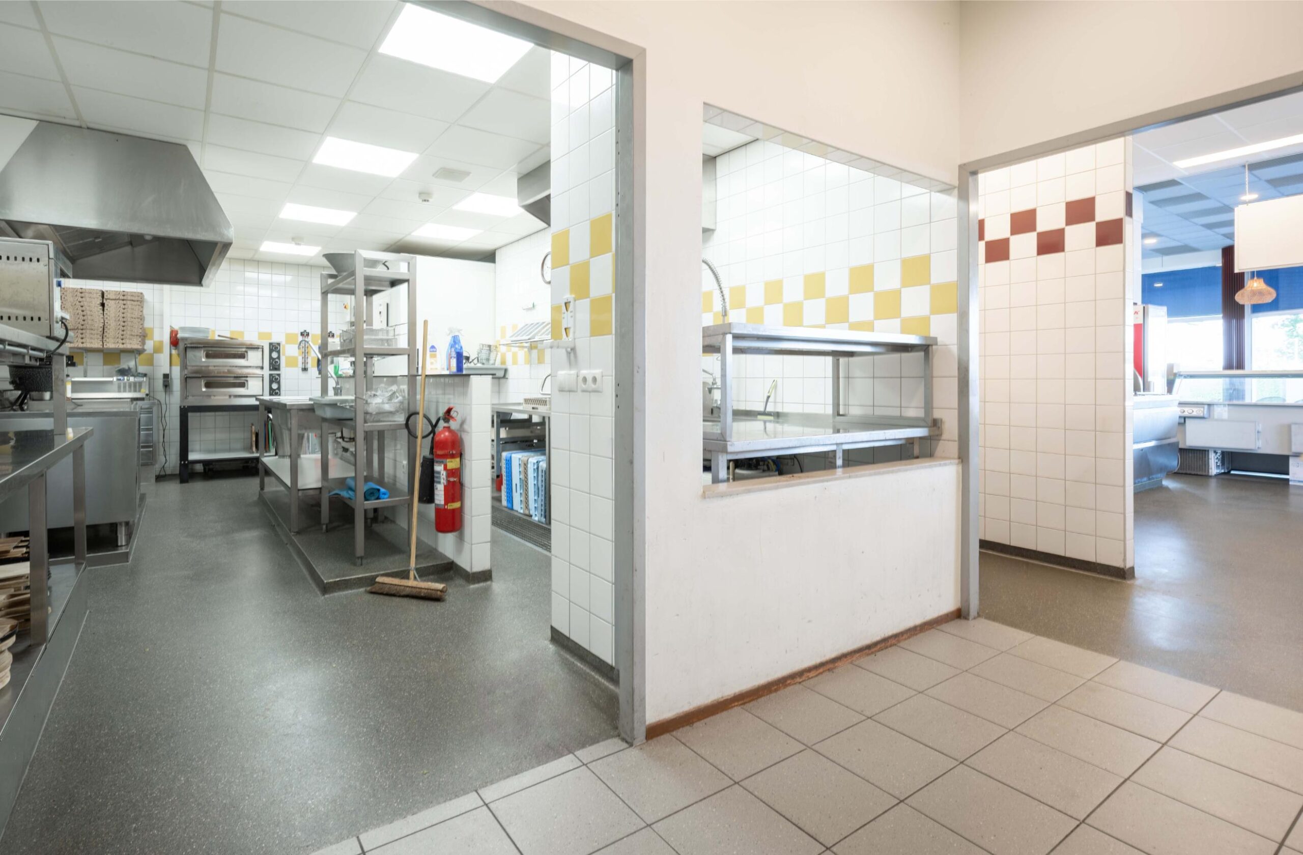 De keuken ligt centraal tussen de cafetaria en de brasserie. Doordat de brasserie iets verhoogd is aangelegd (+1,30 meter) en de keuken lager ligt, bereik je deze via een klein trapje. De ruimte is volledig betegeld, praktisch ingericht en eenvoudig schoon te houden. Er is voldoende werkruimte voor twee tot drie koks om tegelijkertijd aan de slag te gaan. De keuken is compleet uitgerust met onder meer gaspitten, een combisteamer, bakplaat, friteuse, diverse koelingen, twee pizzaovens, een bordenwarmhouder en een koel-vriescombinatie. Natuurlijk ontbreekt ook de spoelkeuken niet. Alles is aanwezig om gasten goed en efficiënt te bedienen.