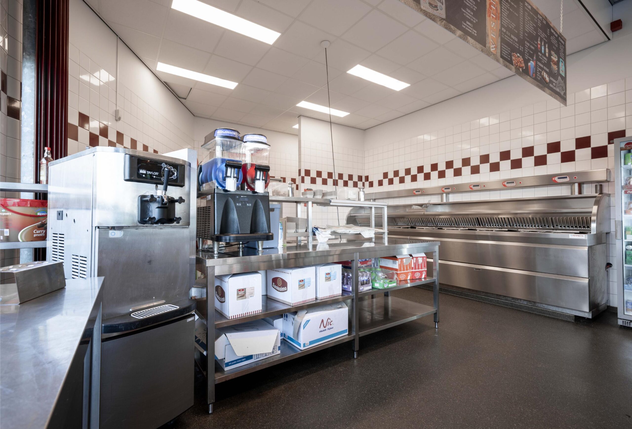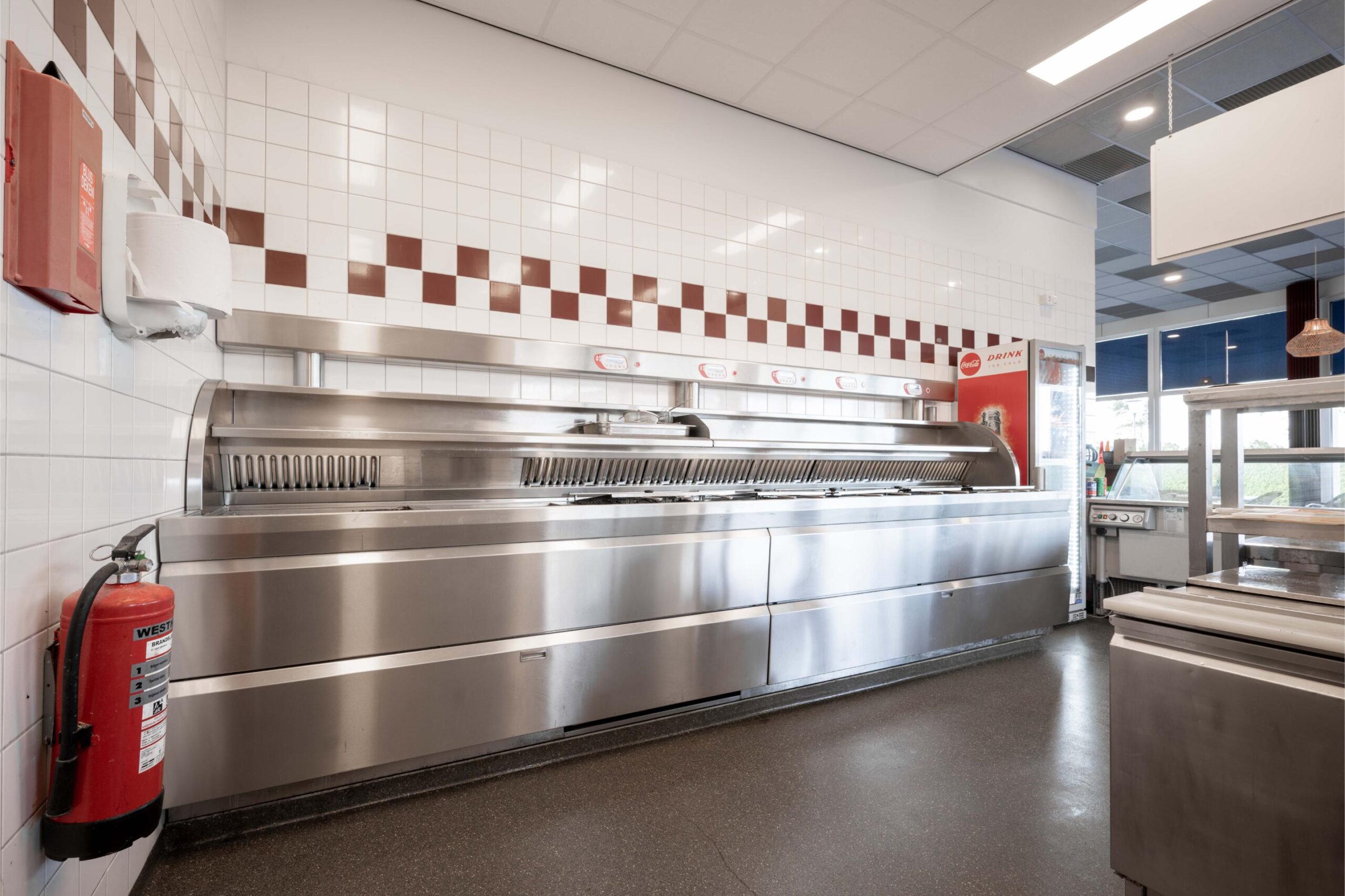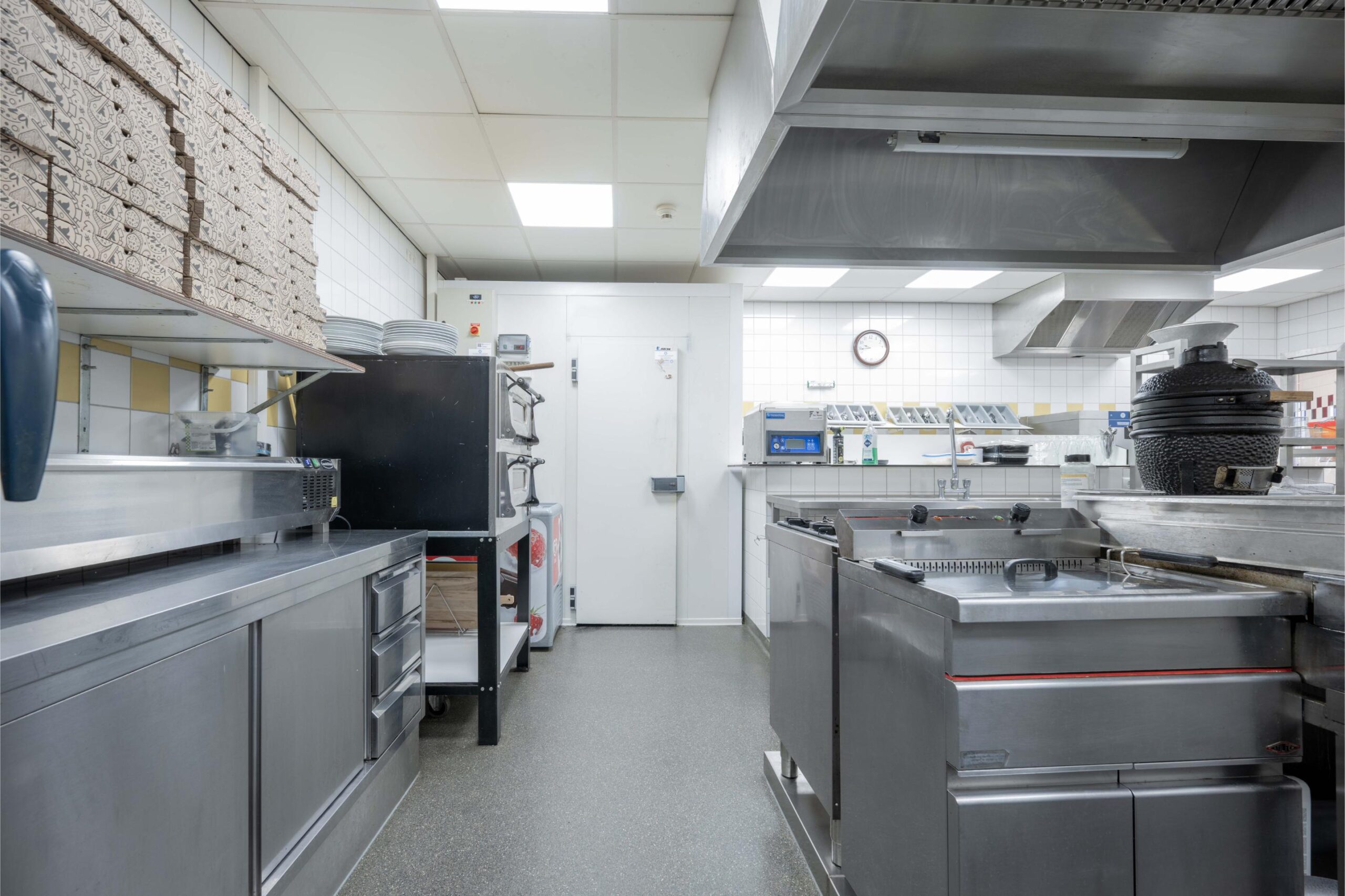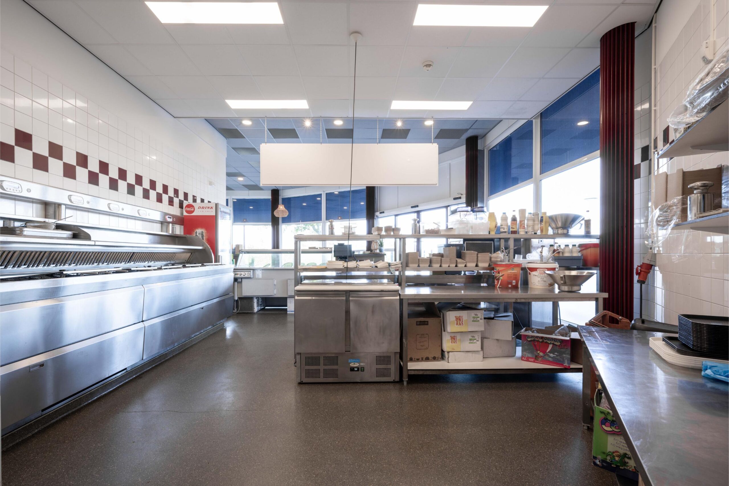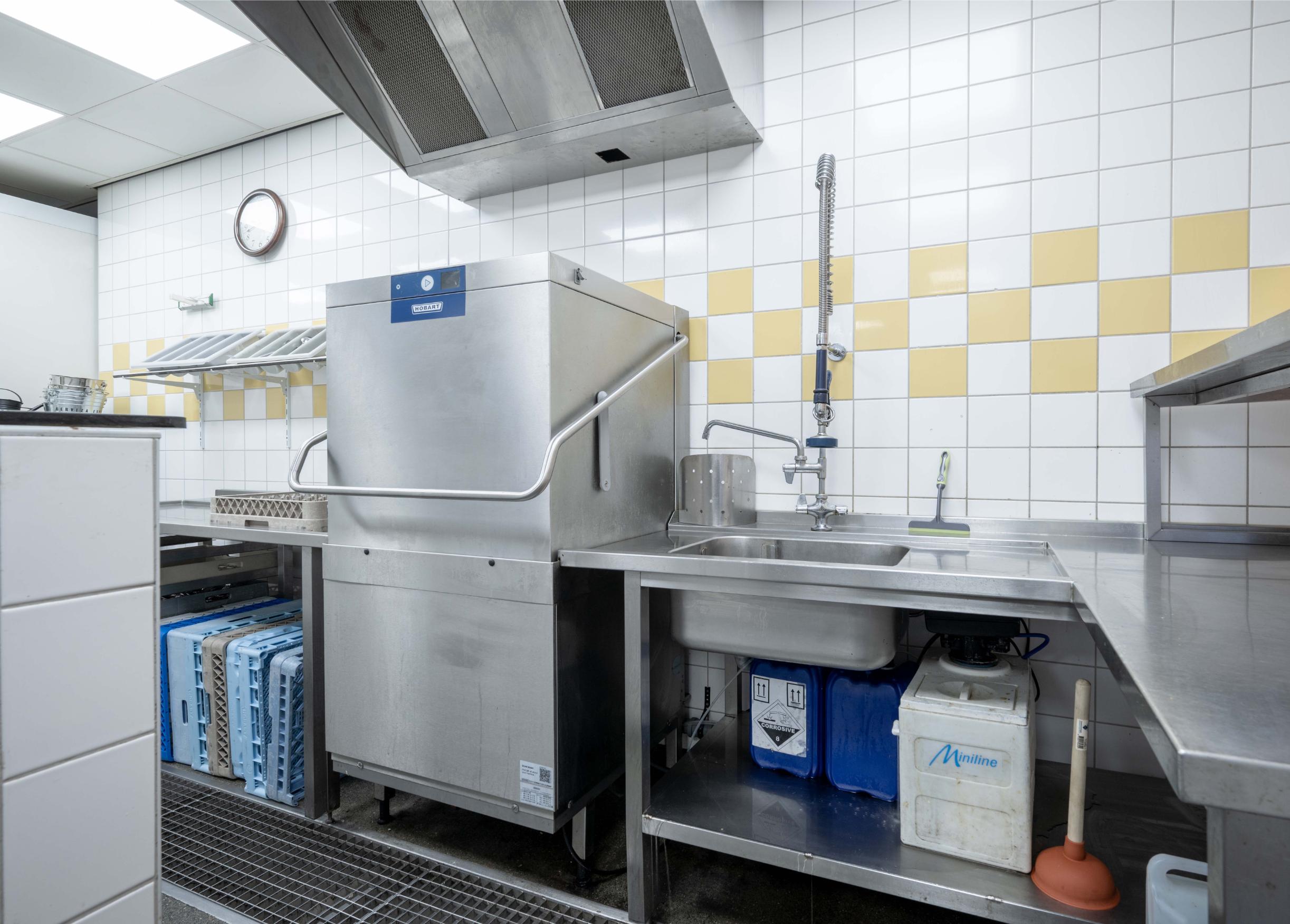 De keuken ligt centraal tussen de cafetaria en de brasserie. Doordat de brasserie iets verhoogd is aangelegd (+1,30 meter) en de keuken lager ligt, bereik je deze via een klein trapje. De ruimte is volledig betegeld, praktisch ingericht en eenvoudig schoon te houden. Er is voldoende werkruimte voor twee tot drie koks om tegelijkertijd aan de slag te gaan. De keuken is compleet uitgerust met onder meer gaspitten, een combisteamer, bakplaat, friteuse, diverse koelingen, twee pizzaovens, een bordenwarmhouder en een koel-vriescombinatie. Natuurlijk ontbreekt ook de spoelkeuken niet. Alles is aanwezig om gasten goed en efficiënt te bedienen.