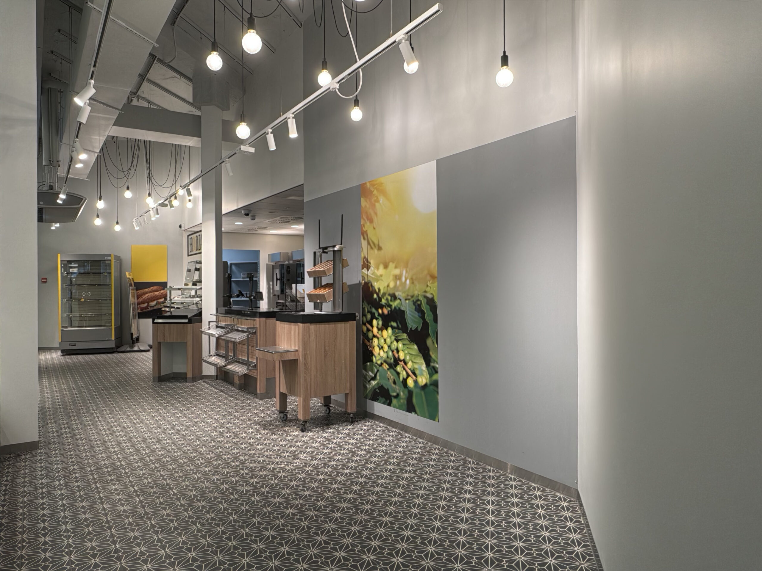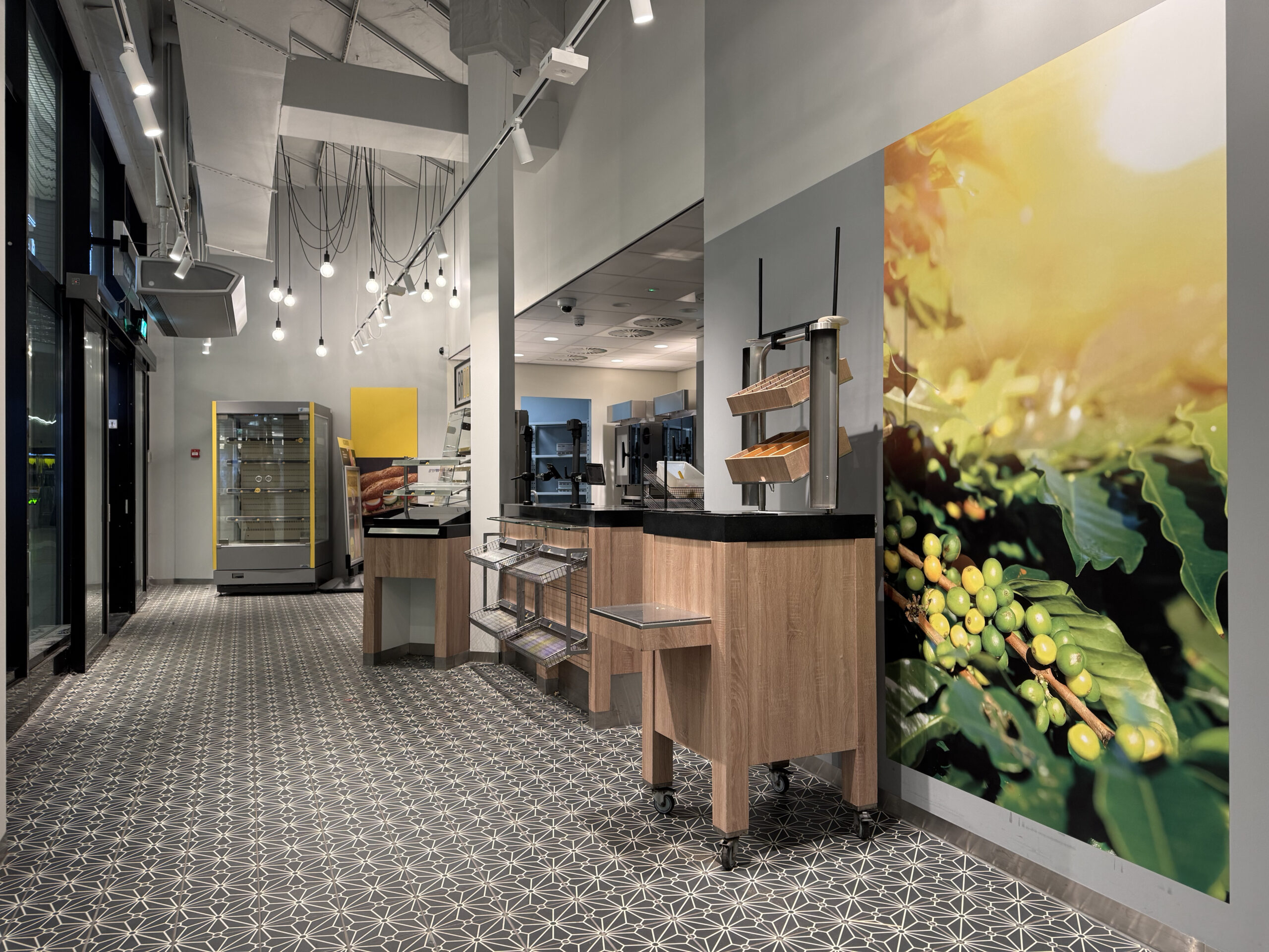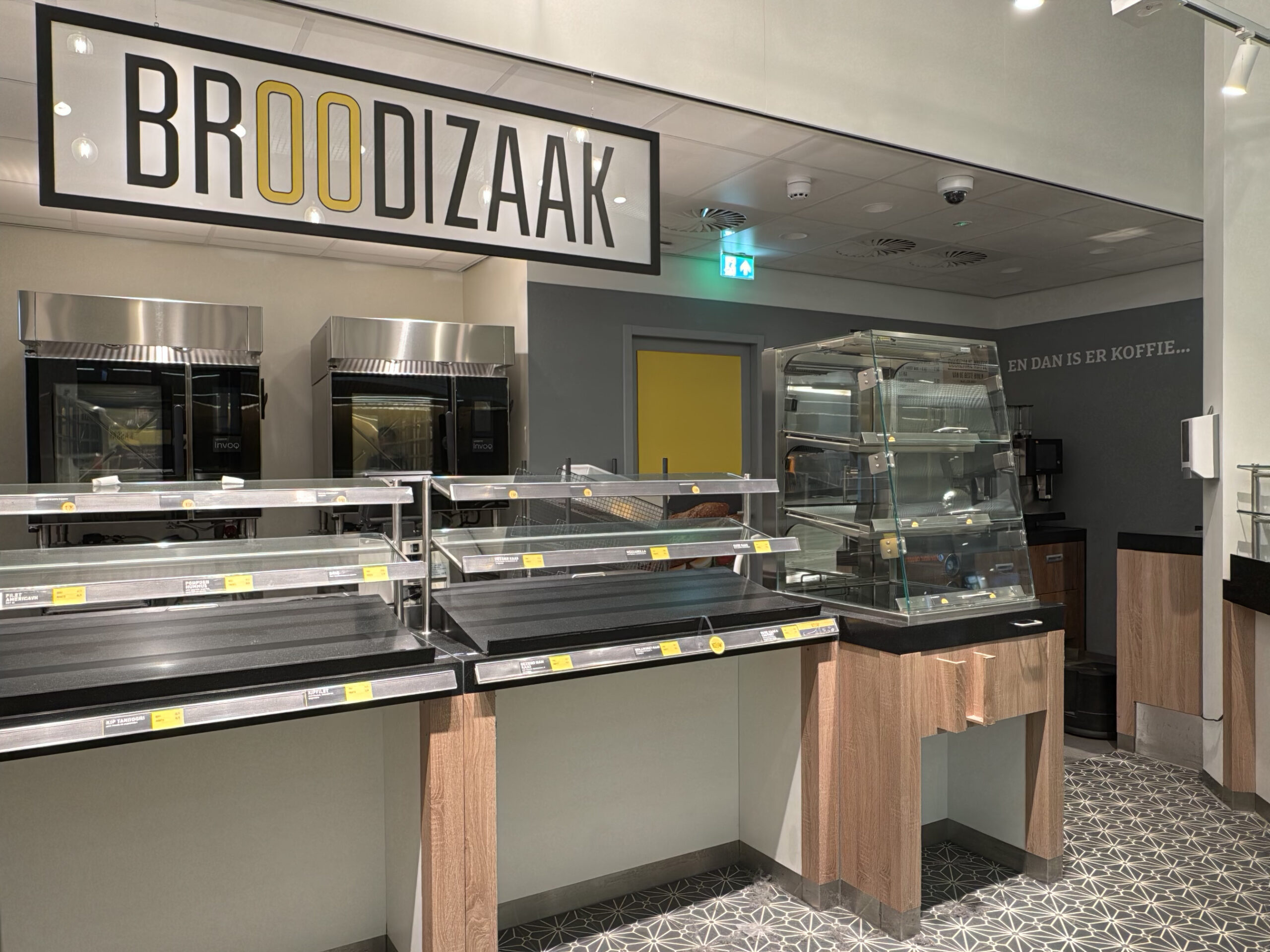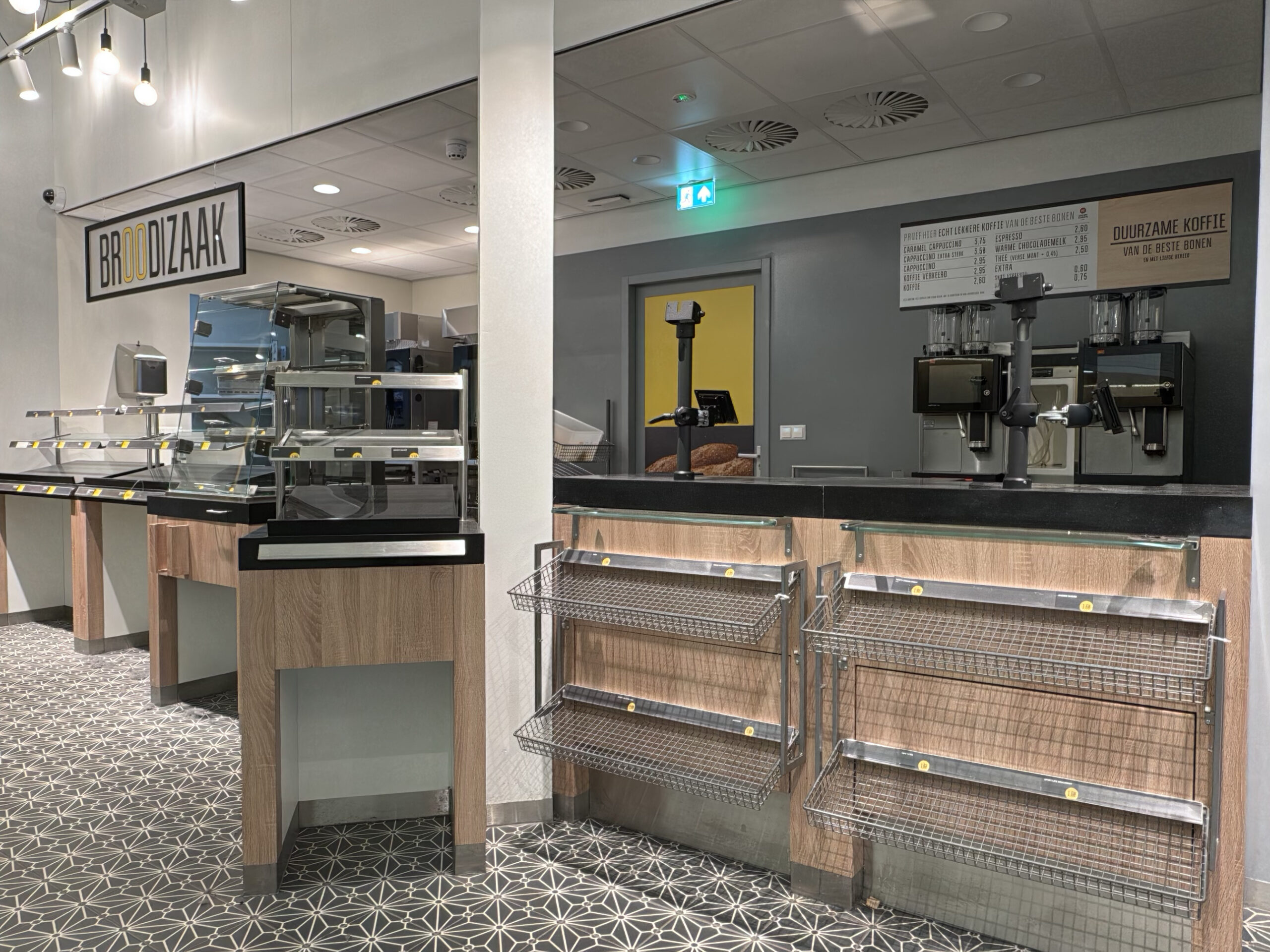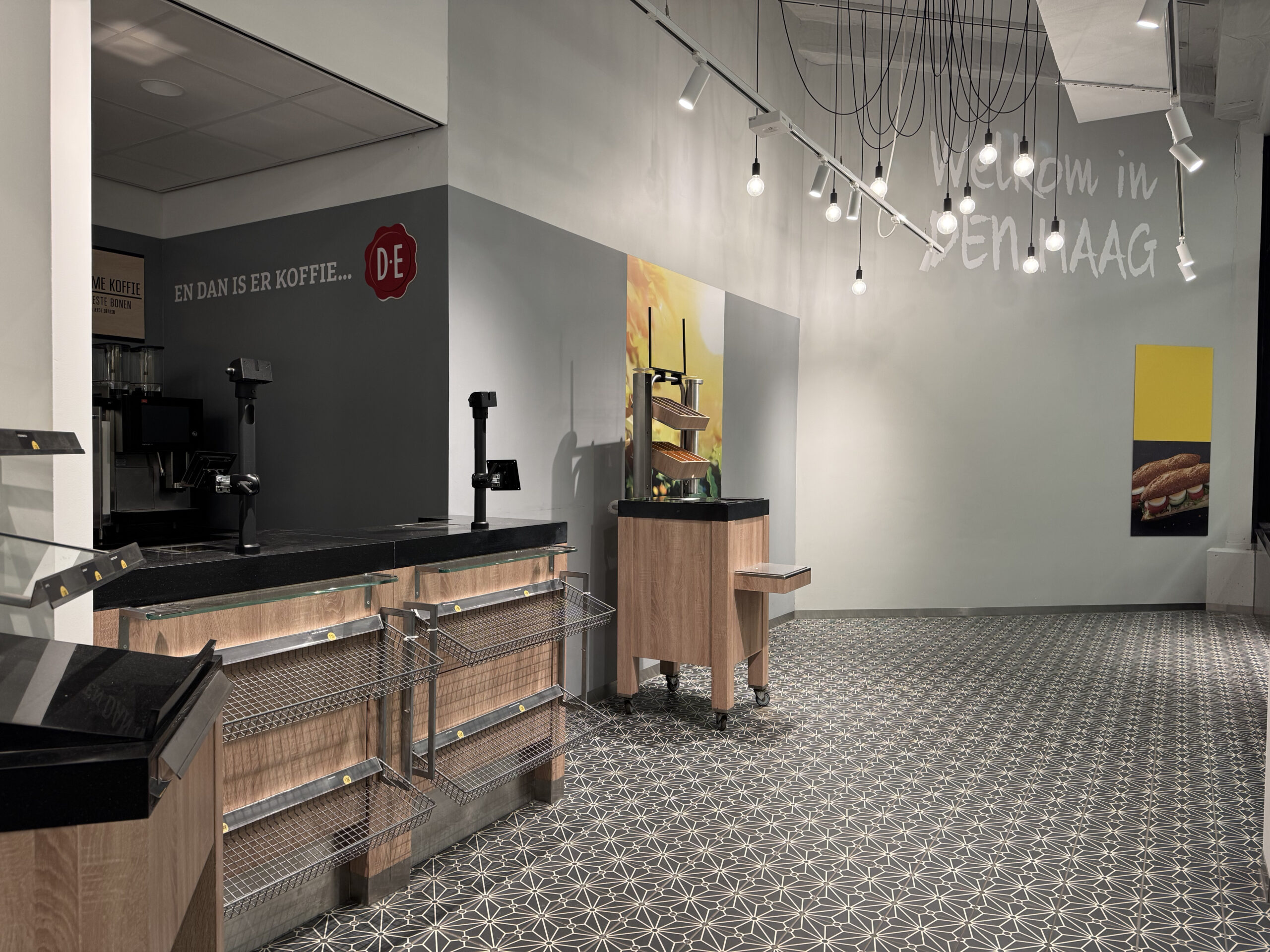 De horecaruimte heeft een open en lichte uitstraling met grote glazen gevels die zorgen voor veel natuurlijk licht en zicht op de stationshal. Door de glazen wanden kijk je uit op het drukke station Den Haag Hollands Spoor, met reizigers die in en uit de stationshal stromen. Binnen staat een grote toonbank met kassa en productdisplay, waar producten overzichtelijk gepresenteerd kunnen worden. Achterin de winkel zijn de ovens en werkstations zichtbaar, zodat klanten de productie kunnen zien. Dit geeft de mogelijkheid tot een open “live baking” concept en versterkt de beleving van versheid en ambacht. Achter de zichtbare werkruimte staan koel- en opslagcellen, afgeschermd door achterdeuren. Er is voldoende loopruimte voor klanten om langs de toonbank te lopen en producten te bekijken.