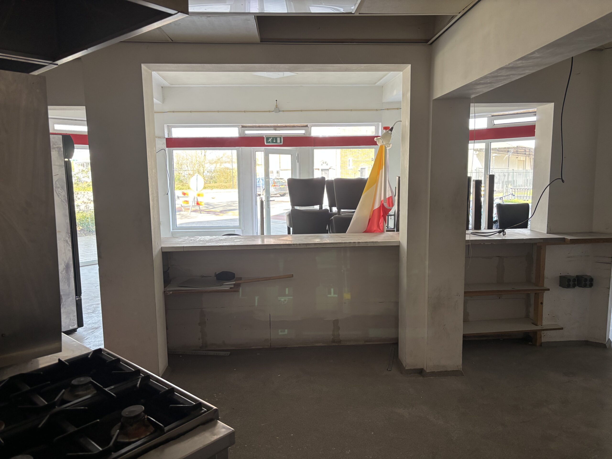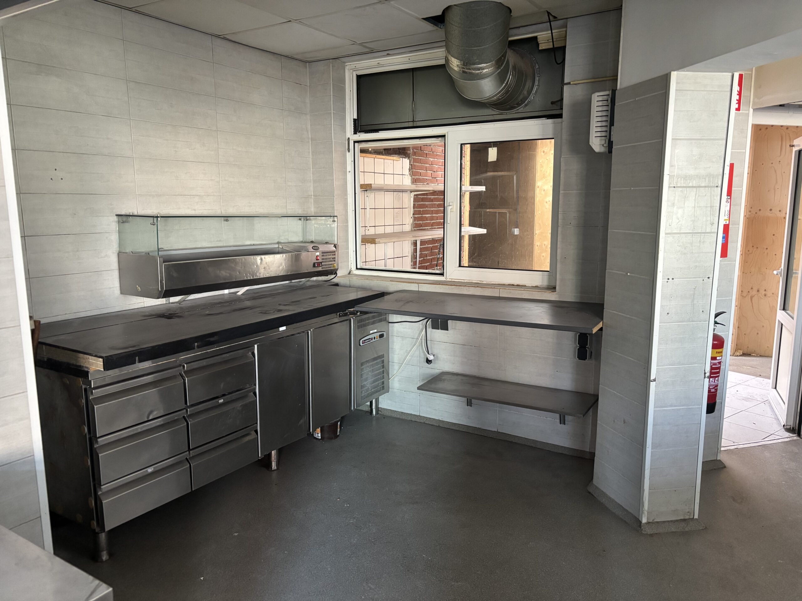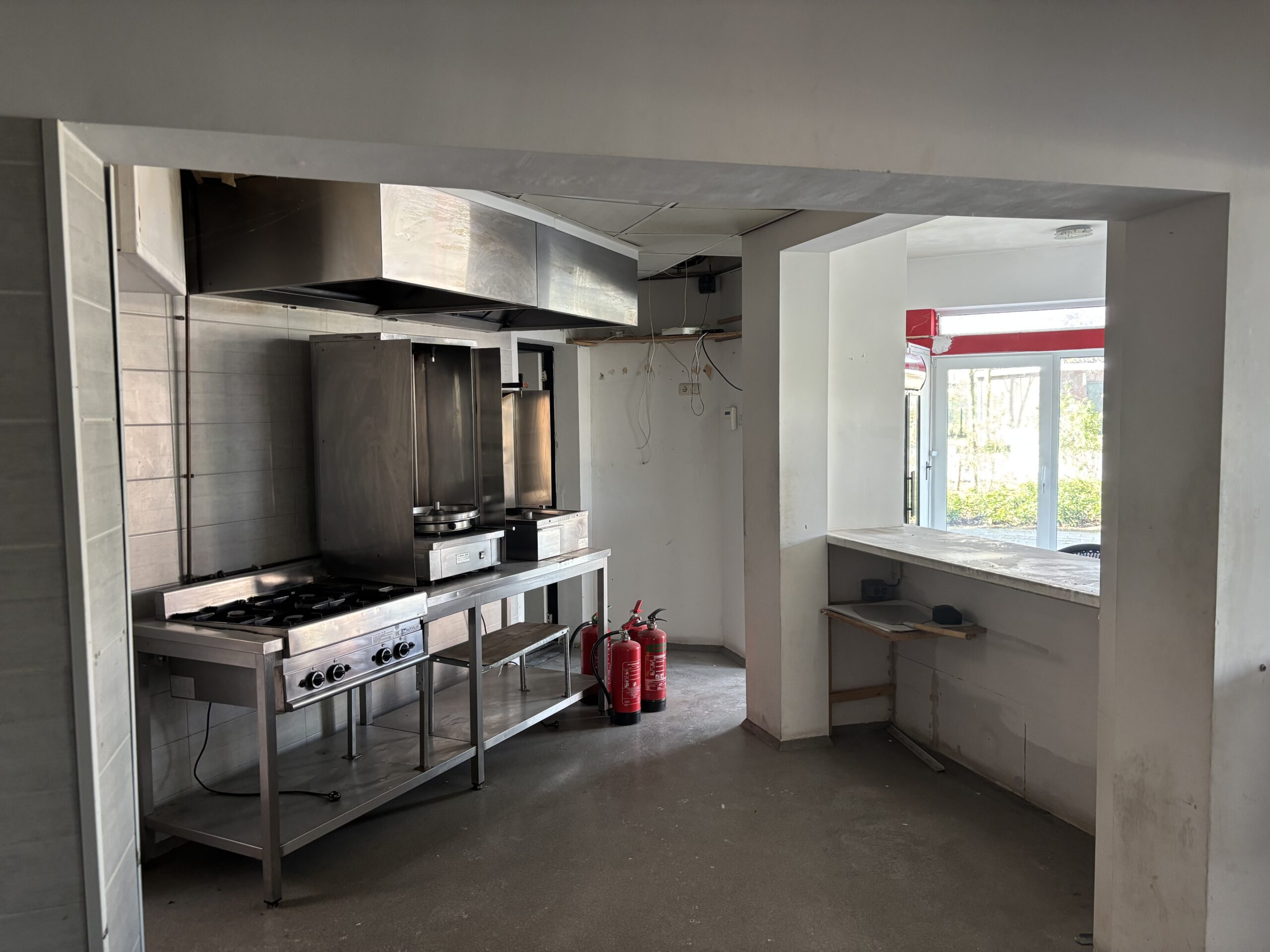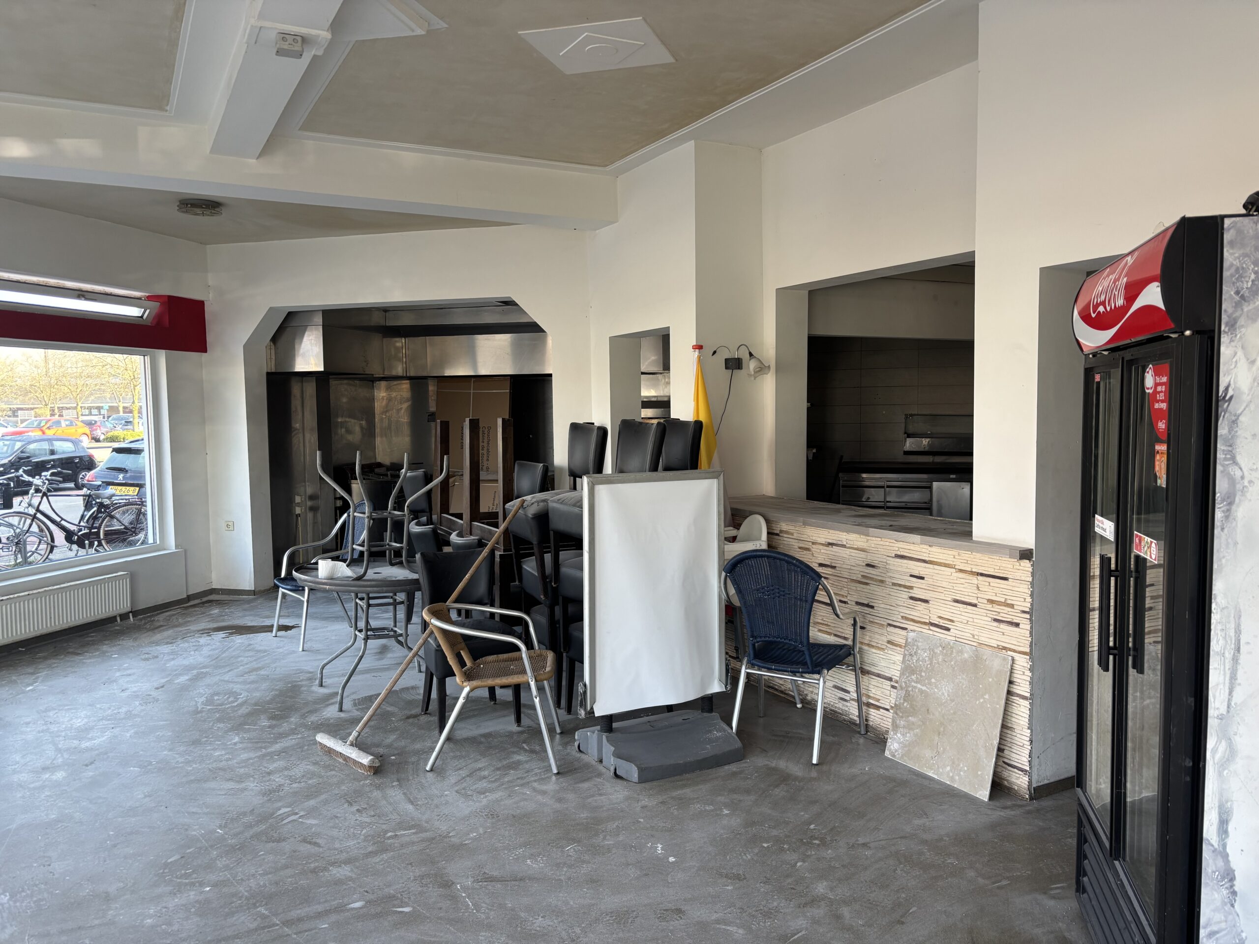 Het pand zelf beschikt over een volledig vernieuwde voorpui, wat zorgt voor een frisse uitstraling en goede zichtbaarheid vanaf de straat. Bij binnenkomst betreedt men een ruime ontvangstruimte met toonbank, geschikt voor afhaal en directe verkoop. Aansluitend bevindt zich een grote keukenruimte met daarachter een praktische opslagruimte. Totale grootte ca.90m2.