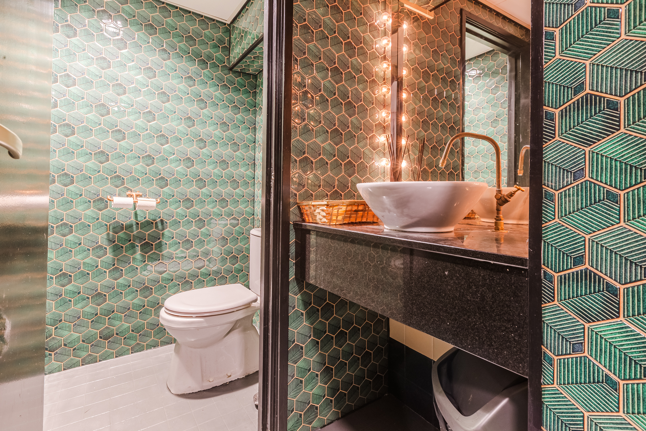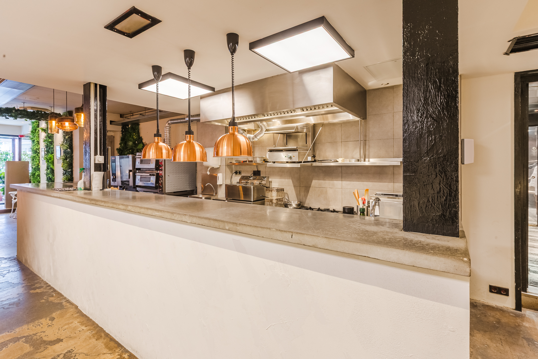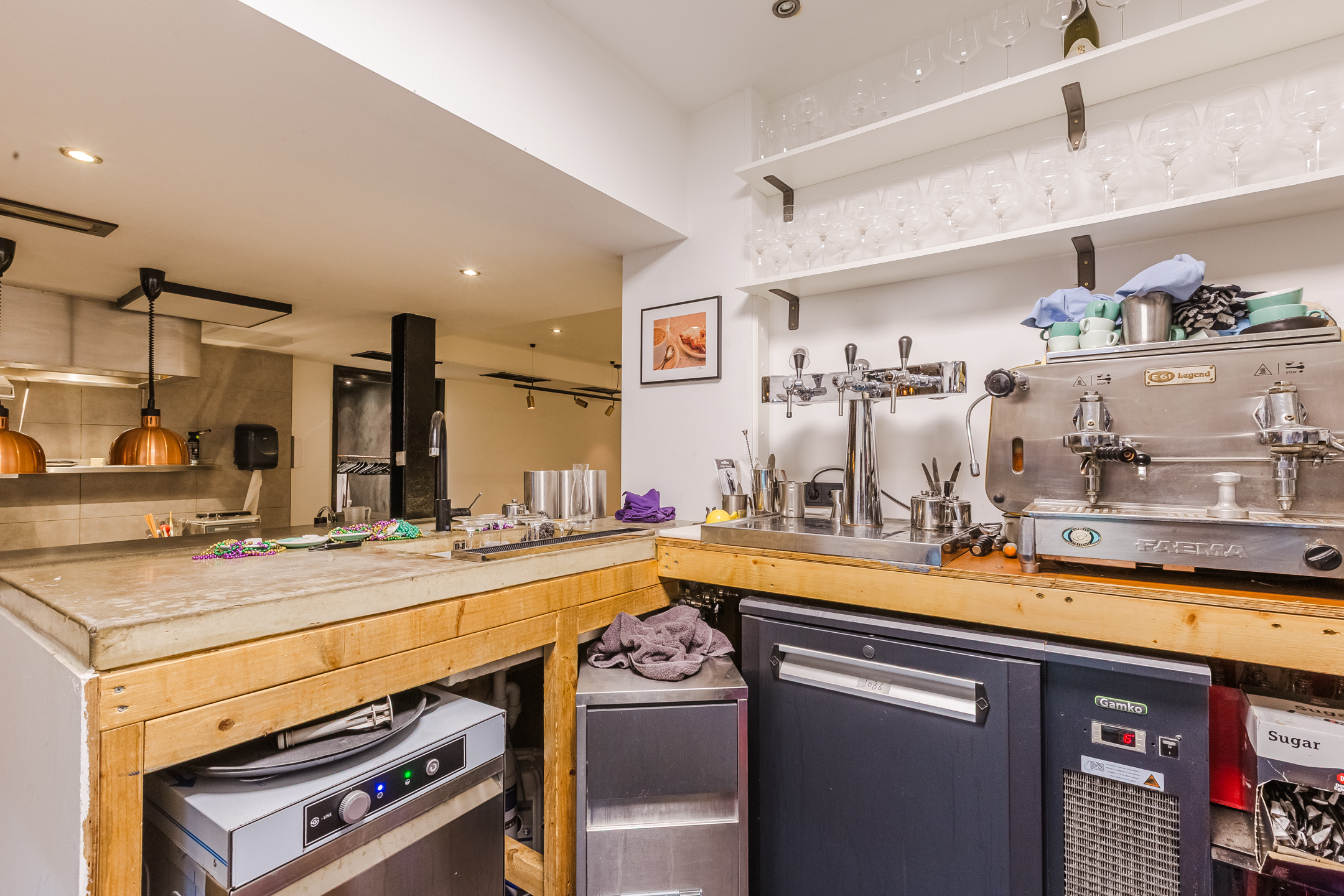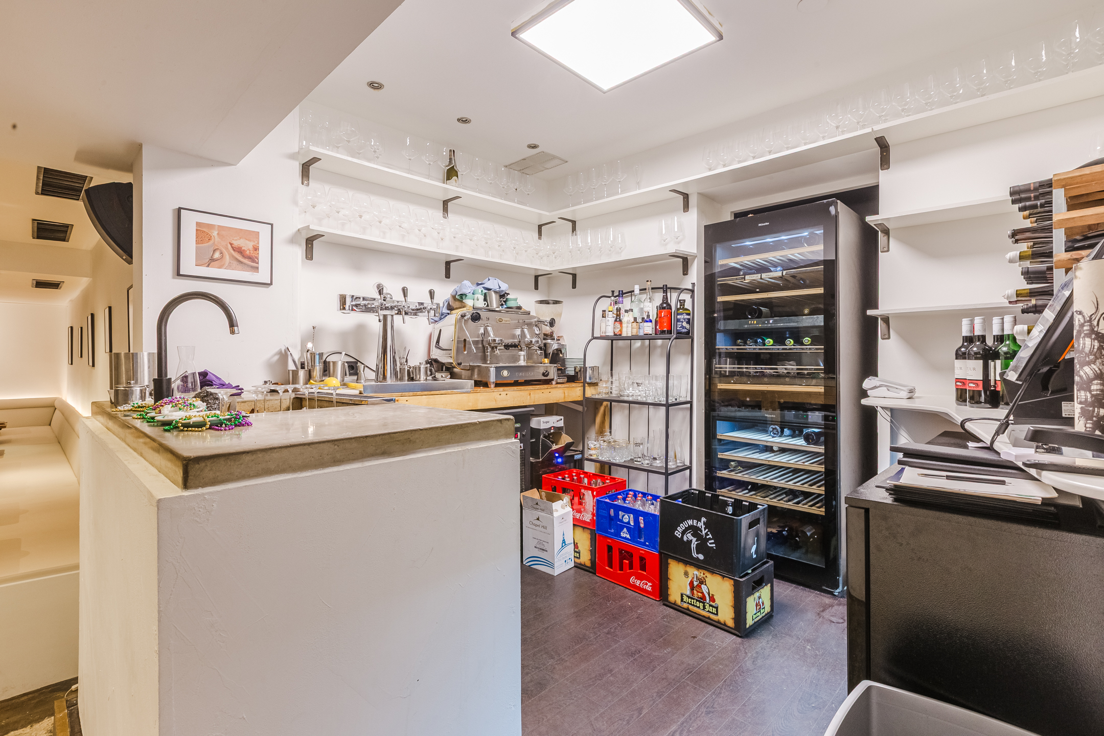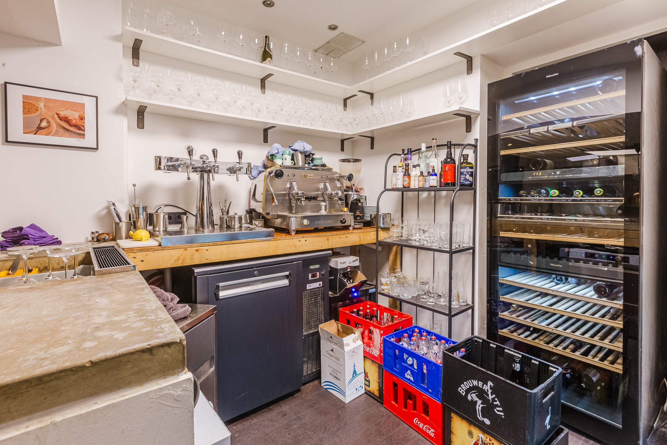 In het midden van het restaurantgedeelte bevindt zich aan de linkerzijde de open keuken en aan de rechterzijde de bar, waardoor gasten de ultieme culinaire beleving meekrijgen. Net naast de keuken is de deur naar een grotere garderobe en de gescheiden toiletgroepen.