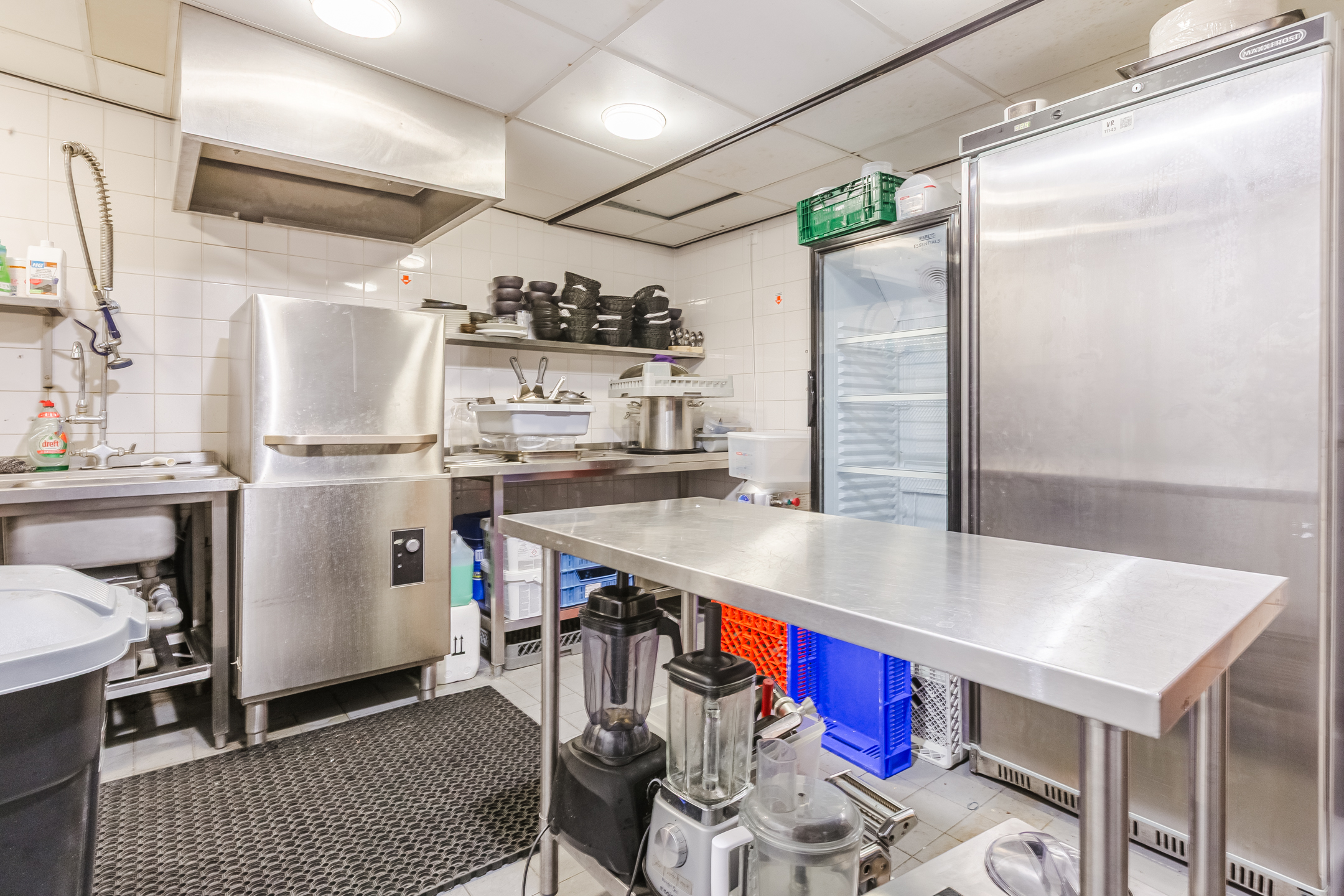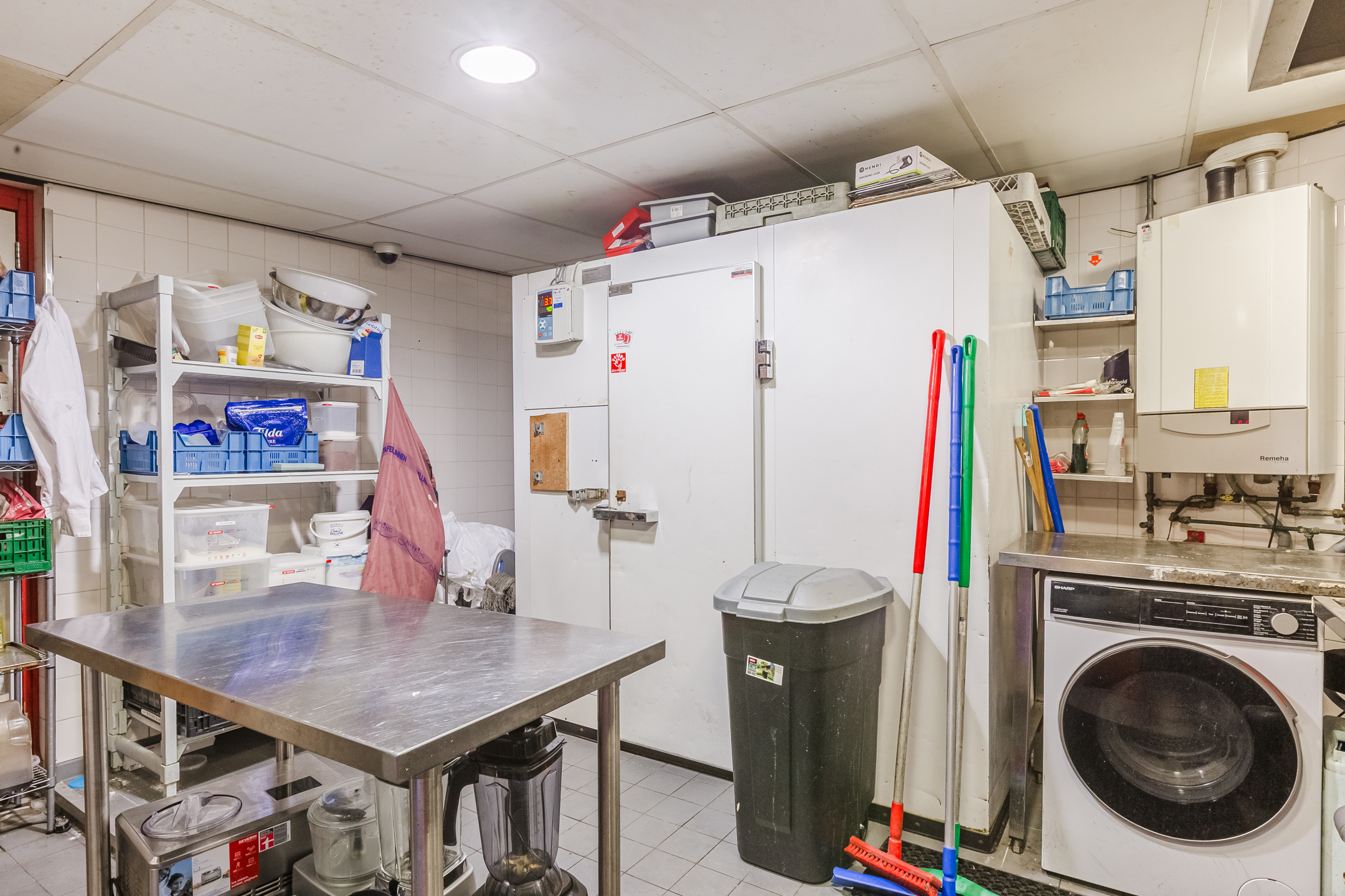 Achterin de zaak zit een ruime opslagruimte. Hier bevindt zich een ruimte spoelkeuken, voorbereidingskeuken en ruime inloop koelcel.