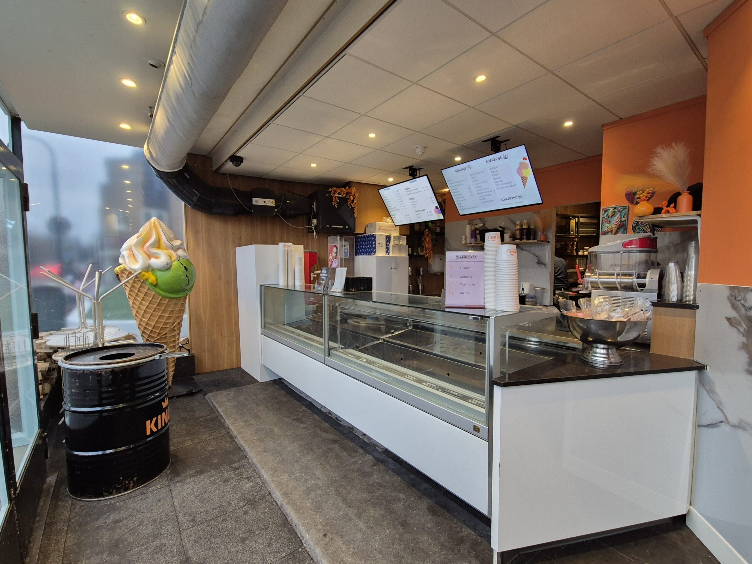 De gehele inrichting is warm en sfeervol, waardoor gasten zich direct welkom voelen. De bovenverdieping biedt ruime mogelijkheden voor productie en logistiek, ideaal voor uitbreiding van het aanbod of cateringactiviteiten of grootschalige(re) ijsproductie.