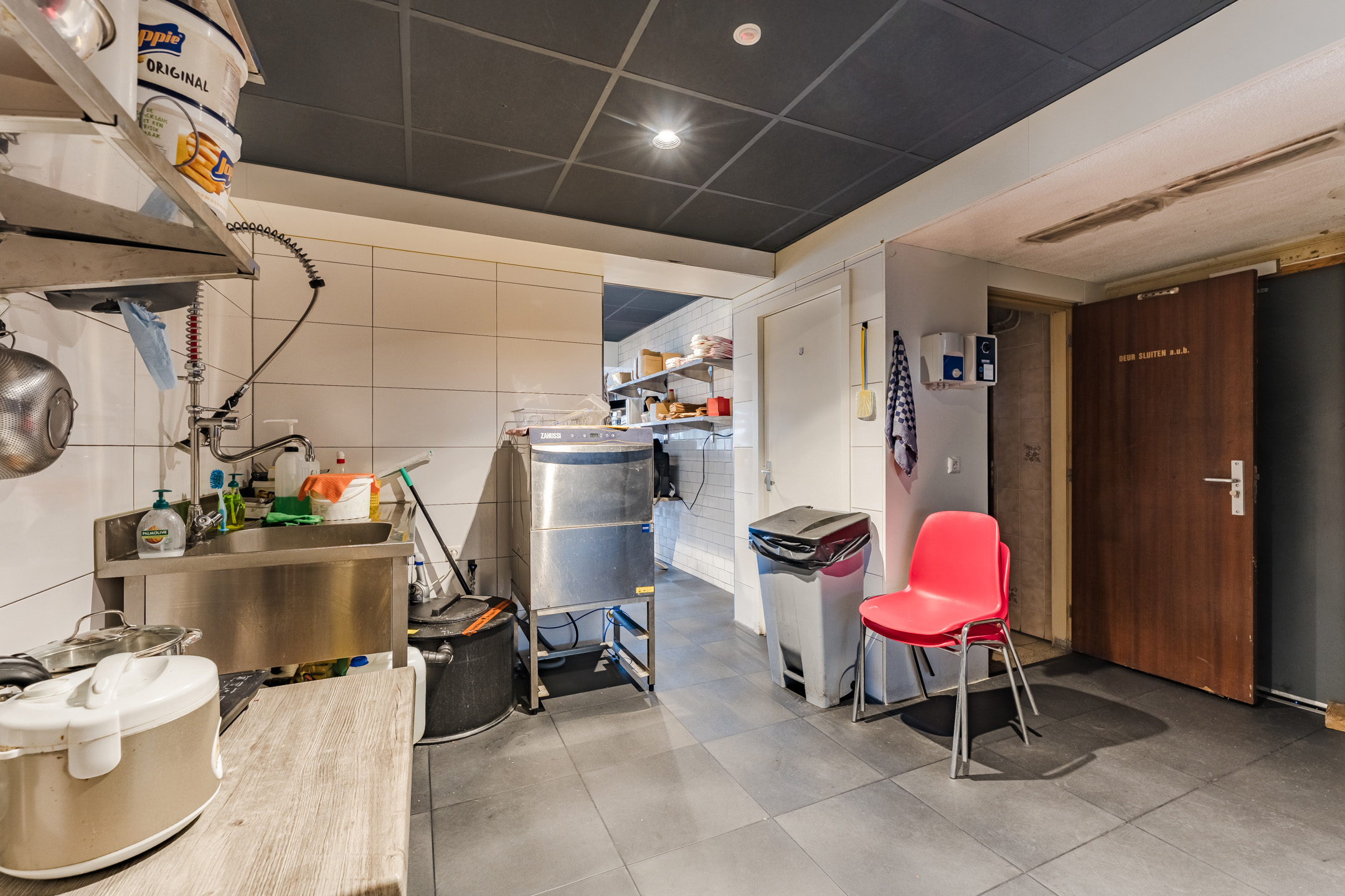 Via de entree bereikt u de brasserie. Voor u is de toonbank en de bestelzuil, links van u staan 3 tafels met elk 2 stoeltjes. Achter de toonbank bevindt zich de keuken, achter de keuken is de spoelkeuken, een toilet, opslag en (de toegang naar) de kelder.