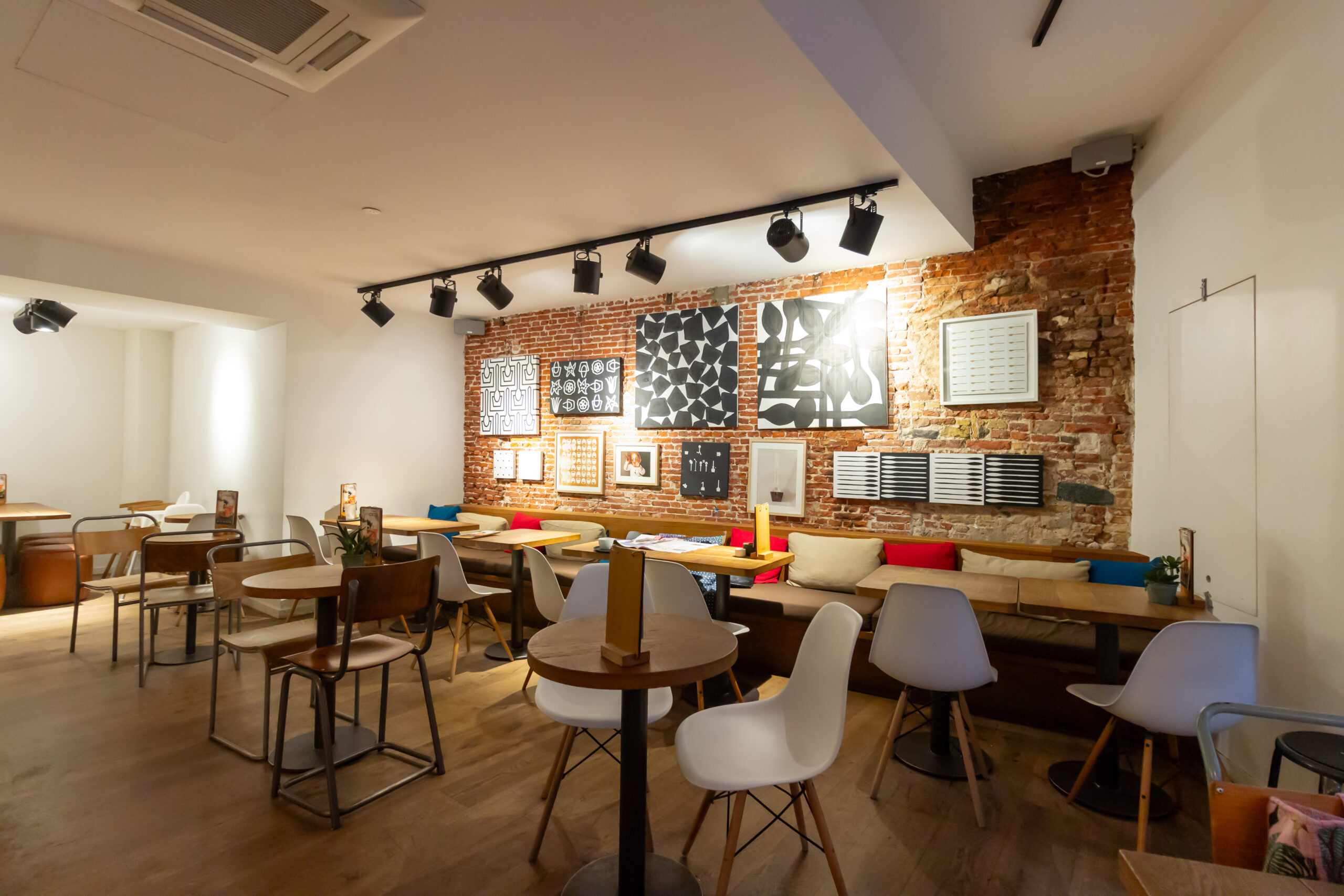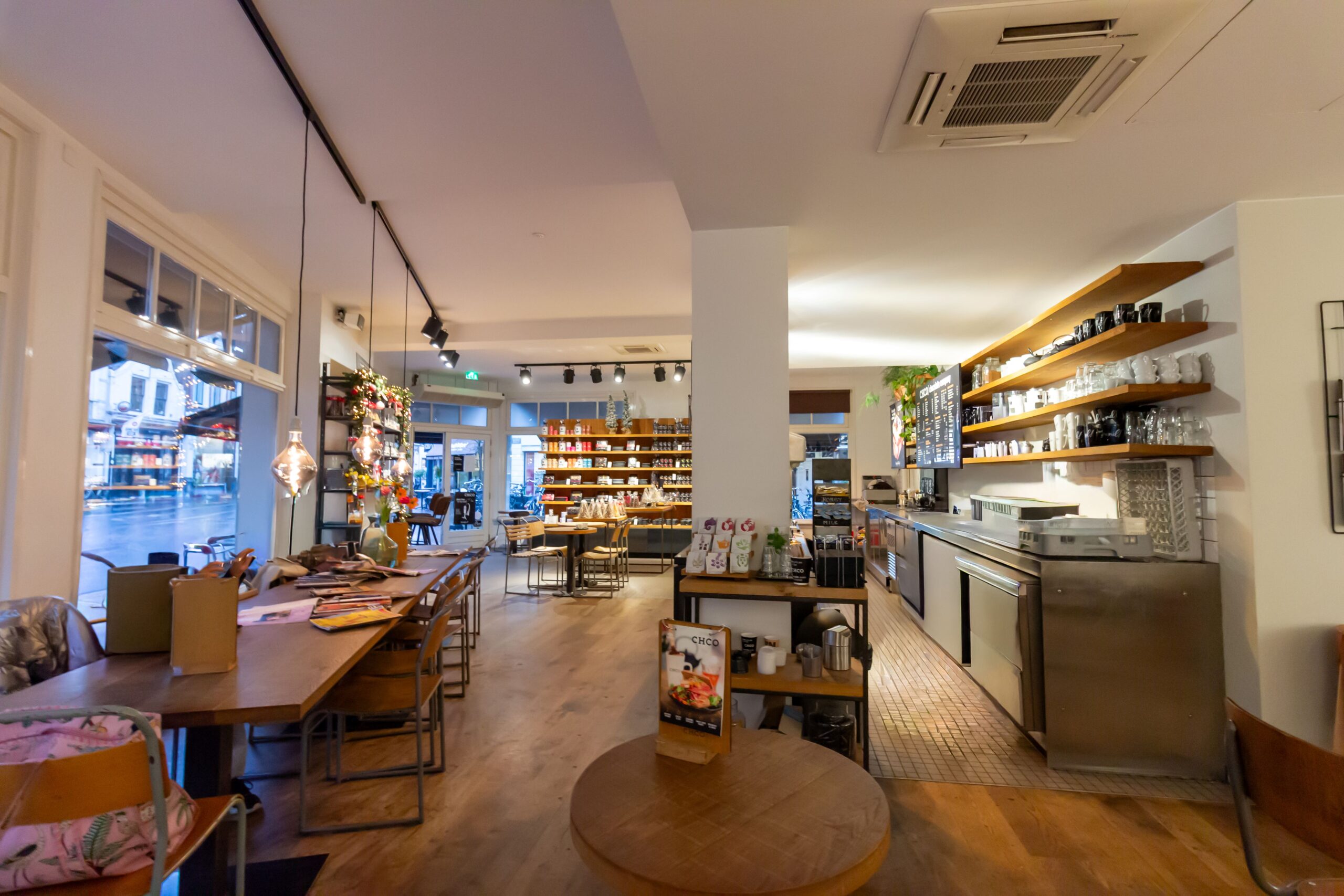 De ruimte loopt in een L-vorm, met door de gehele zaak verschillende zitplaatsen. De indeling is overzichtelijk. Aan de rechterzijde staat bij binnenkomst een lange tafel waaraan met vrienden gezellig kan worden bijgekletst onder het genot van een kop koffie.