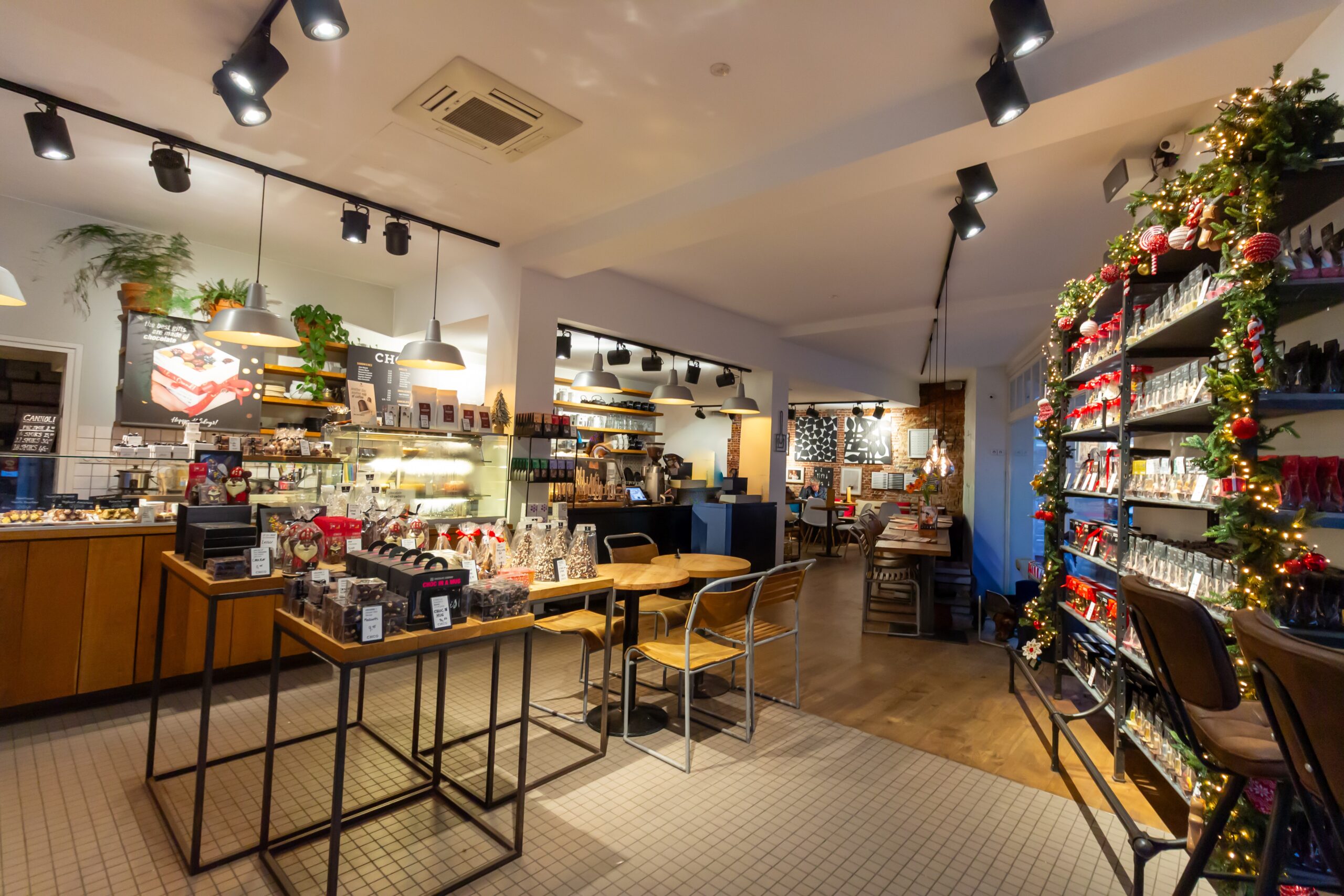 Verder in de zaak staan langs de de gehele rechterzijde tot achterin diverse tafels en stoelen, waardoor de zaak goed gevuld is. Aan de achterwand staat een lange bank met meerdere tafeltjes waaraan eveneens in een sfeervolle setting van de lekkernijen kan worden genoten. Aan de linkerzijde van deze ruimte bevinden zich de toiletgroepen.