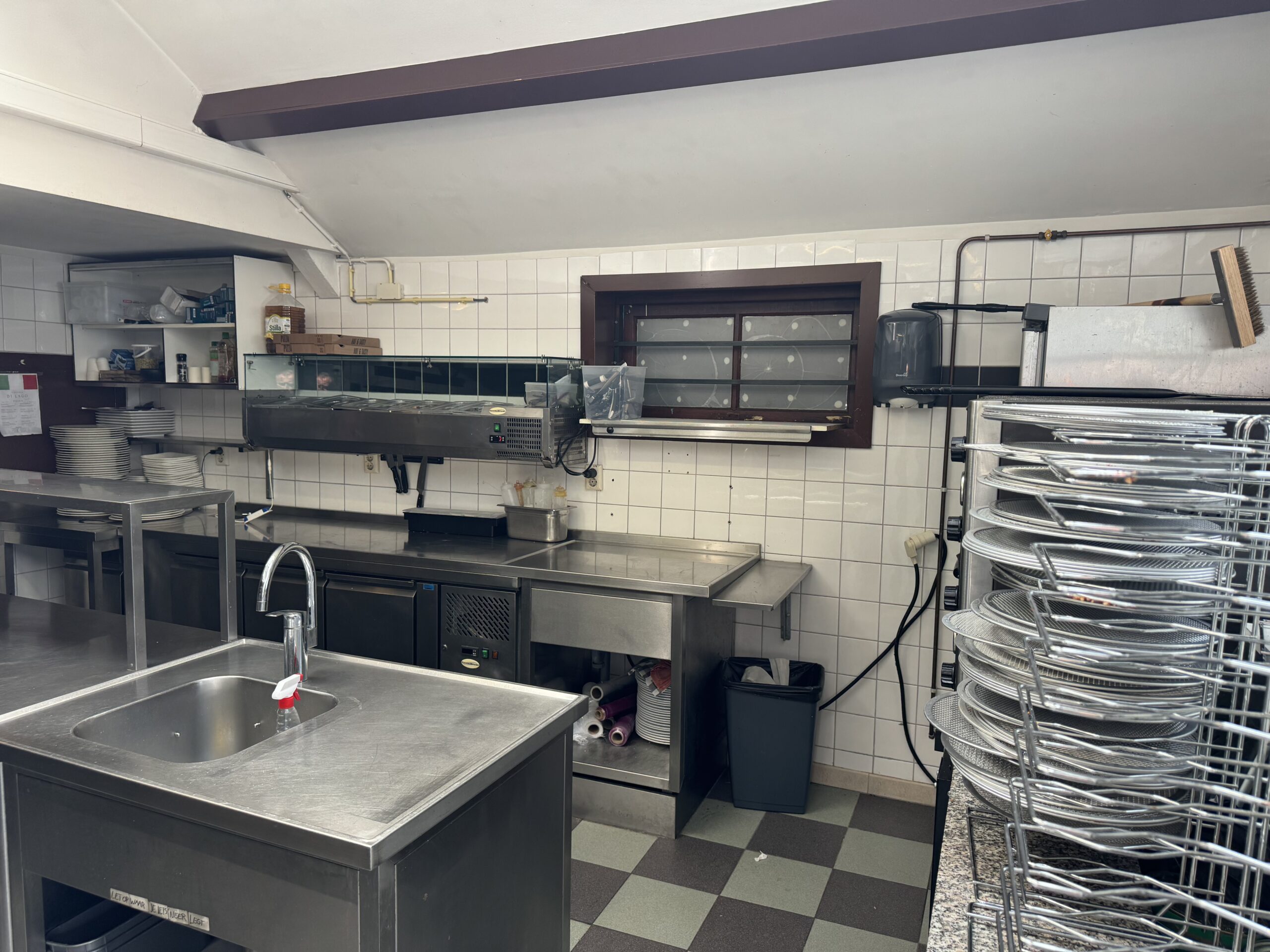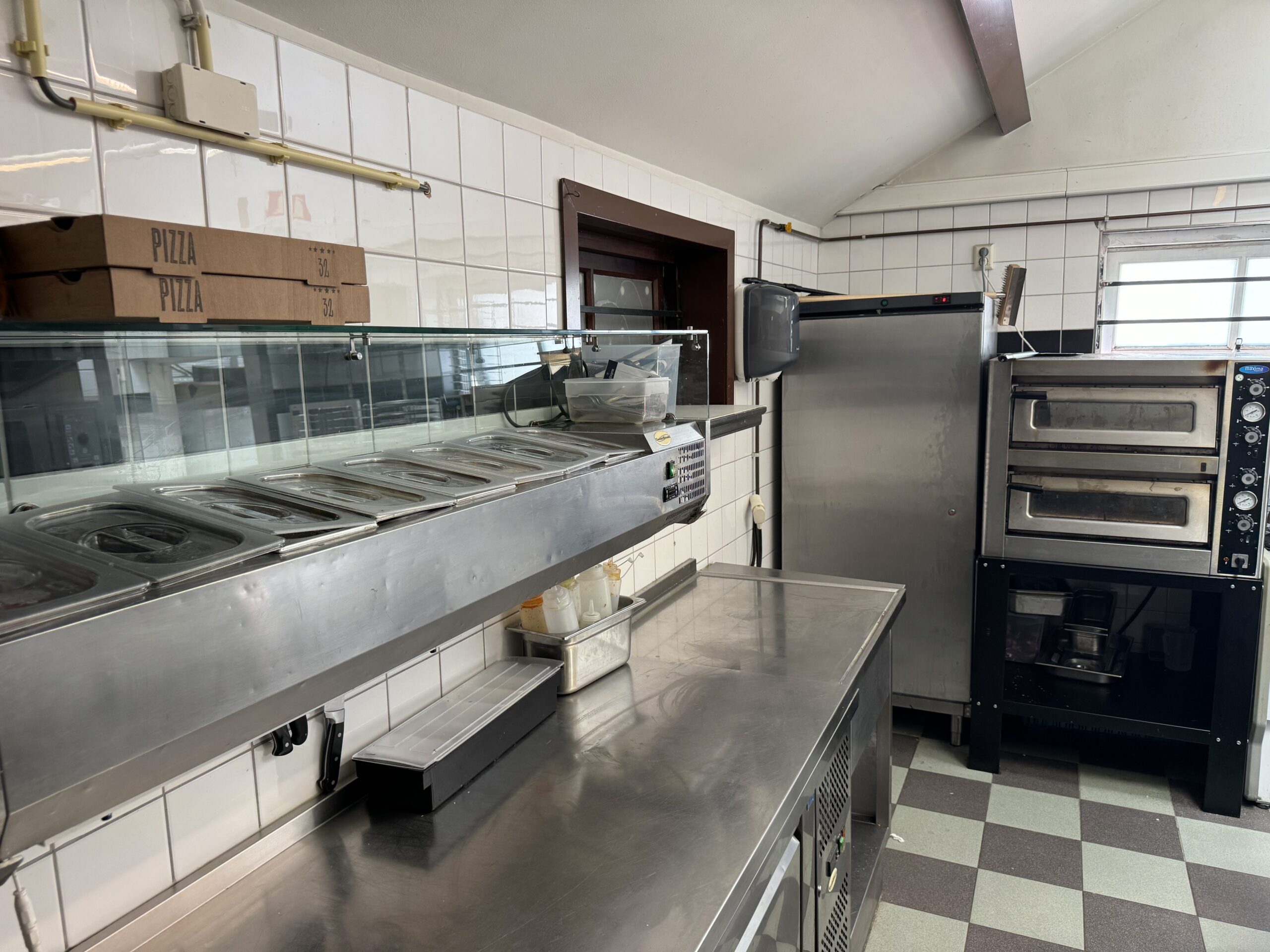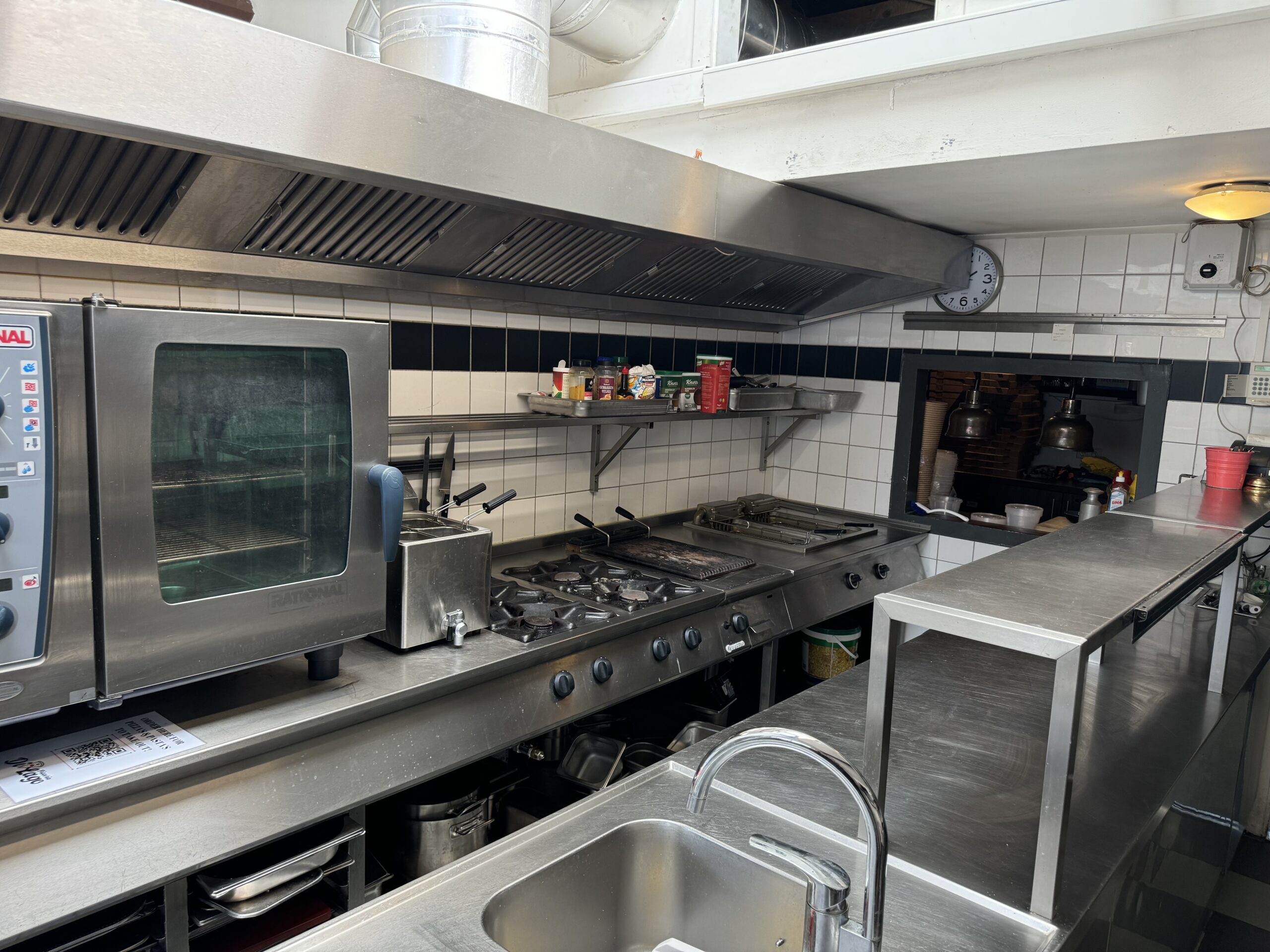 Professionele keuken voorzien van bakwand, oven, koelwerkbanken, vriezers, koelcel, pizza steenoven etc. Aparte frituurwand voor verkoop snacks met uitgifte.