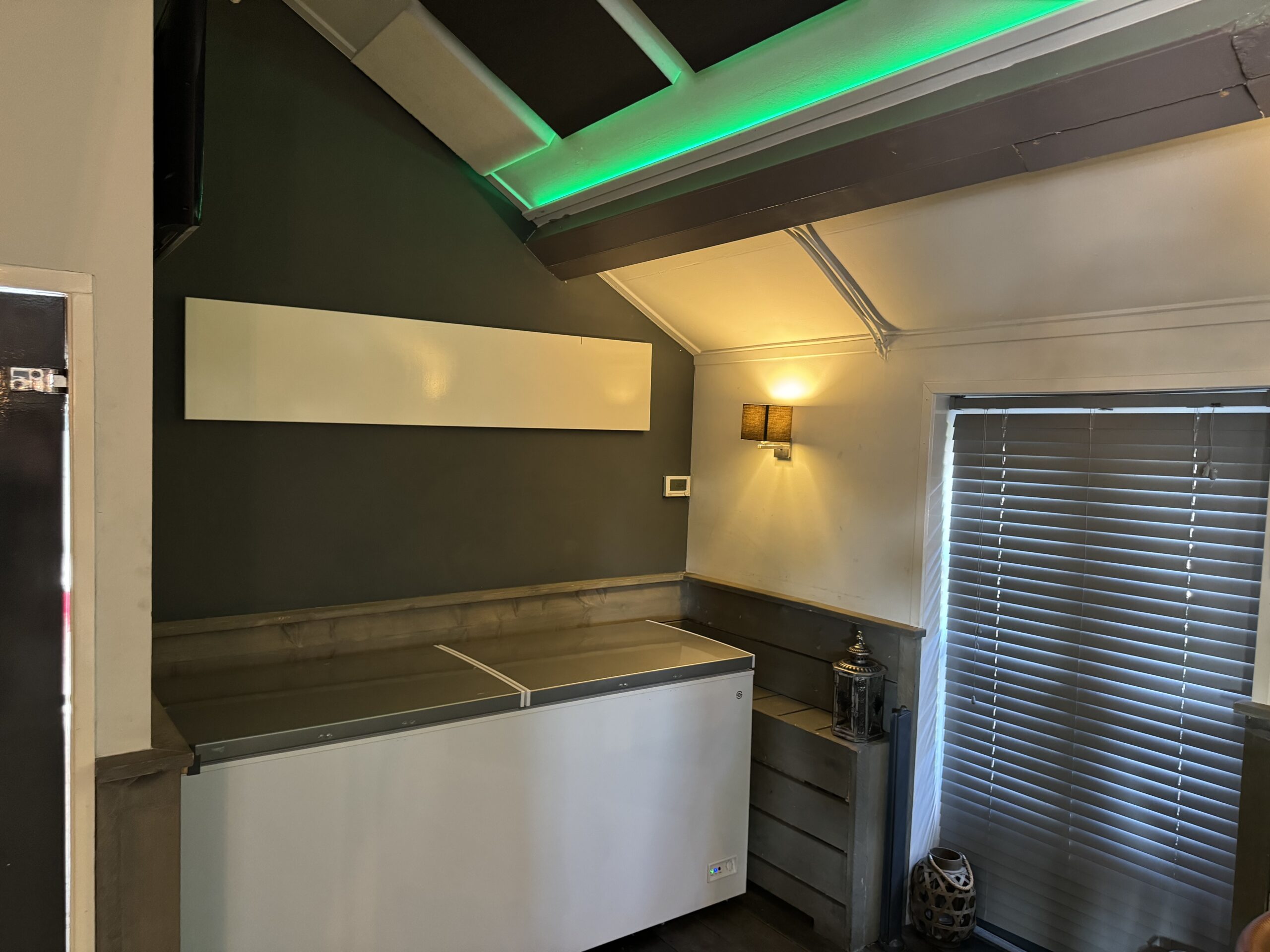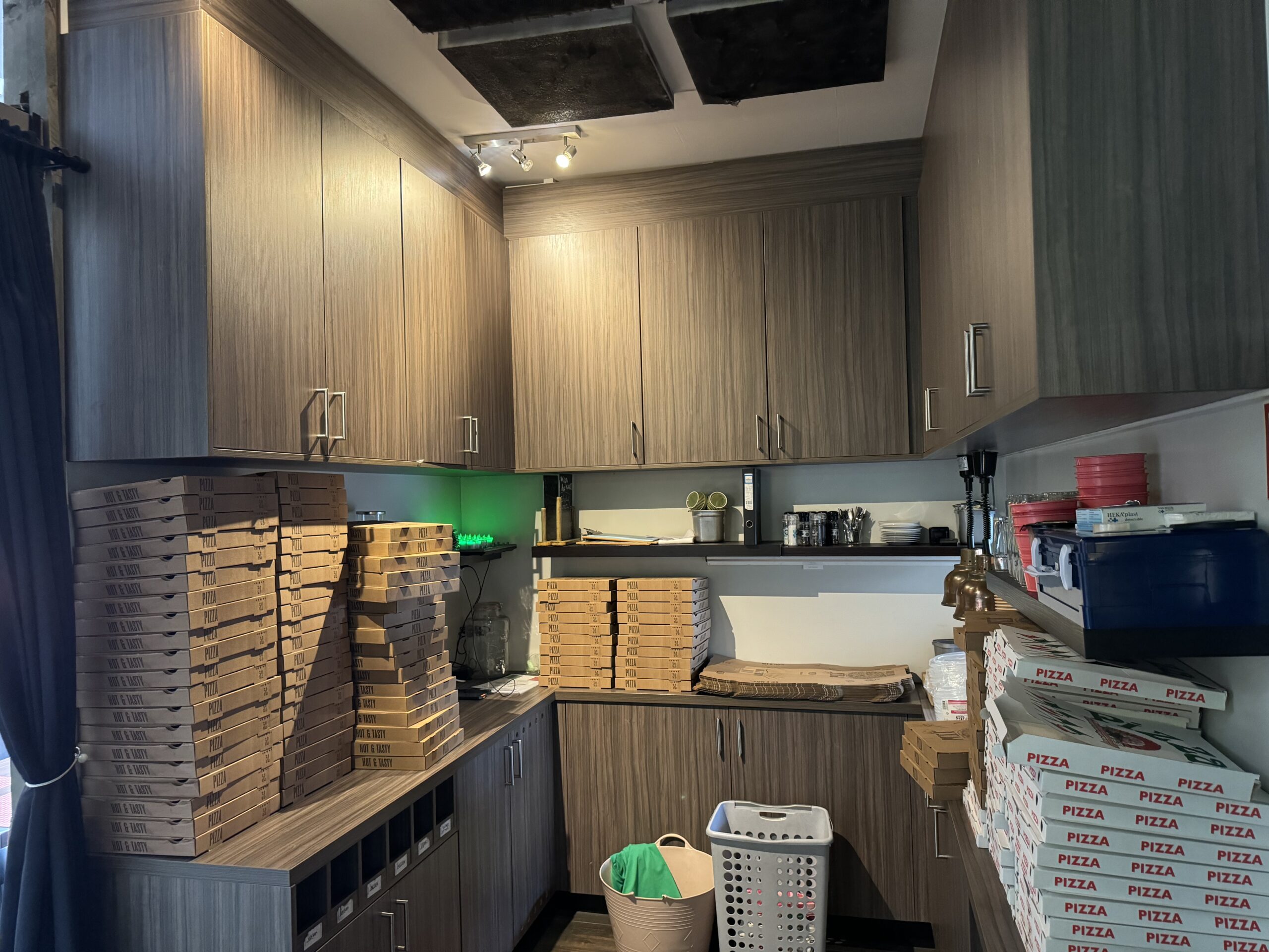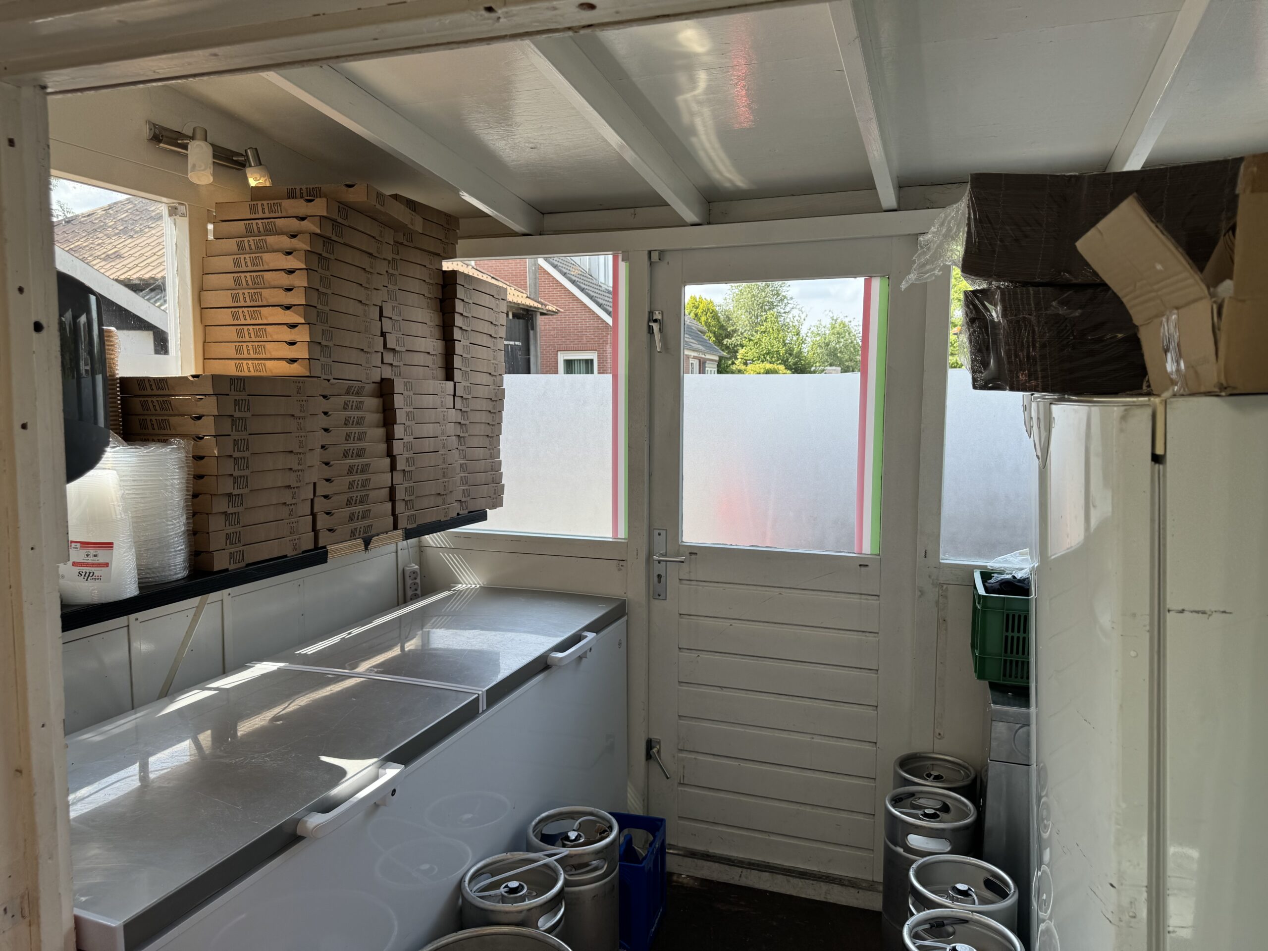 Professionele keuken voorzien van bakwand, oven, koelwerkbanken, vriezers, koelcel, pizza steenoven etc. Aparte frituurwand voor verkoop snacks met uitgifte.