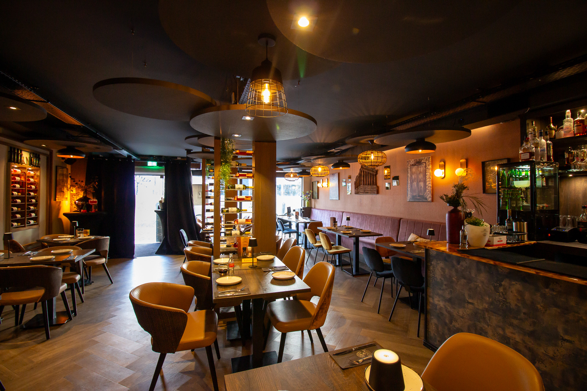 Bij binnenkomst betreedt men direct de centrale restaurant ruimte. Deze royale ruimte herbergt het grootste deel van de zitplaatsen, maar voelt dankzij de slimme indeling en ruime opzet open en
