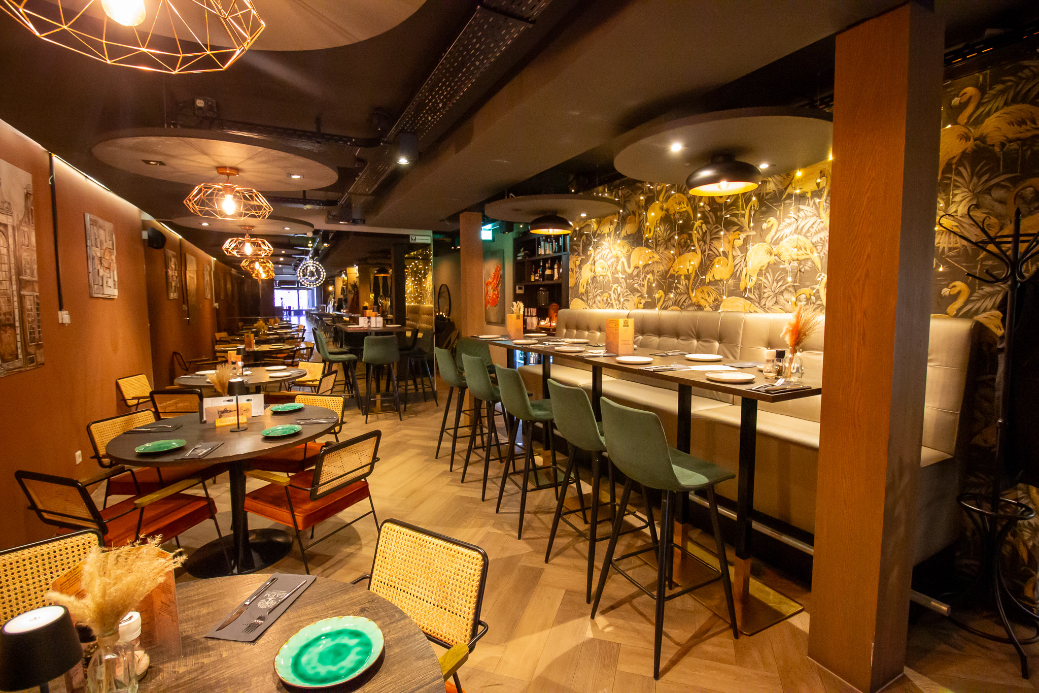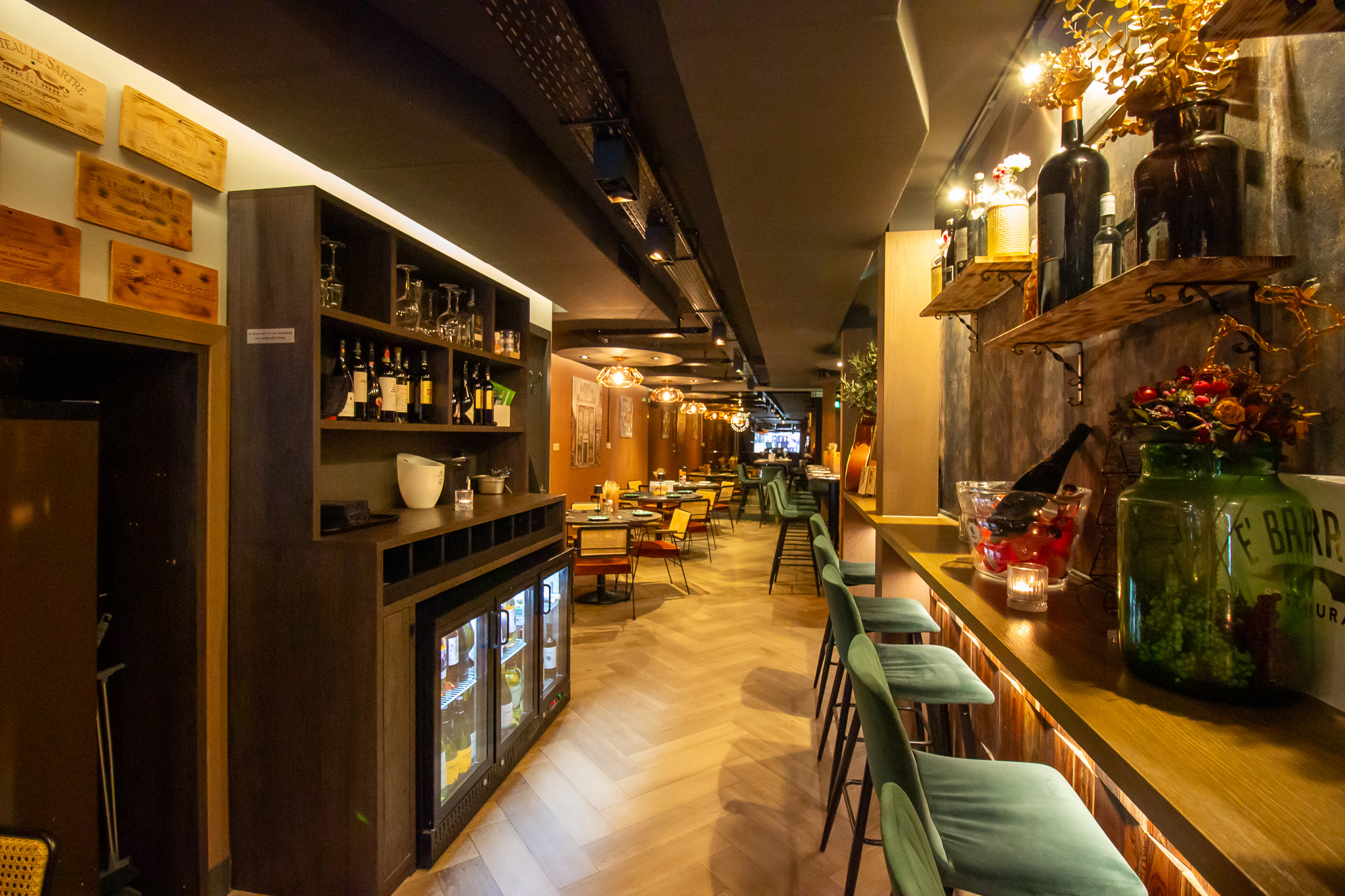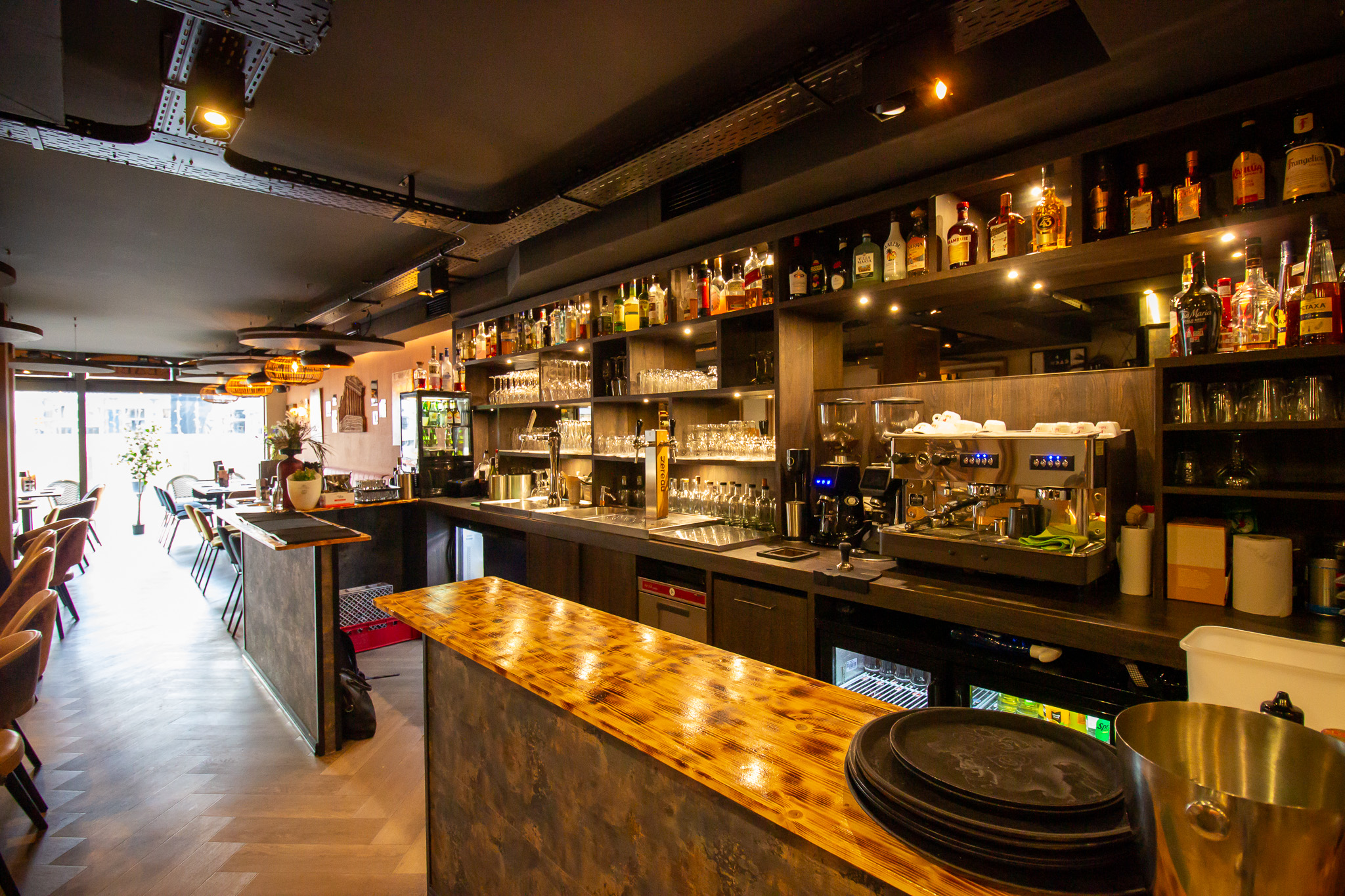 Aan de linkerzijde van de centrale ruimte bevindt zich de bar, die fungeert als verbindend element binnen het restaurant. Via de bar komt men in het tweede gedeelte van de zaak, een intiemer ingerichte ruimte met hoge tafels langs de wand en kleinere tafels voor vier personen. Dit gedeelte leent zich uitstekend voor zowel kleinere gezelschappen als informeel dineren. Verderop bevinden zich de toiletten, diverse opslagruimten en de toegangen tot de keuken, praktisch en logisch gepositioneerd voor een