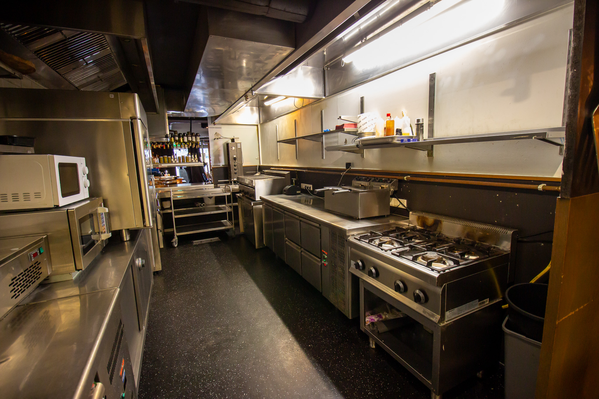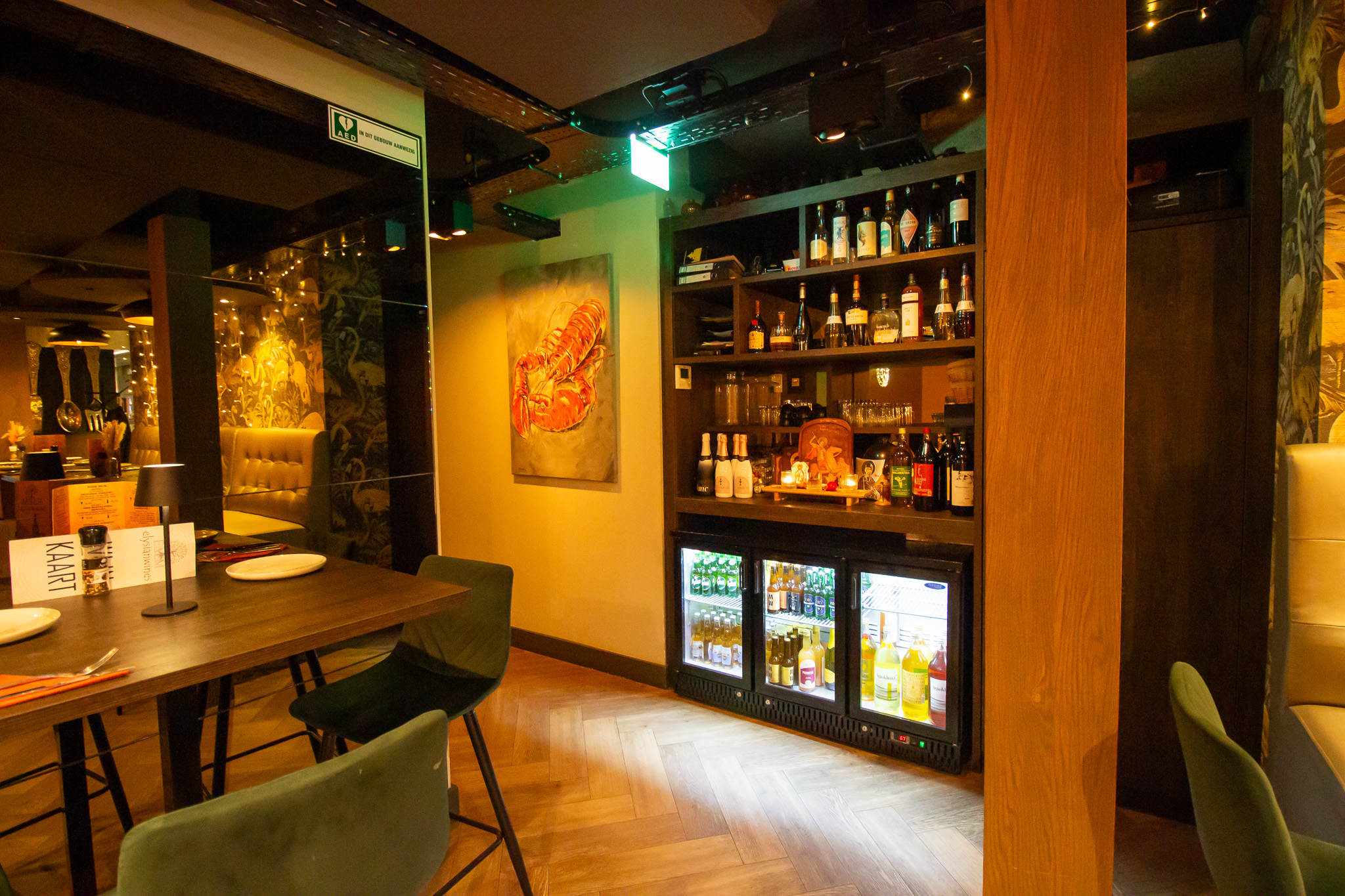 comfortabel aan. Gasten ervaren hier rust en ruimte om te genieten van de keuken en een zorgvuldig geselecteerd glas wijn, gepresenteerd in de beeldbepalende wijnrekken die het interieur extra allure geven. De op dit moment half open keuken zou gemakkelijk helemaal open kunnen worden gemaakt voor nog meer beleving.