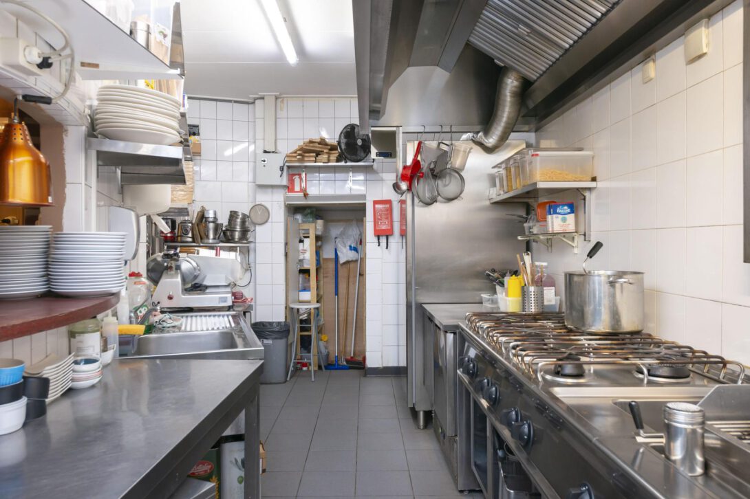 De entree is een deur in het midden van de voorzijde van het pand. Eenmaal binnen is de ruimte verdeeld in twee gedeeltes, een verkoopruimte en een open keuken.
