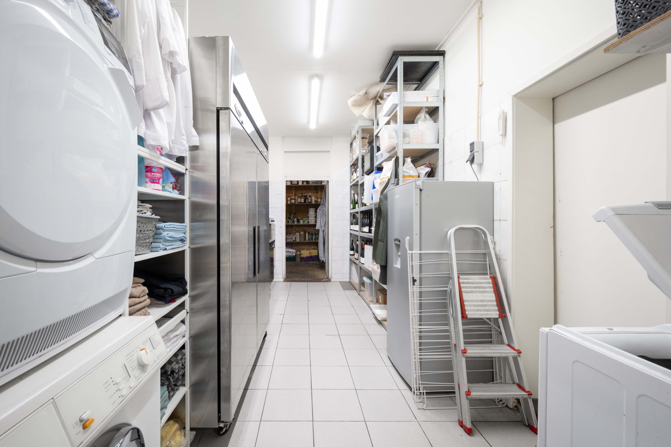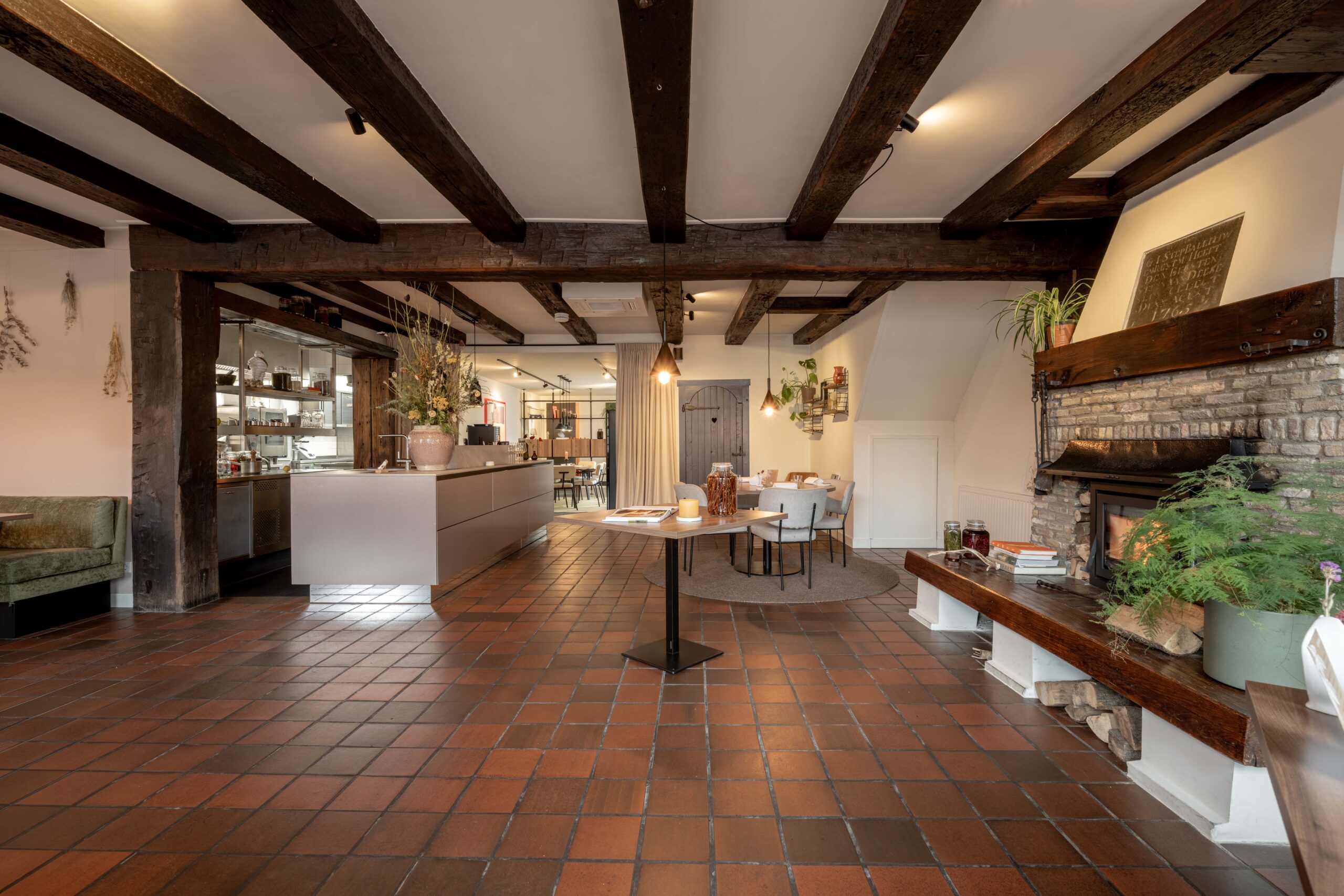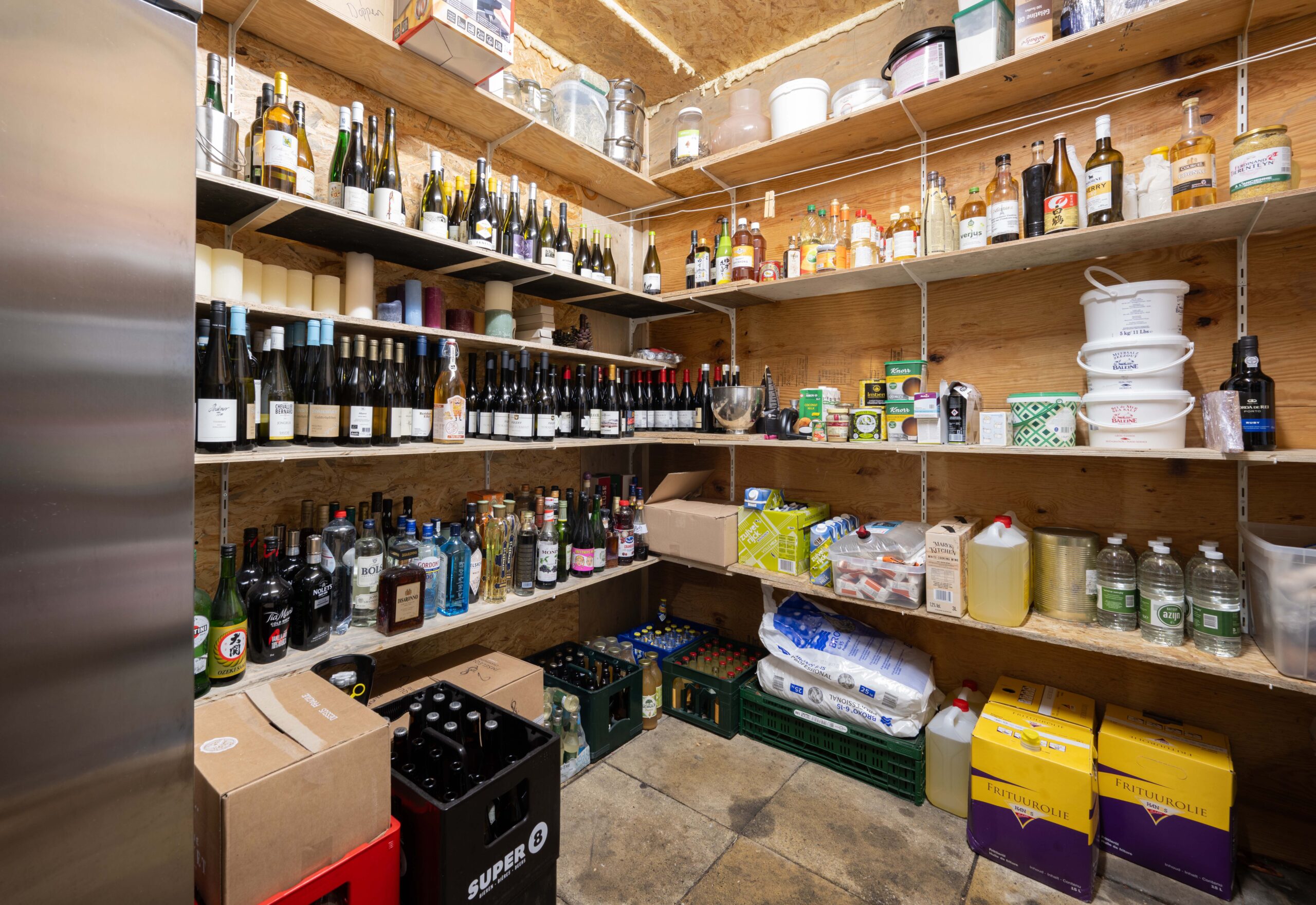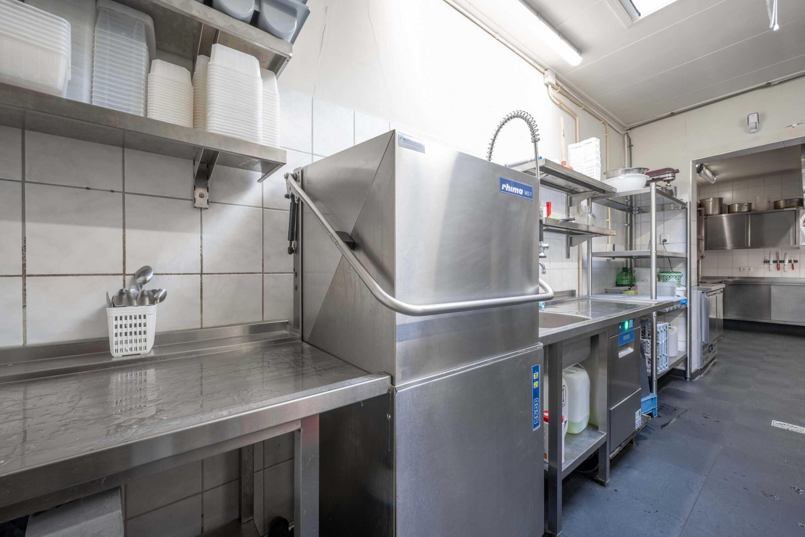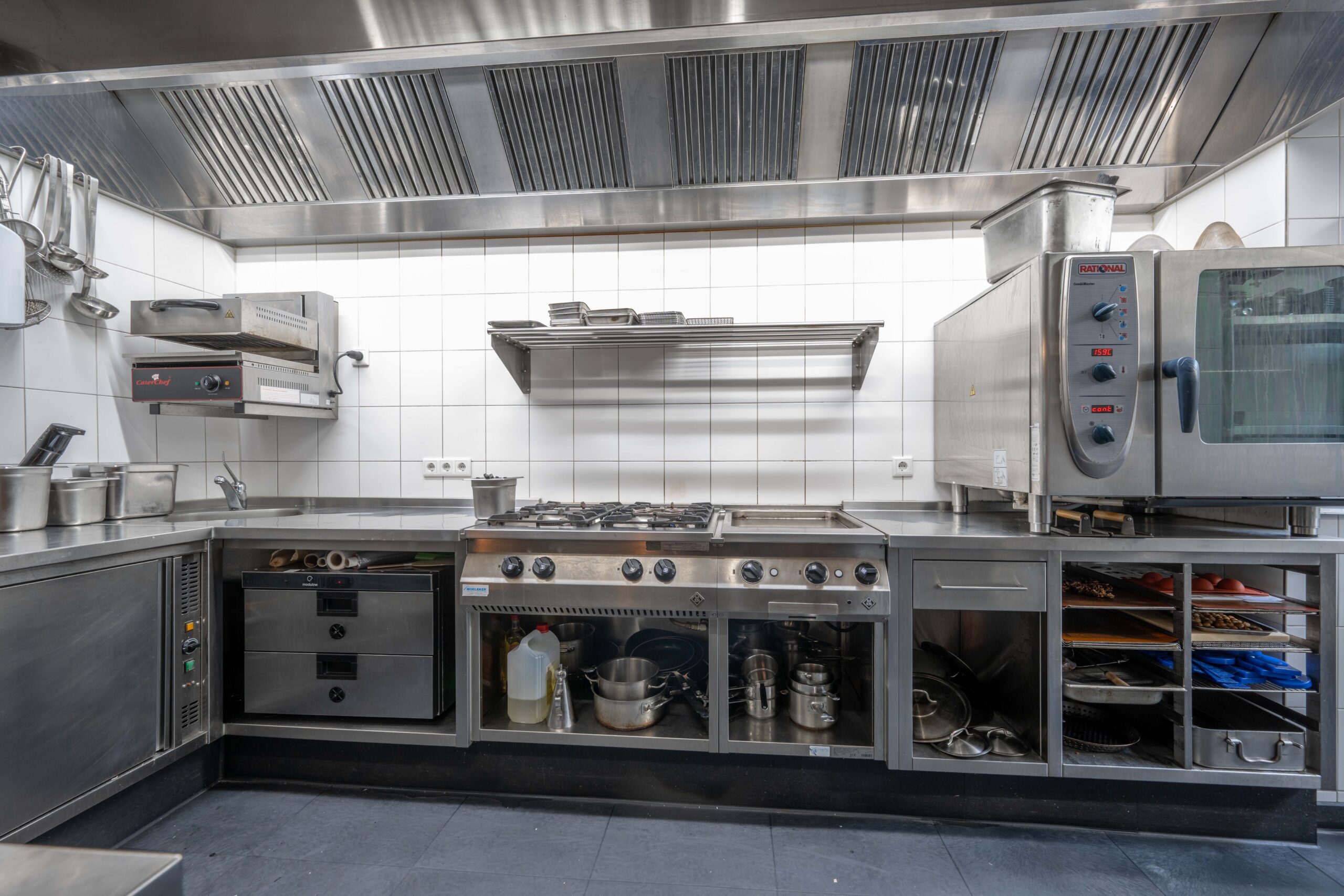 De keuken is ruim opgezet en biedt voldoende werkruimte voor een team van vijf koks. Ze bestaat uit drie ruimtes, waarvan de achterste ruimte afgescheiden is met klapdeuren. De keuken is volledig uitgerust voor een klassieke, complete restaurantkaart. Zo vind je er onder andere vier koelwerkbanken, een 4-pits gasfornuis, Rational combisteamer, salamander, bakplaat/plancha, dubbele koeling, enkeldeurs vrieskast, warmtebrug met lampen, bordenwarmer, glazenwasmachine met osmose en een professionele vaatwasser met waterontharder. Achterin is een aparte ruimte voor voorraad, met tevens een aansluiting voor een wasmachine.