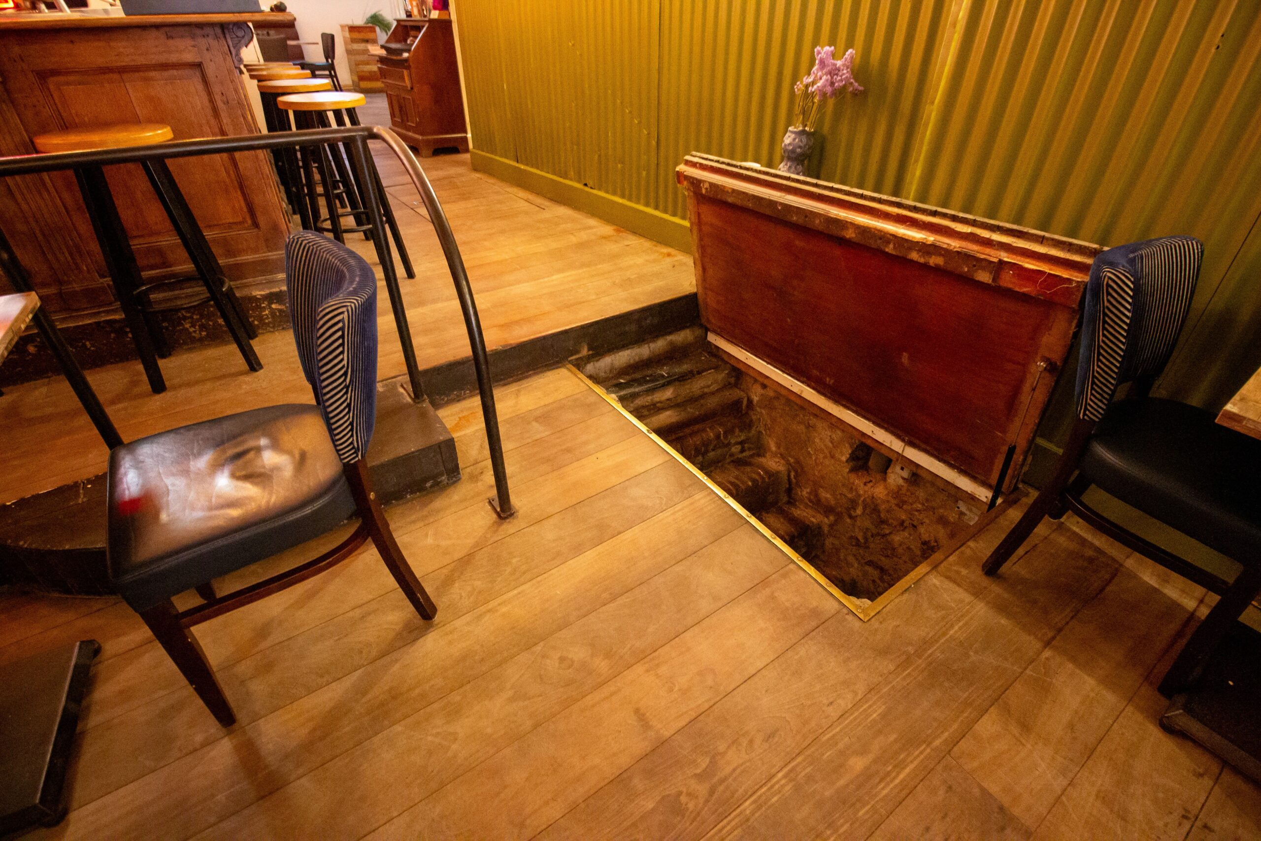 Na het tweede opstapje bevindt zich aan de linkerzijde van het restaurant de logisch geplaatste bar met een tapkraan, koffiezetautomaat, spoelbak en een counter. Voor de bar zit ook een luik in de vloer die leidt naar de kelder waar nog ca. 25 m2 aan opslagruimte zit.