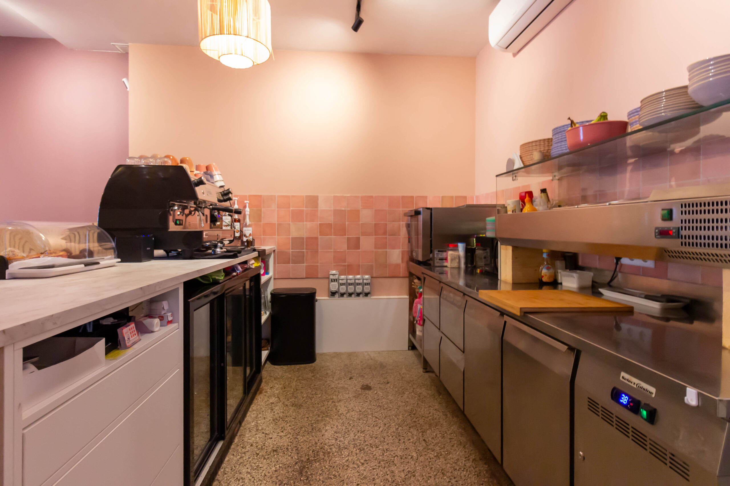 Achter in de zaak bevindt de toonbank voorzien van professioneel horeca inventaris, zoals een koel-werkbank, koffiemachine en oven. Aan de rechterzijde zit een doorgang naar de productieruimte achter en het toilet.