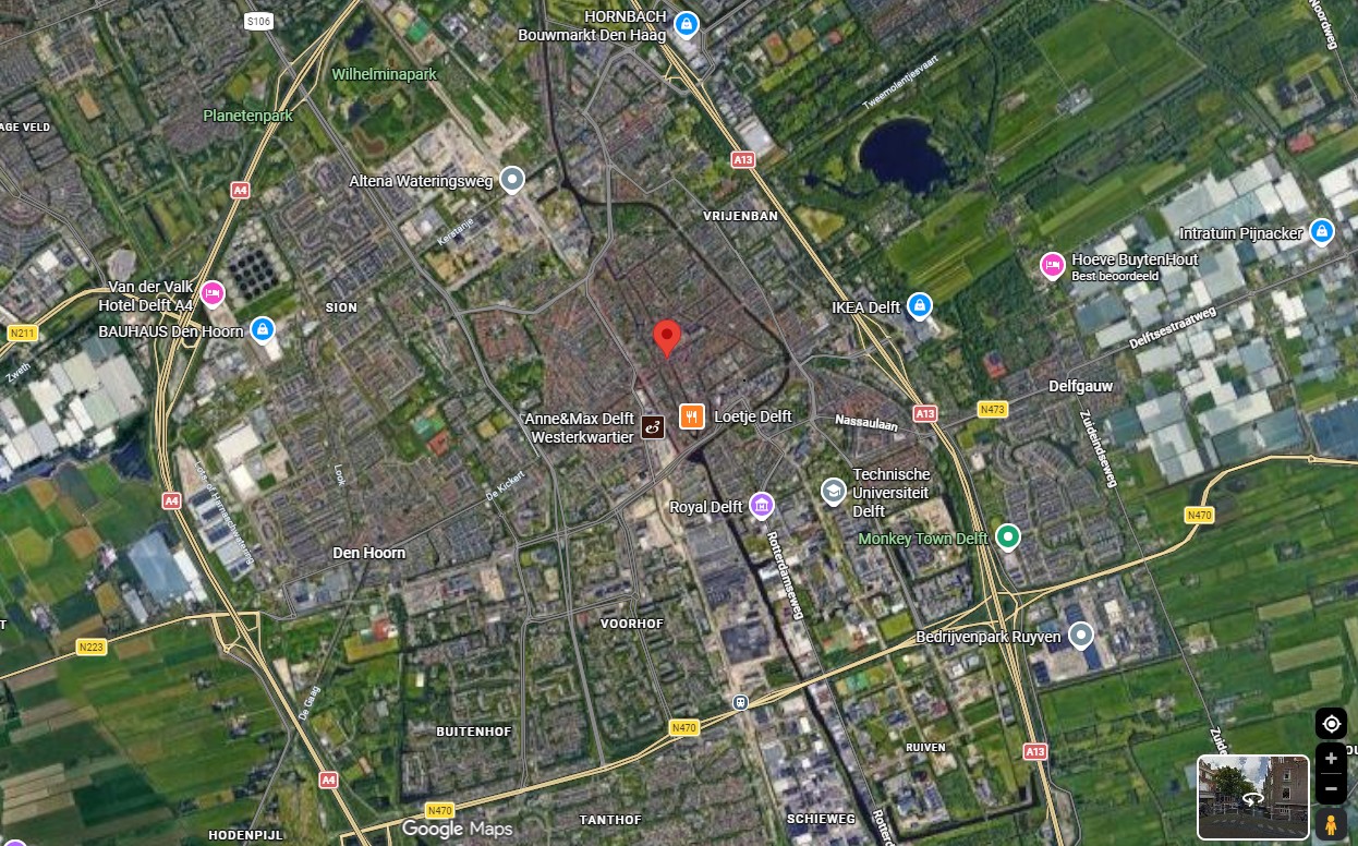Dit restaurant is gevestigd op de Wijnhaven één van de historische grachten in het centrum van Delft. In de direct omgeving zijn meerdere horecabedrijven, galeries, boetiekjes, musea en het grote marktplein. De vele toeristen en studenten weten deze locatie goed te vinden. De hele binnenstad van Delft is een autovrije zone. Aan de rand van het centrum zijn meerdere parkeergarages op loopafstand van het restaurant.